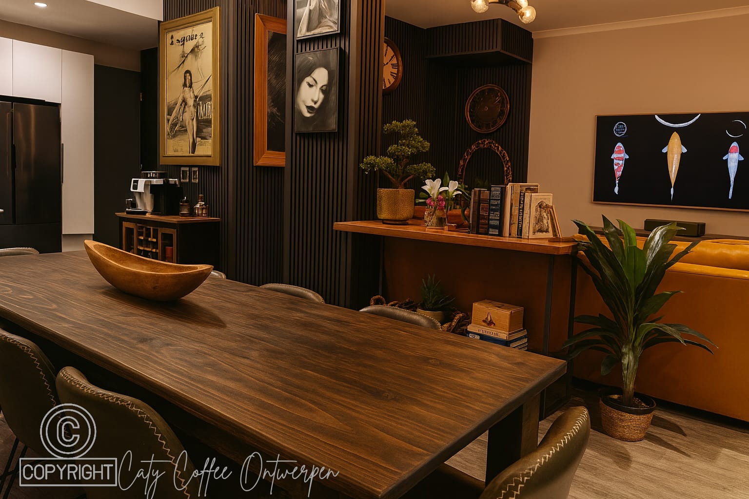 The interior features an inviting open-plan layout, seamlessly connecting a contemporary kitchen and a stylish dining area. The kitchen is equipped with two-tone cabinetry, a dark tile backsplash, and modern appliances, complemented by ample storage and a wine rack. Hardwood flooring flows throughout, enhancing the cohesive design, while the dining area showcases a rustic wooden table and decorative mirrors, leading into a comfortable lounge with a wall-mounted TV and eclectic decor.