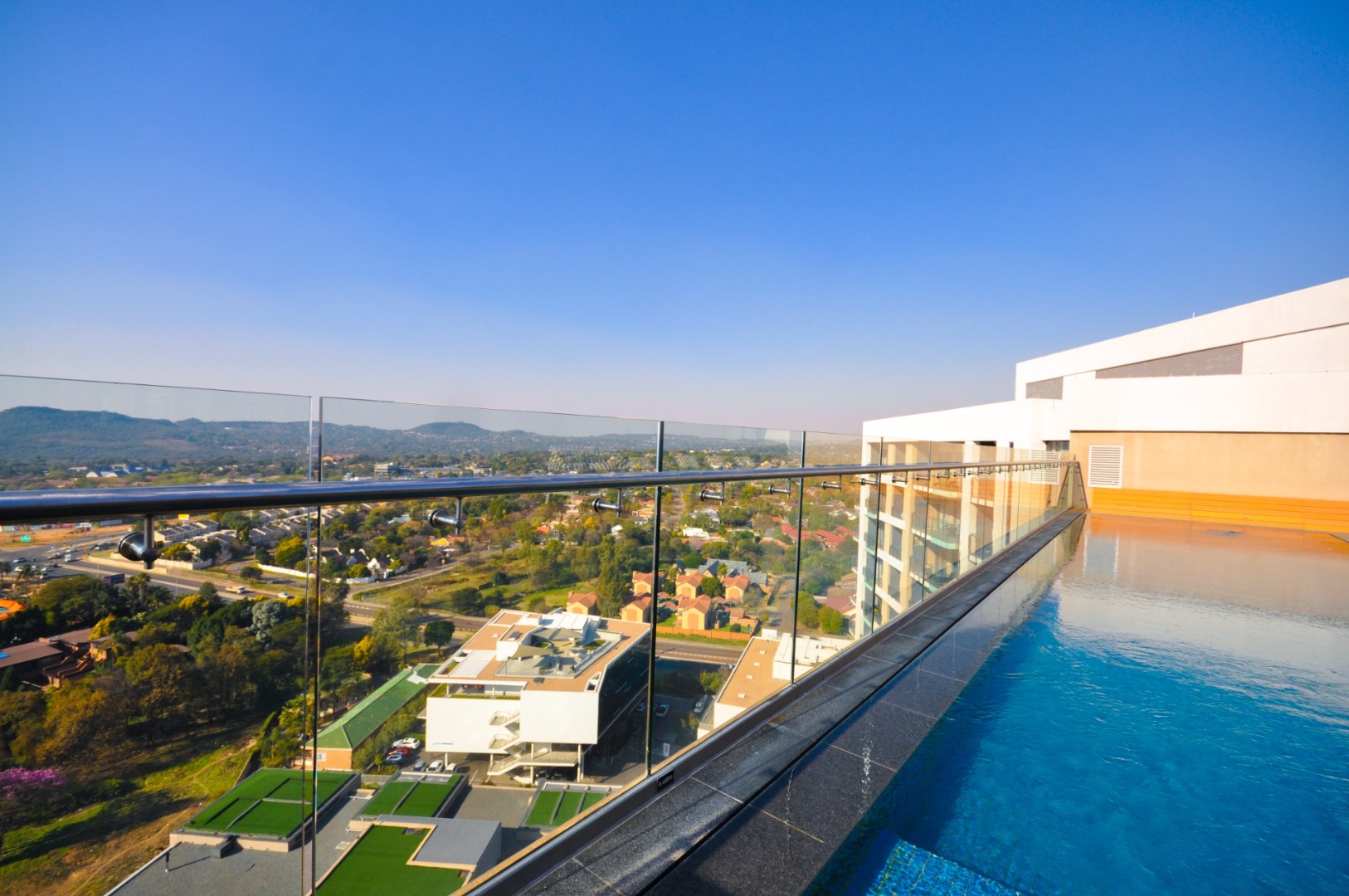 Discover sophisticated urban living in this modern 97 sqm apartment located in a sleek high-rise complex in Menlyn, Pretoria. The property boasts contemporary architecture with balconies and well-maintained landscaped gardens, offering an attractive kerb appeal in a vibrant metropolitan setting.