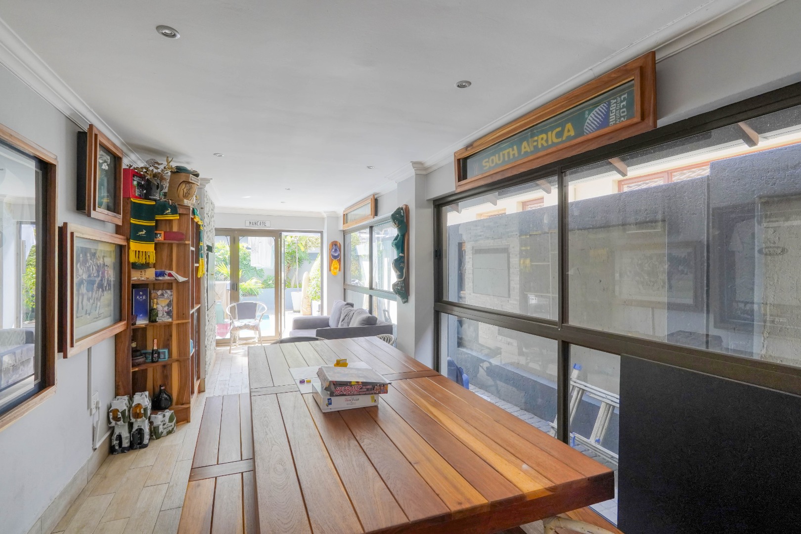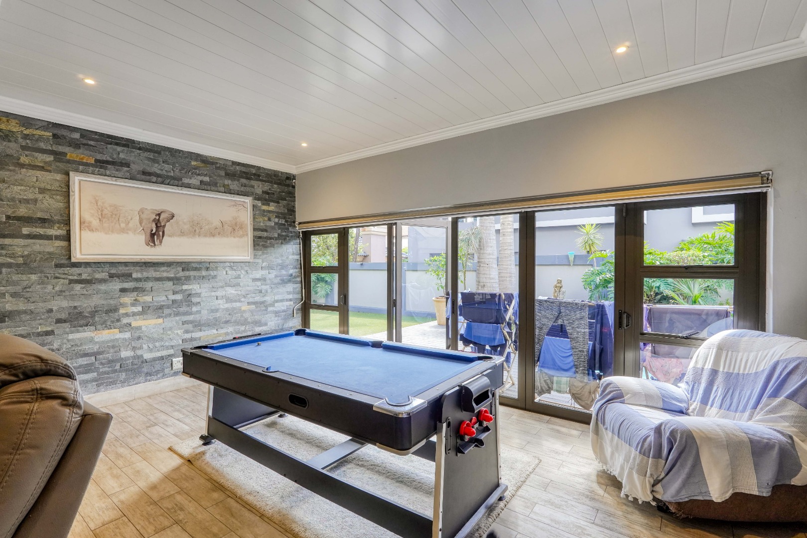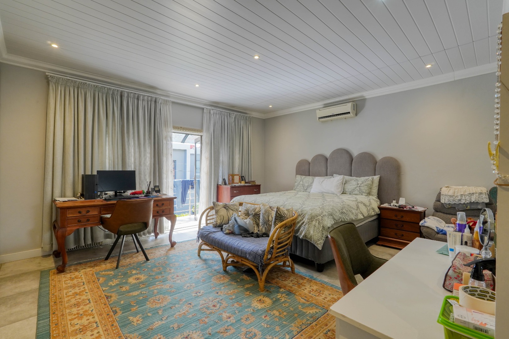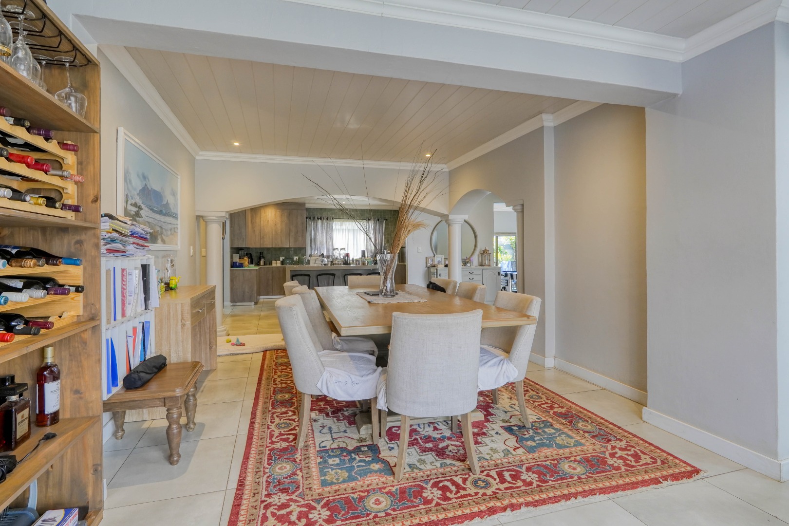 A braai room with a built in braai forms part of the living areas and opens out to the garden. This space connects to a second, smaller lounge which also links back to the entrance hall, creating an additional area for relaxing or entertaining. Outside, the private garden includes a heated swimming pool with a wooden deck and a boma, adding to the outdoor lifestyle.