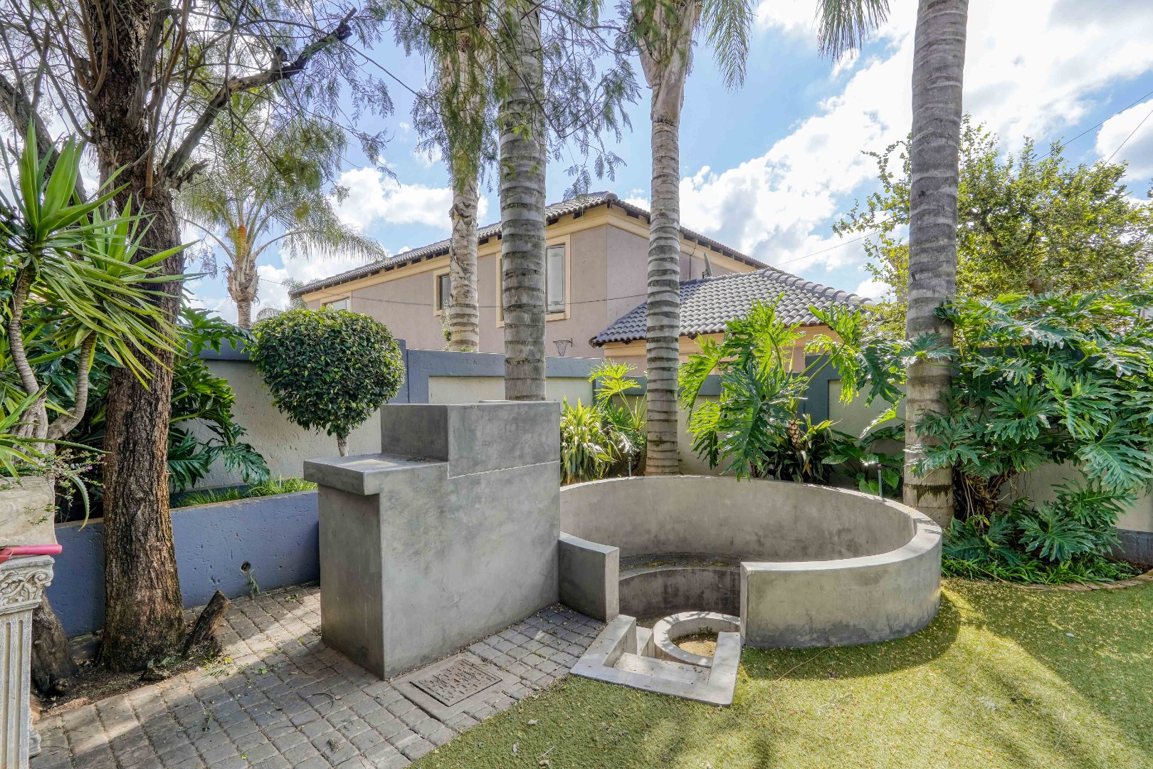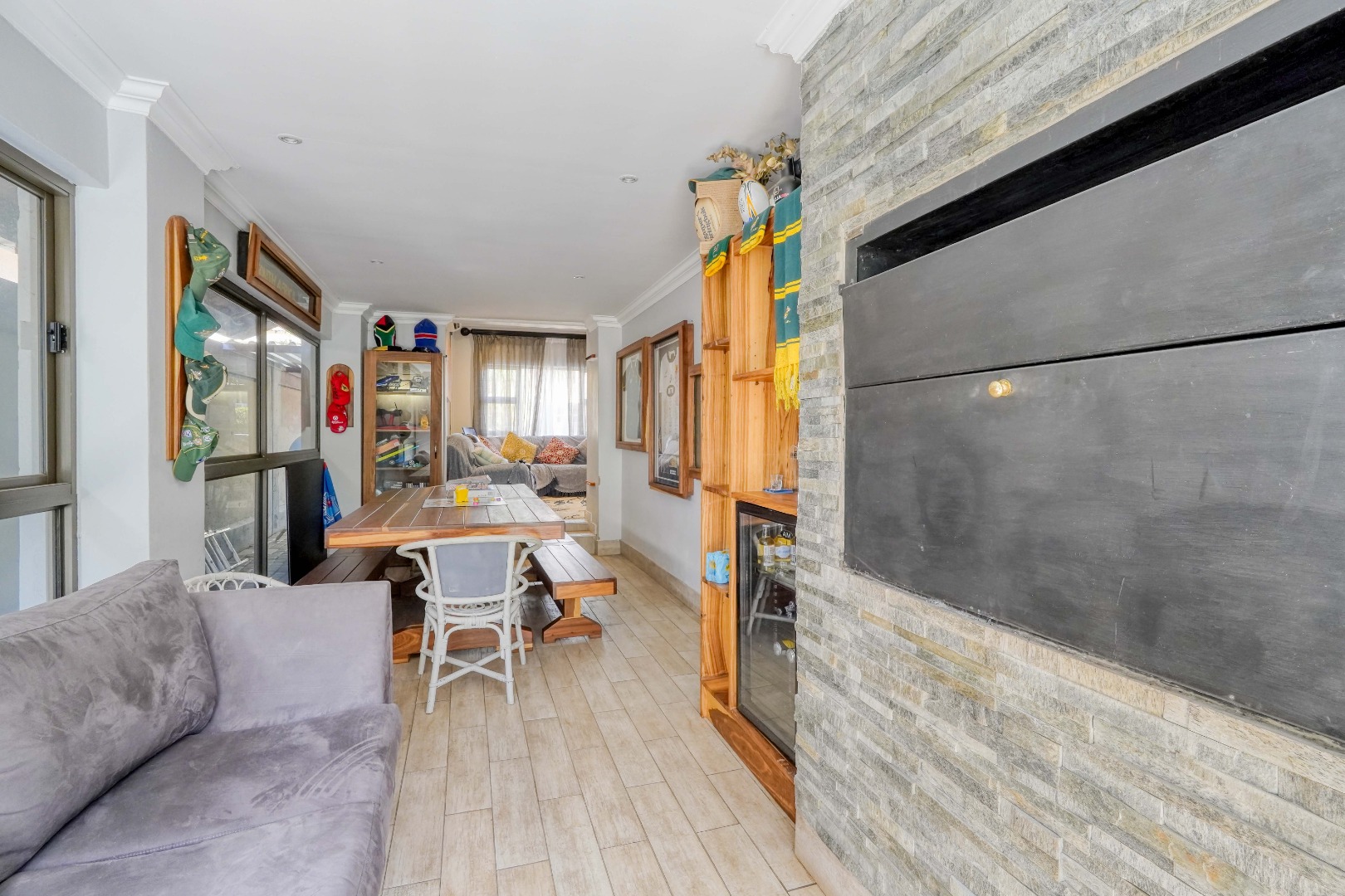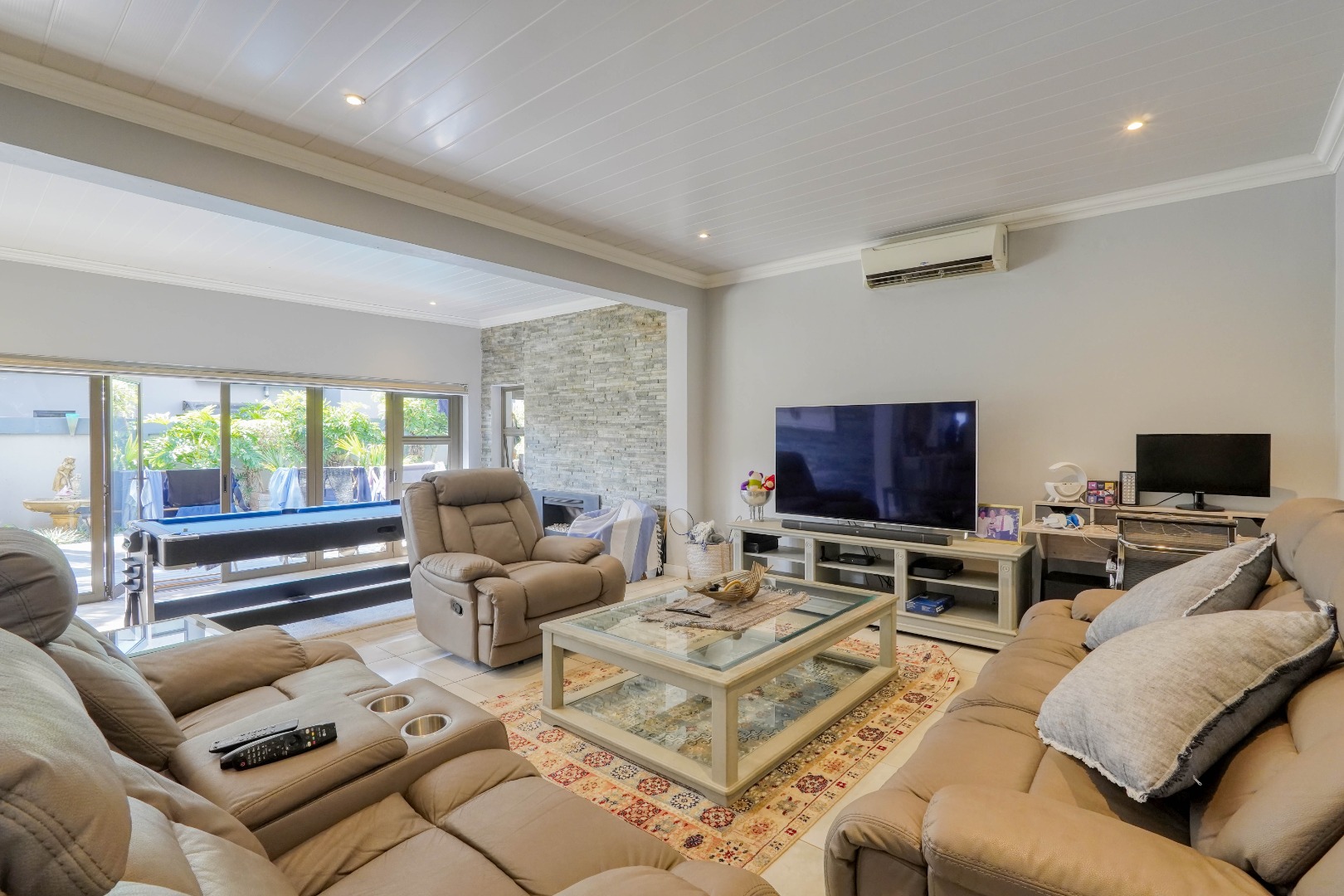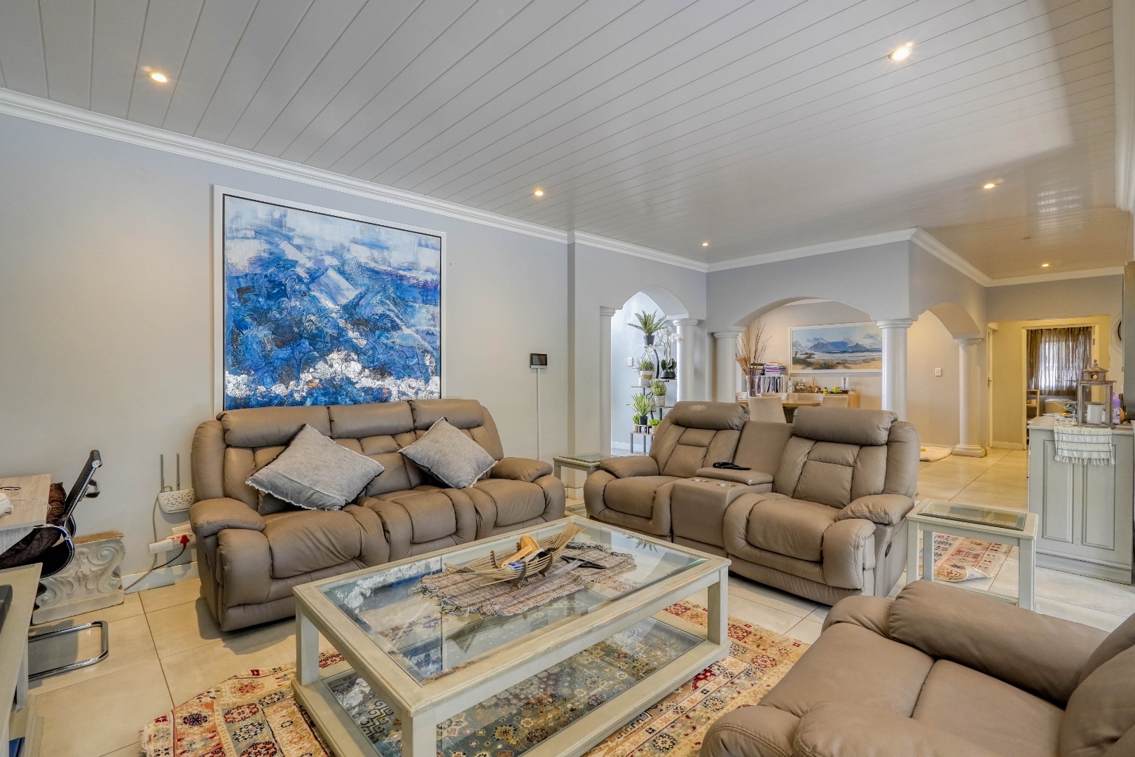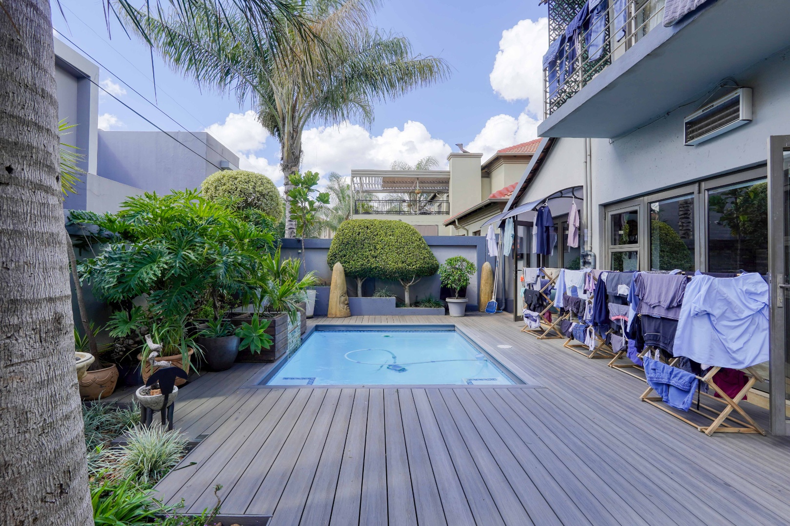 A braai room with a built in braai forms part of the living areas and opens out to the garden. This space connects to a second, smaller lounge which also links back to the entrance hall, creating an additional area for relaxing or entertaining. Outside, the private garden includes a heated swimming pool with a wooden deck and a boma, adding to the outdoor lifestyle.