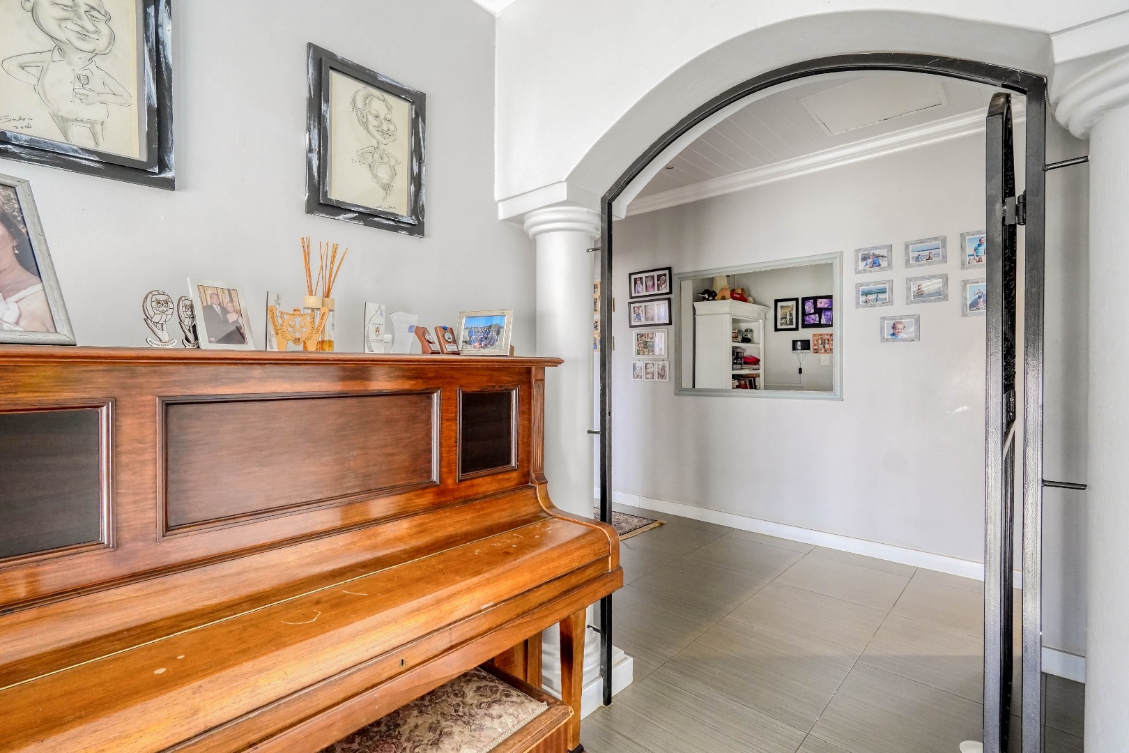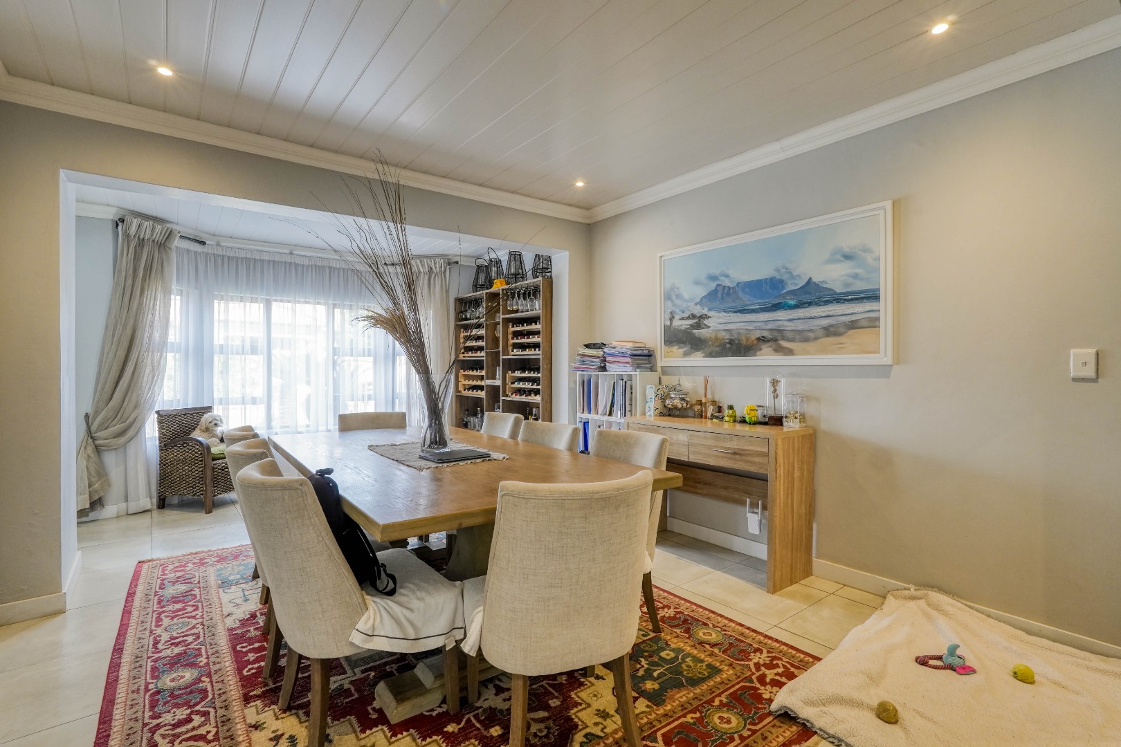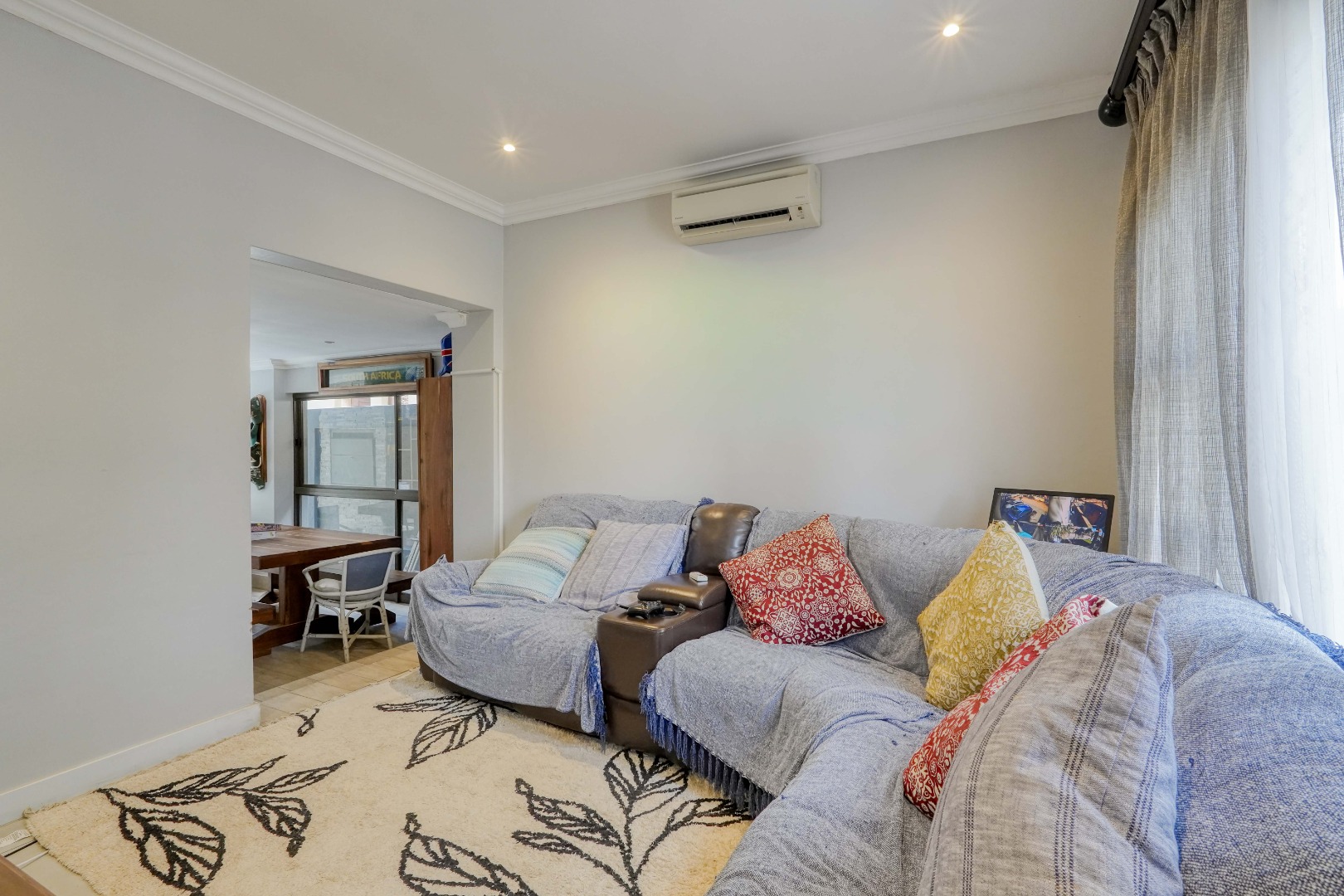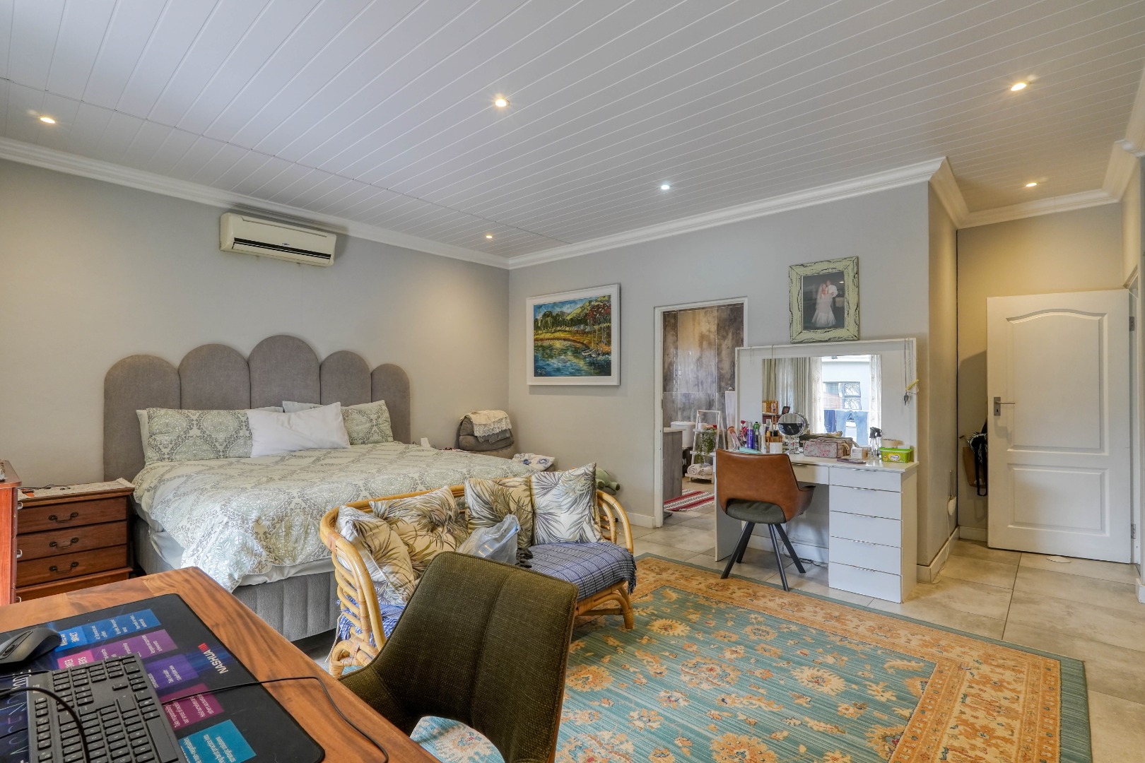 A braai room with a built in braai forms part of the living areas and opens out to the garden. This space connects to a second, smaller lounge which also links back to the entrance hall, creating an additional area for relaxing or entertaining. Outside, the private garden includes a heated swimming pool with a wooden deck and a boma, adding to the outdoor lifestyle.