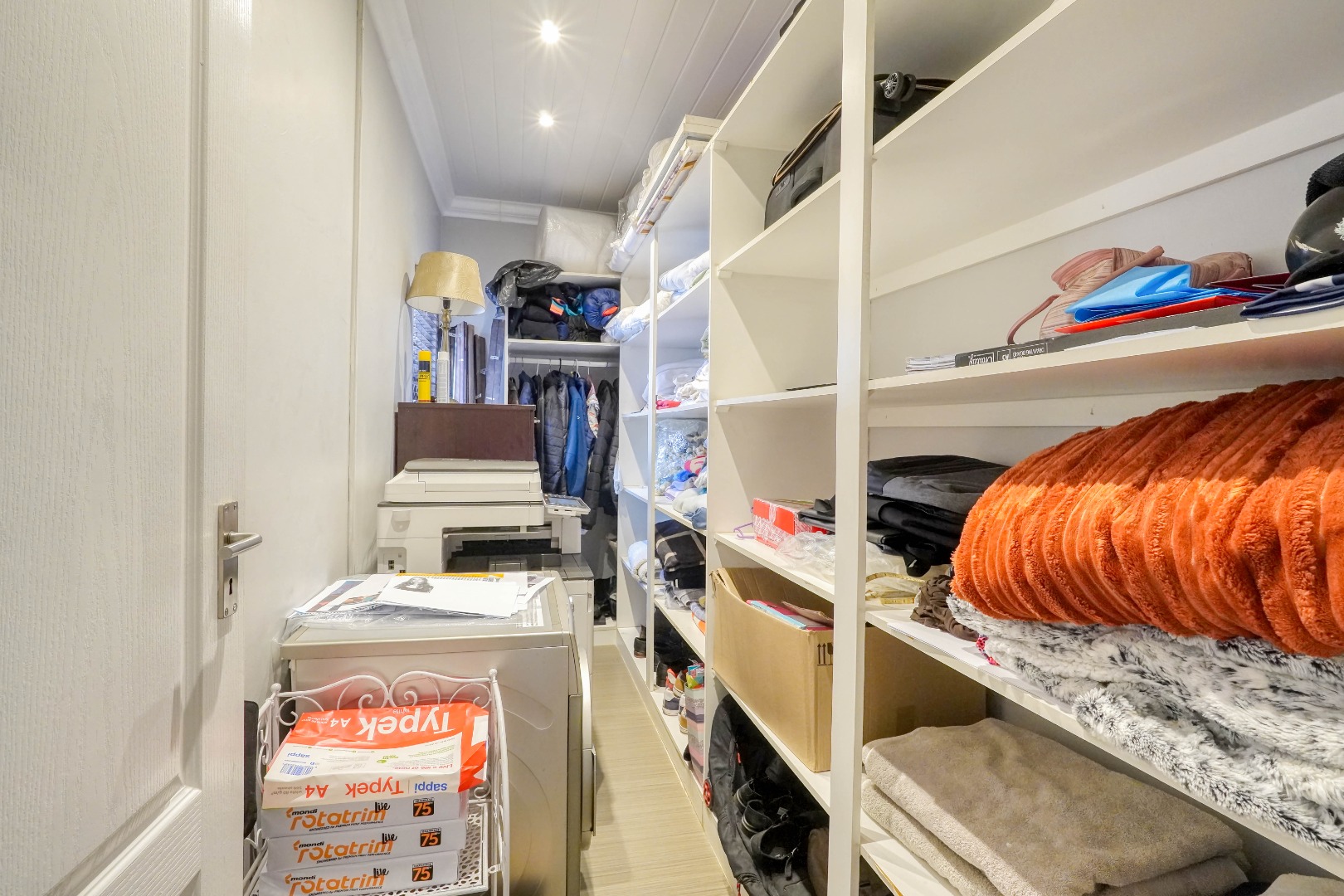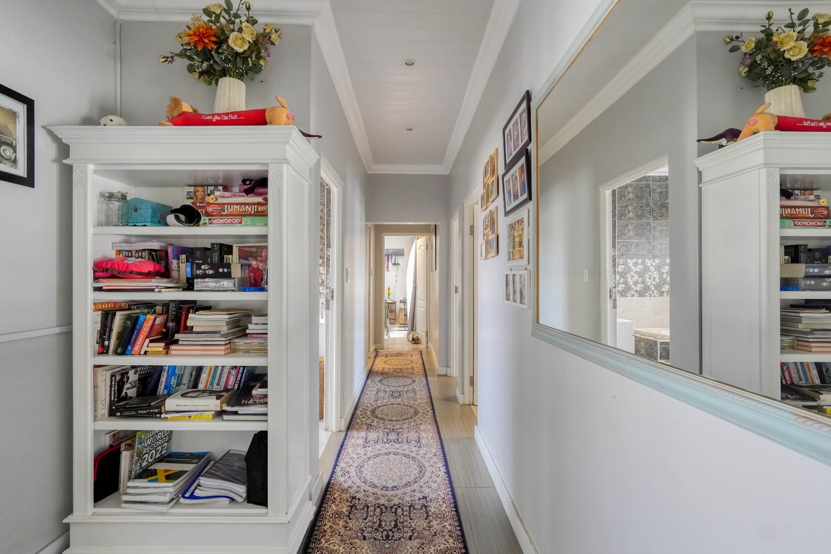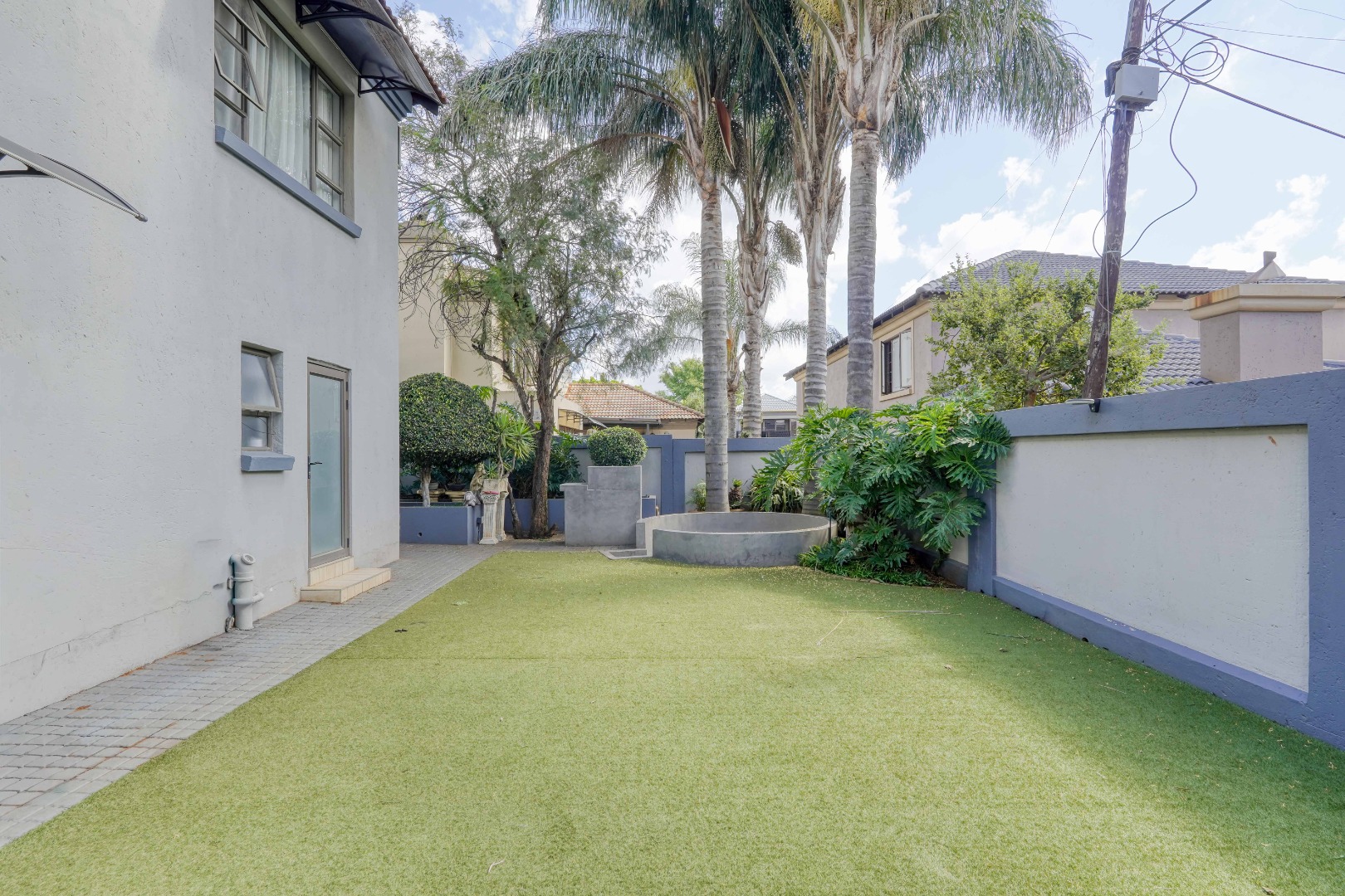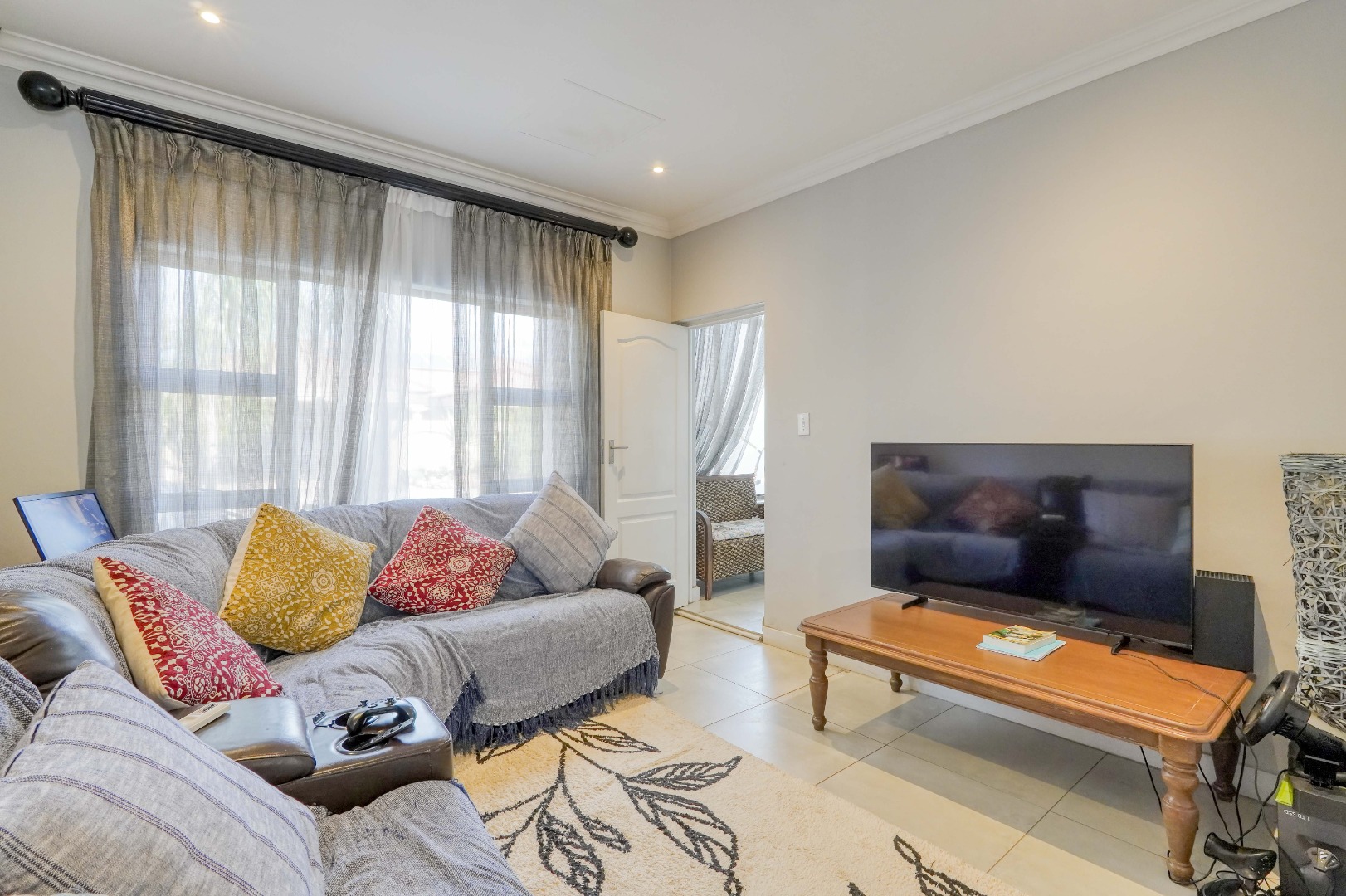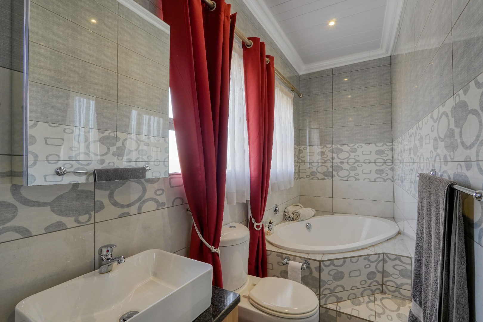 A braai room with a built in braai forms part of the living areas and opens out to the garden. This space connects to a second, smaller lounge which also links back to the entrance hall, creating an additional area for relaxing or entertaining. Outside, the private garden includes a heated swimming pool with a wooden deck and a boma, adding to the outdoor lifestyle.