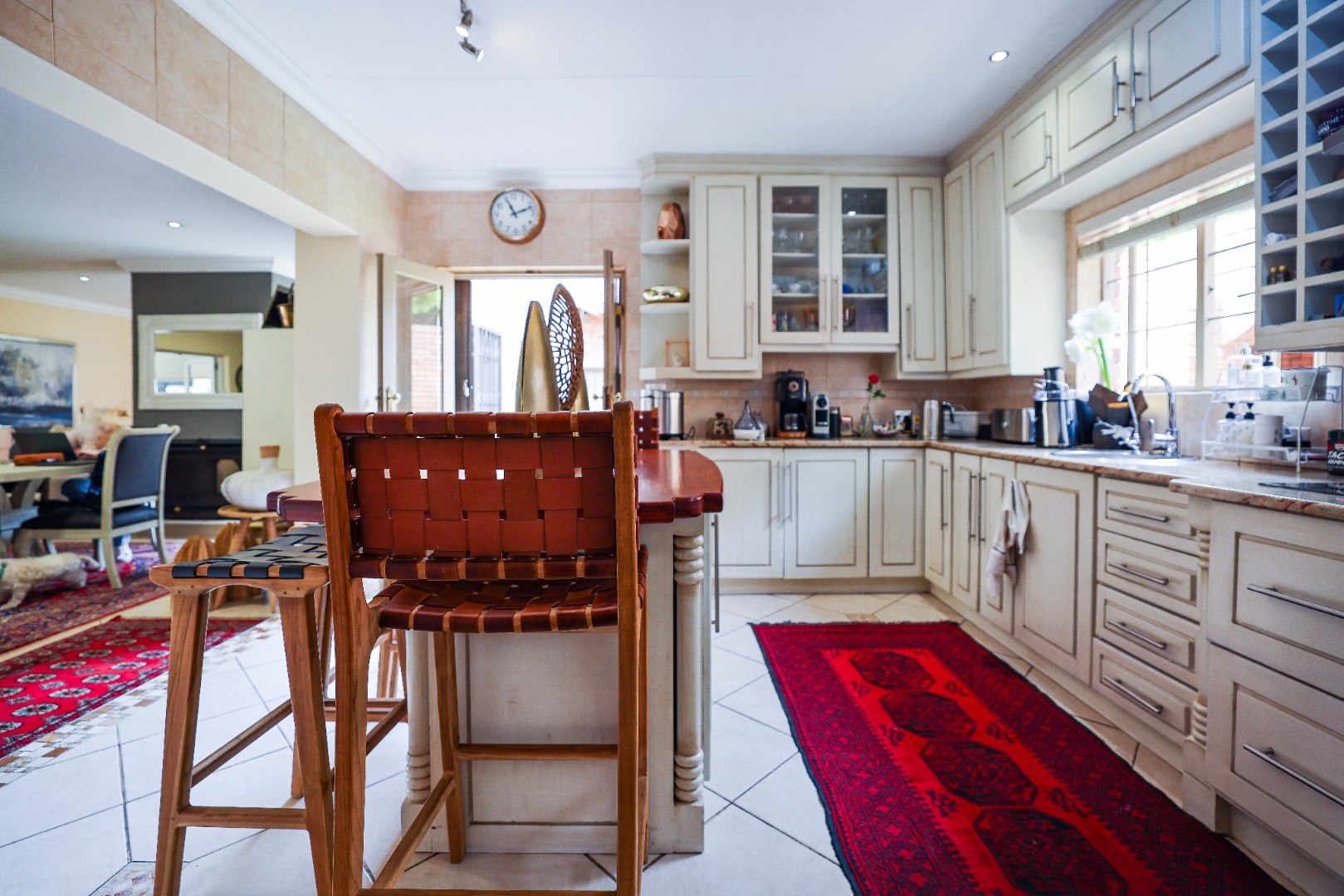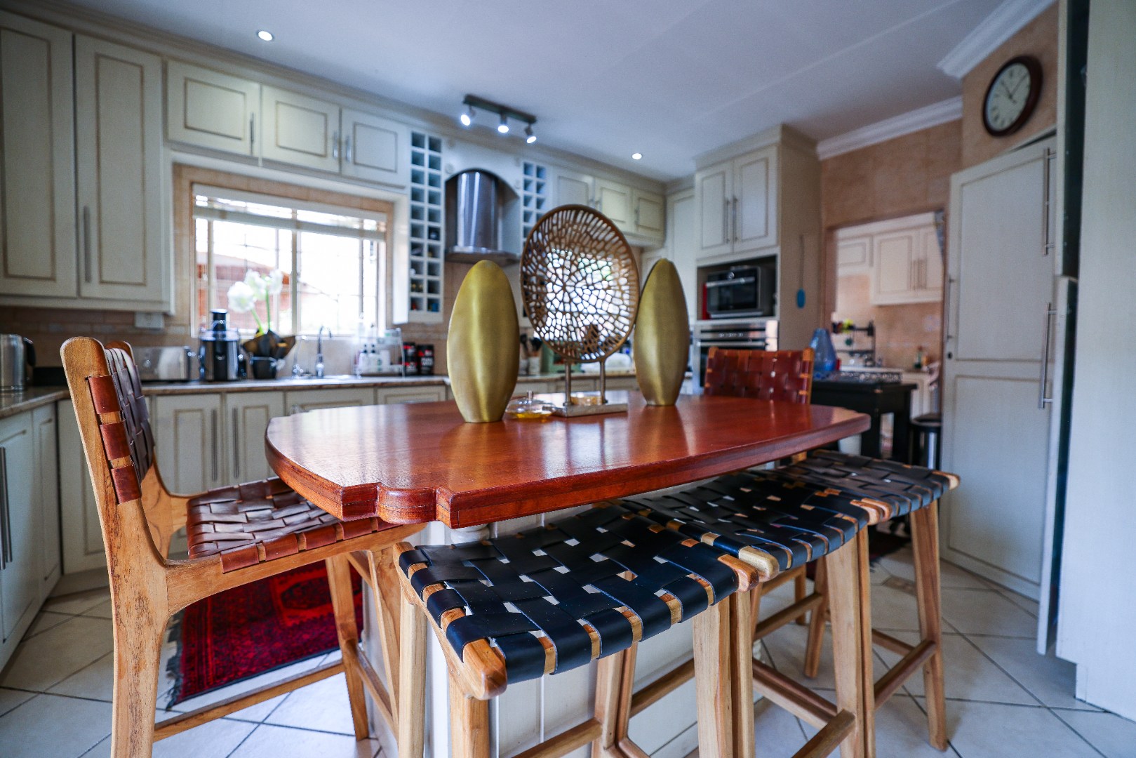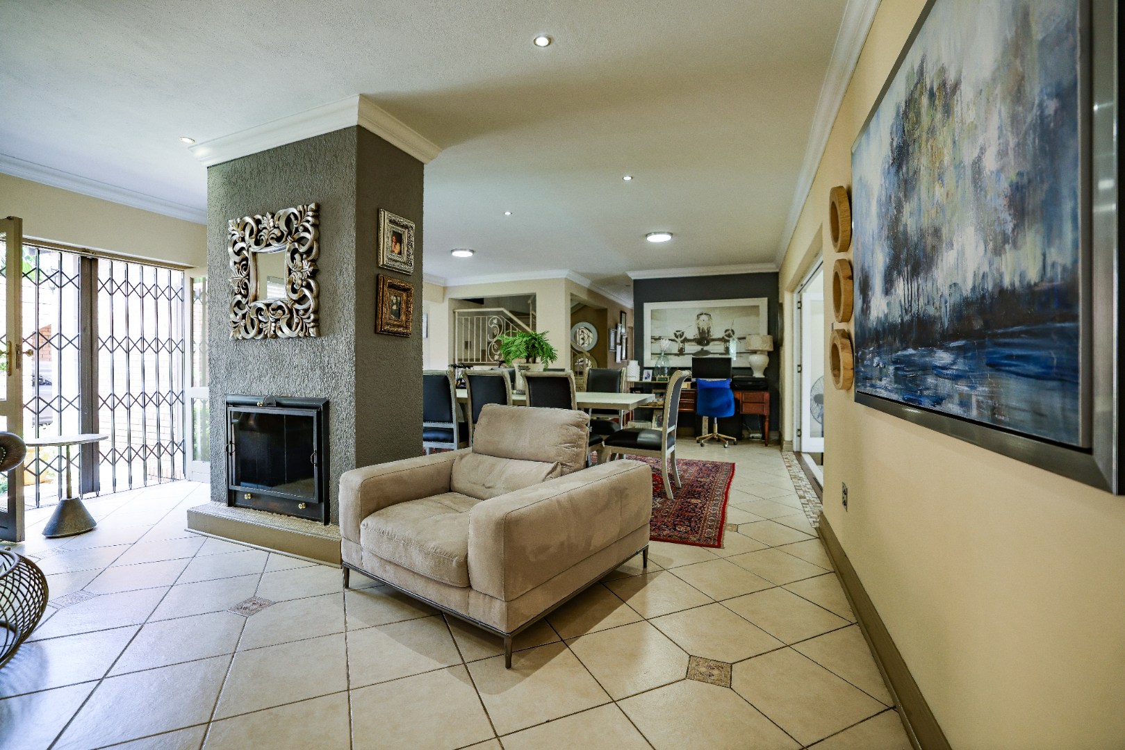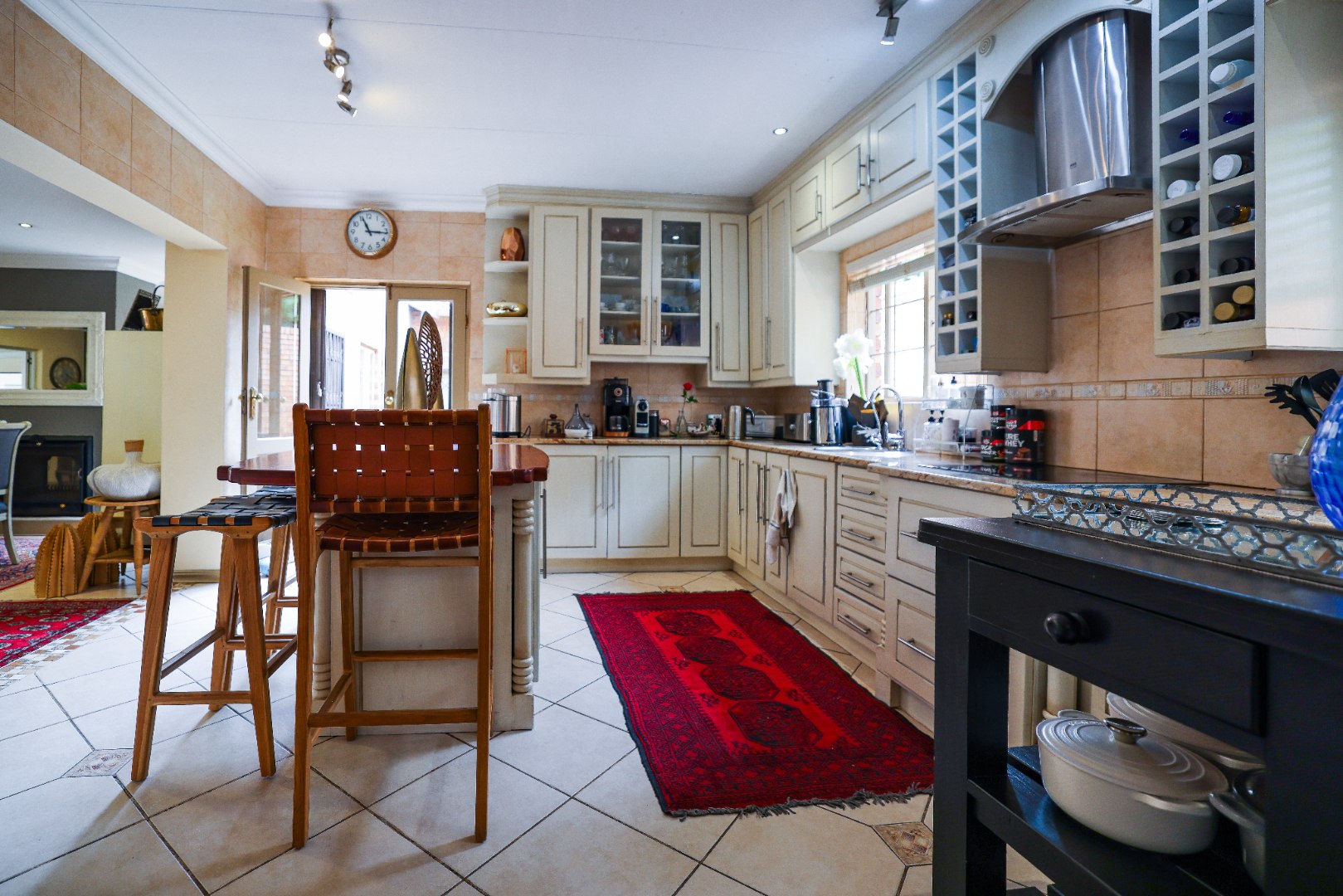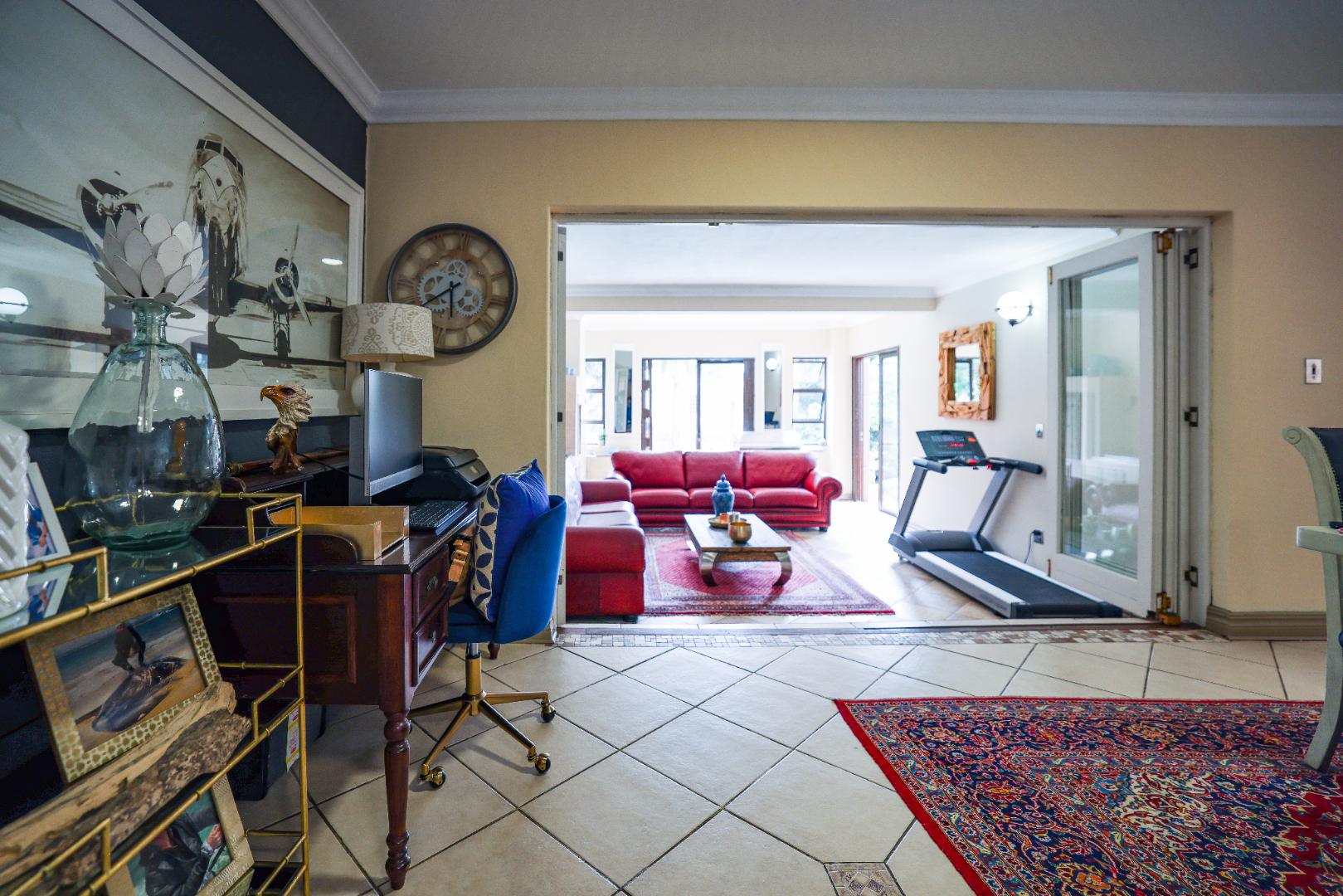 Step inside to discover multiple living areas, including a separate TV lounge and a dedicated braai room, ideal for entertaining all year around. A guest toilet and a private guest suite open directly onto the lush garden, creating a welcoming retreat for visitors. The open-plan dining area has a fireplace and flows seamlessly into the modern kitchen, fitted with beautiful cupboards, custom-made granite counters, AEG eye level oven, ceramic stove, pantry and a large scullery.