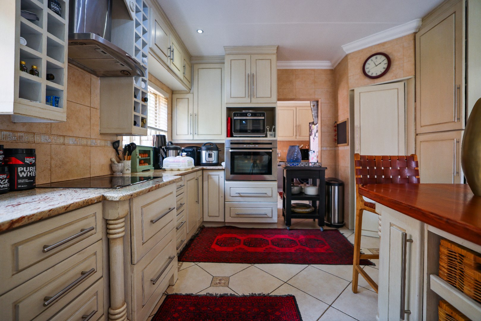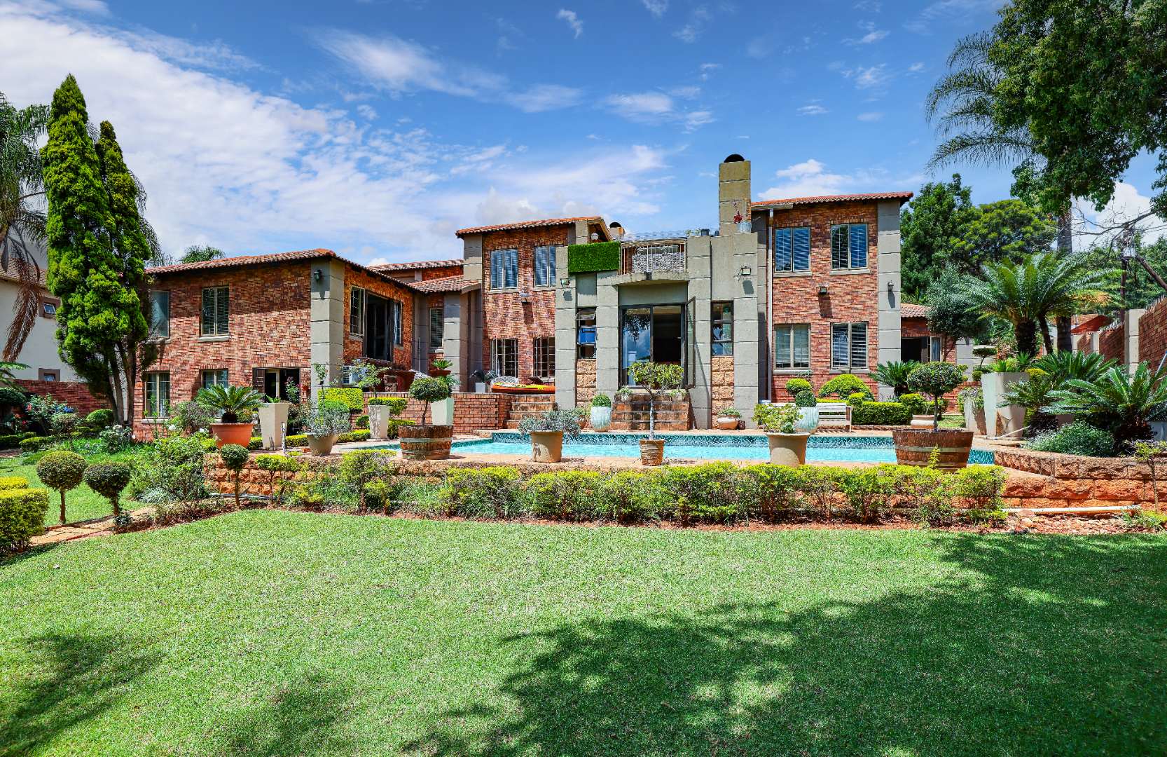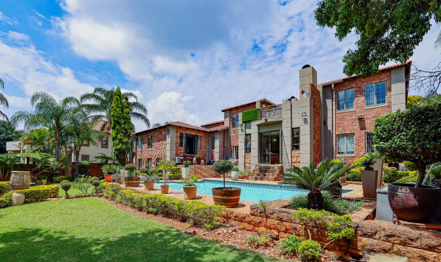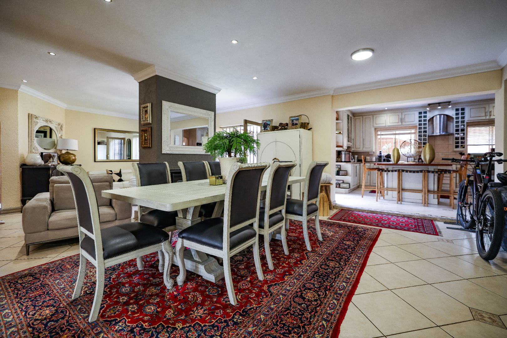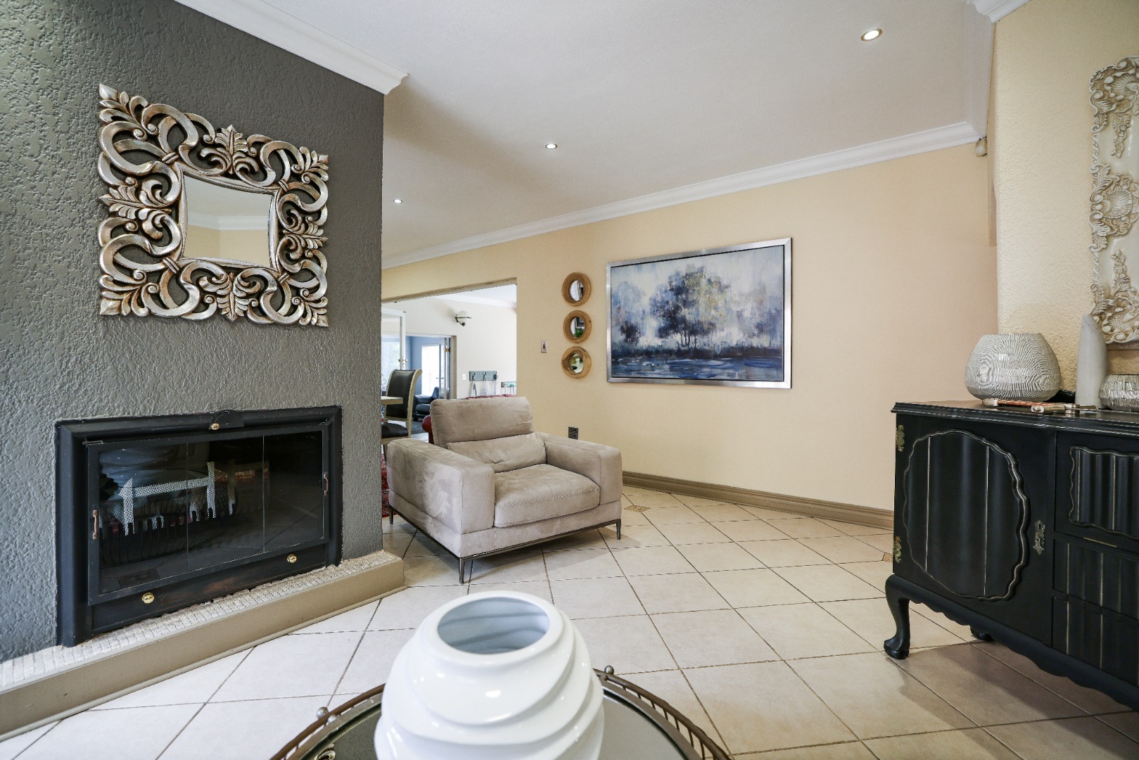 Step inside to discover multiple living areas, including a separate TV lounge and a dedicated braai room, ideal for entertaining all year around. A guest toilet and a private guest suite open directly onto the lush garden, creating a welcoming retreat for visitors. The open-plan dining area has a fireplace and flows seamlessly into the modern kitchen, fitted with beautiful cupboards, custom-made granite counters, AEG eye level oven, ceramic stove, pantry and a large scullery.