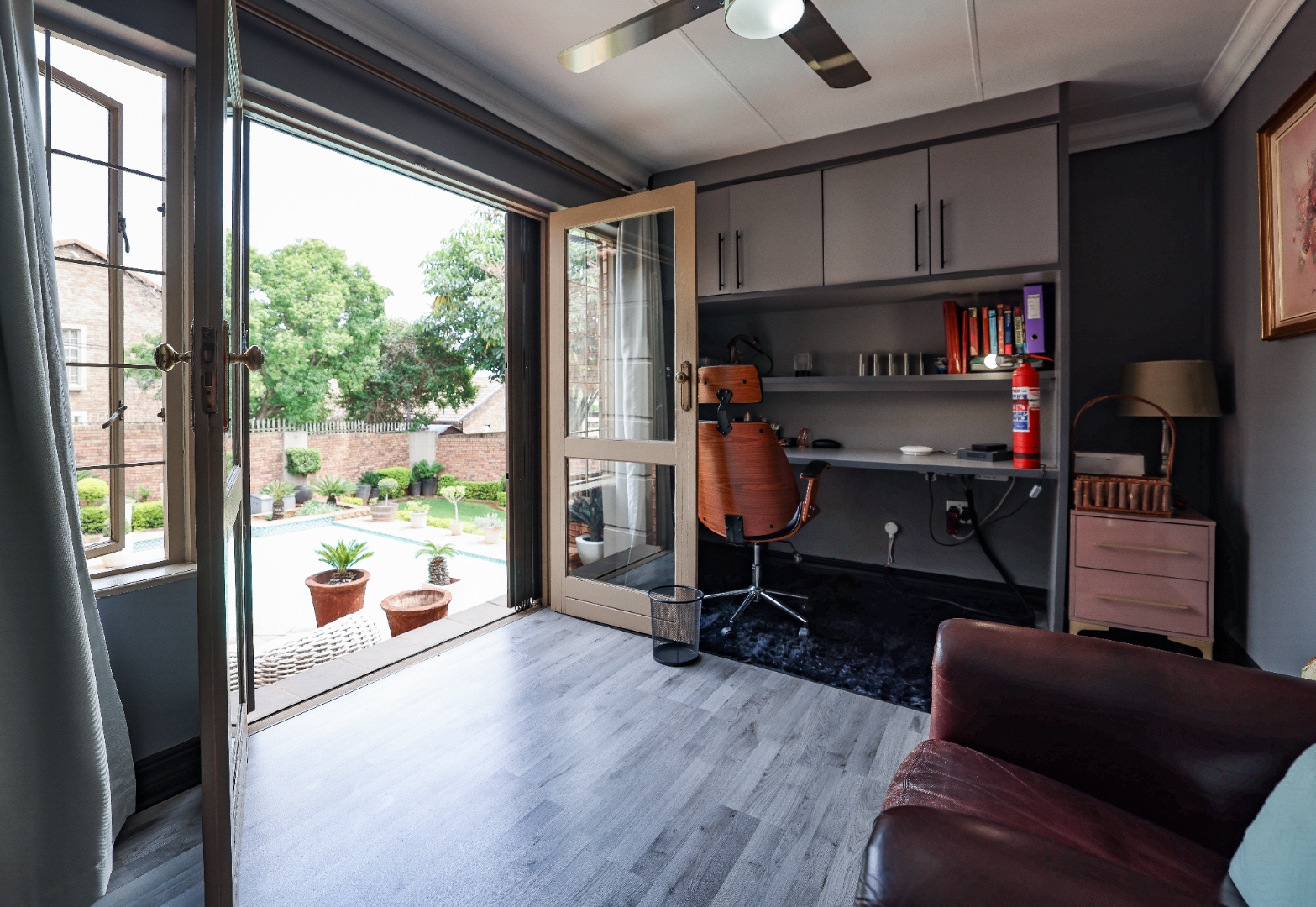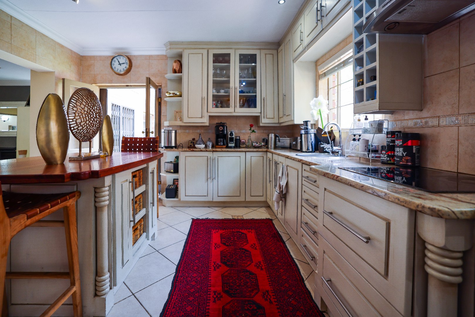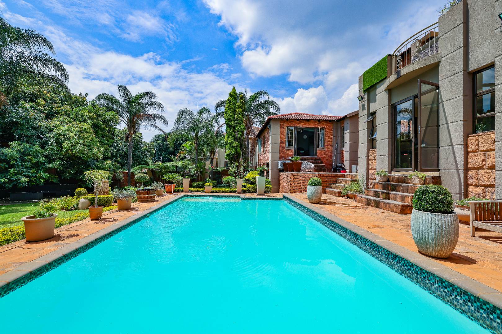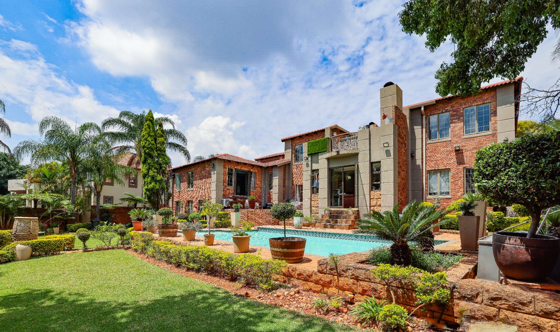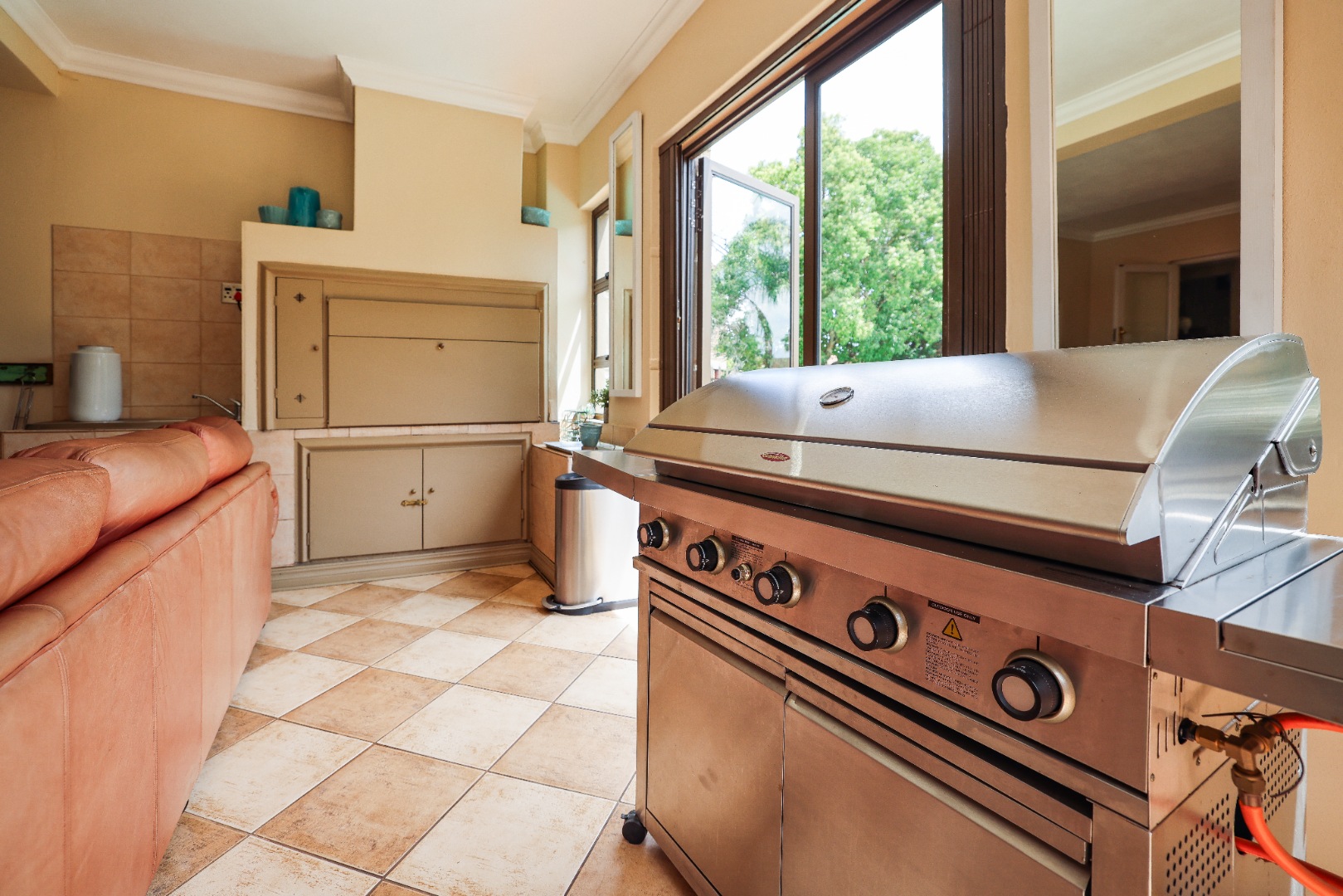Step inside to discover multiple living areas, including a separate TV lounge and a dedicated braai room, ideal for entertaining all year around. A guest toilet and a private guest suite open directly onto the lush garden, creating a welcoming retreat for visitors. The open-plan dining area has a fireplace and flows seamlessly into the modern kitchen, fitted with beautiful cupboards, custom-made granite counters, AEG eye level oven, ceramic stove, pantry and a large scullery.