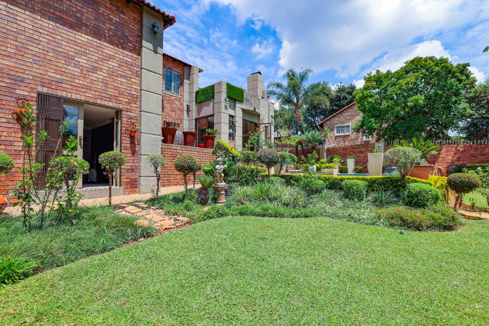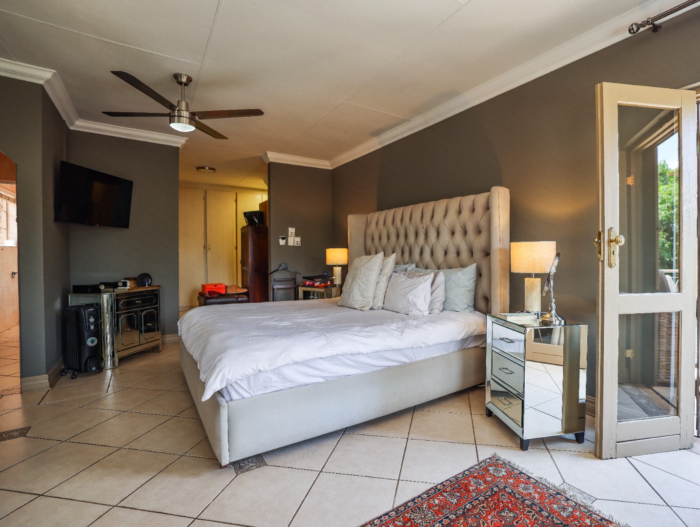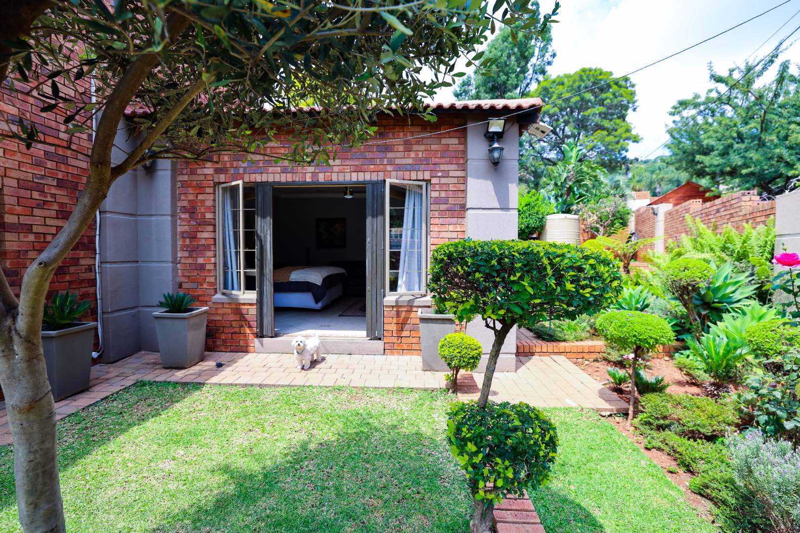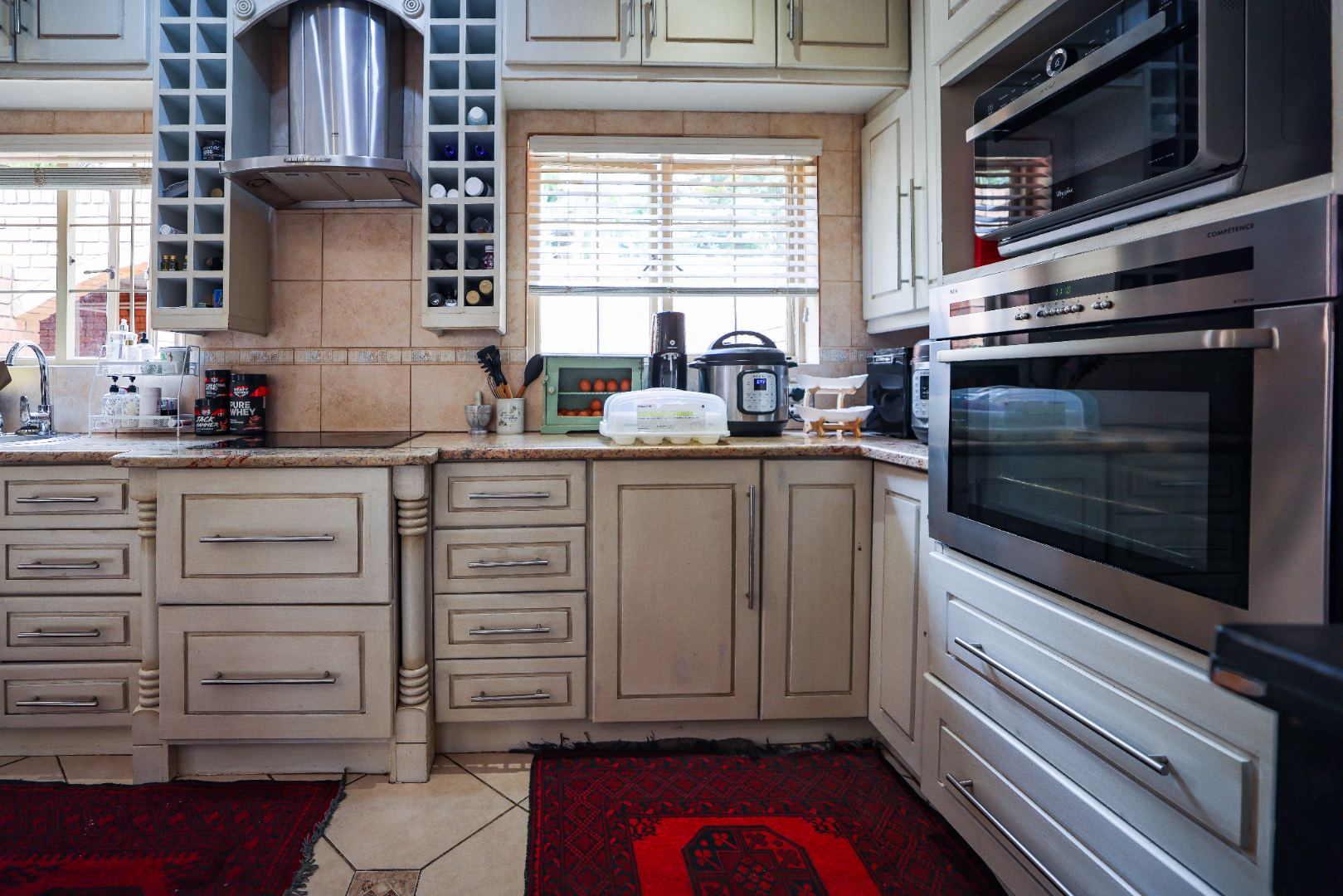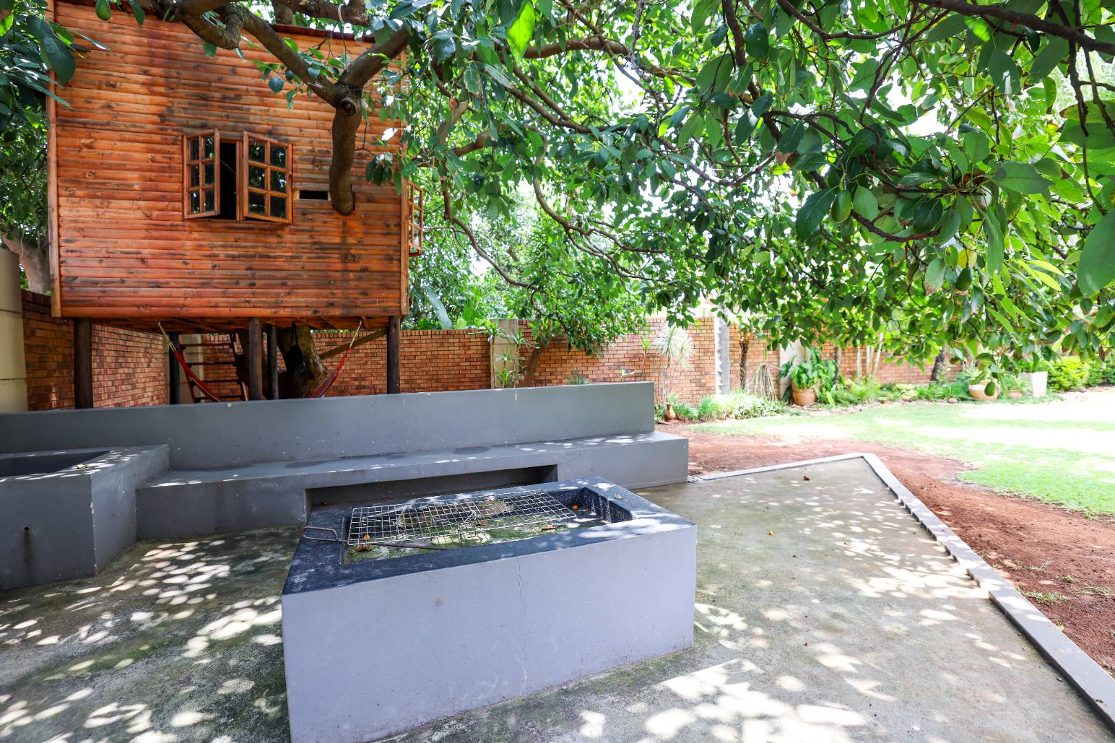Step inside to discover multiple living areas, including a separate TV lounge and a dedicated braai room, ideal for entertaining all year around. A guest toilet and a private guest suite open directly onto the lush garden, creating a welcoming retreat for visitors. The open-plan dining area has a fireplace and flows seamlessly into the modern kitchen, fitted with beautiful cupboards, custom-made granite counters, AEG eye level oven, ceramic stove, pantry and a large scullery.