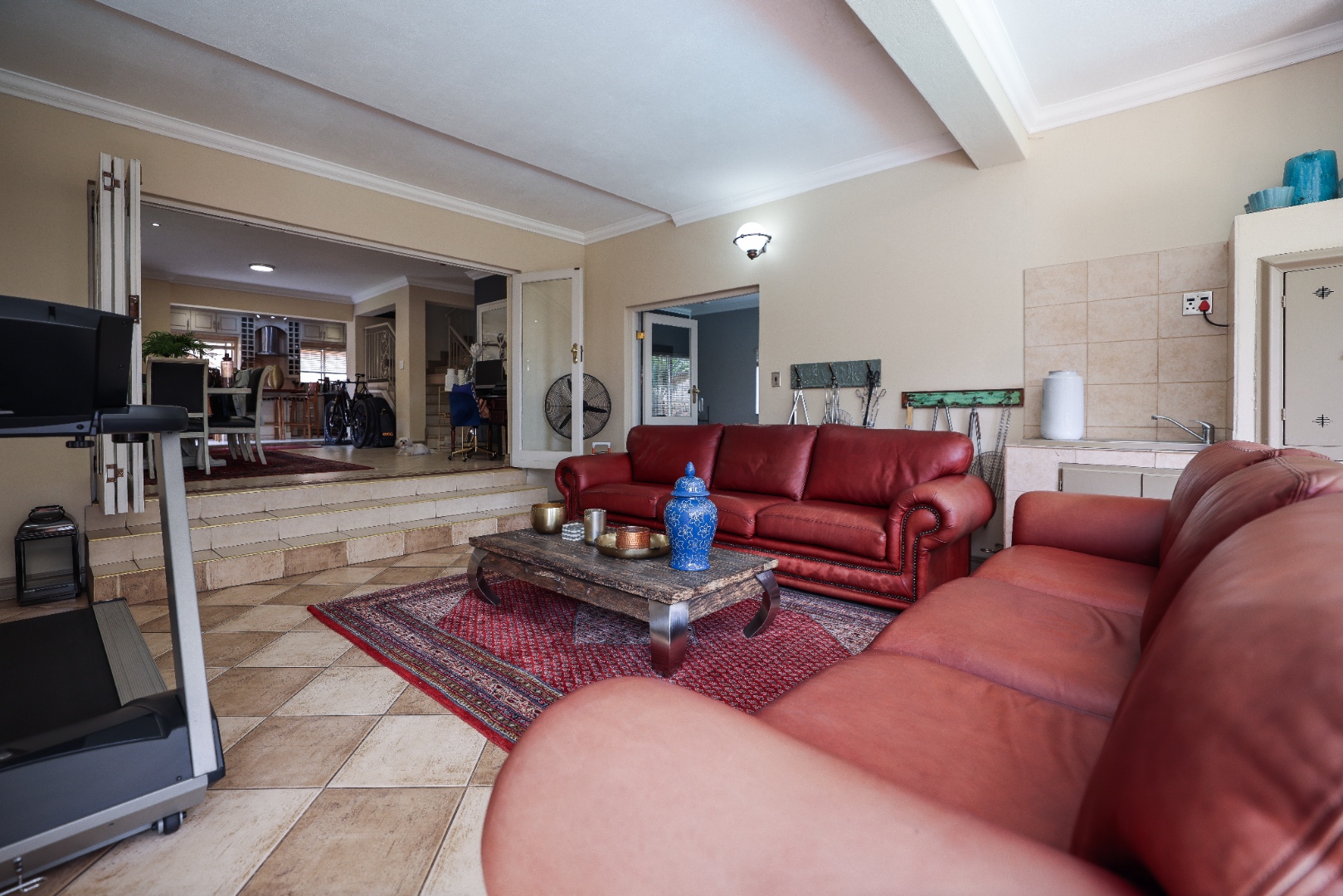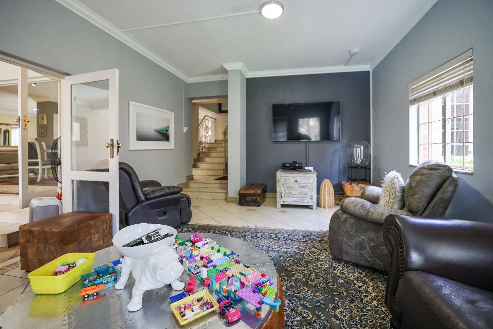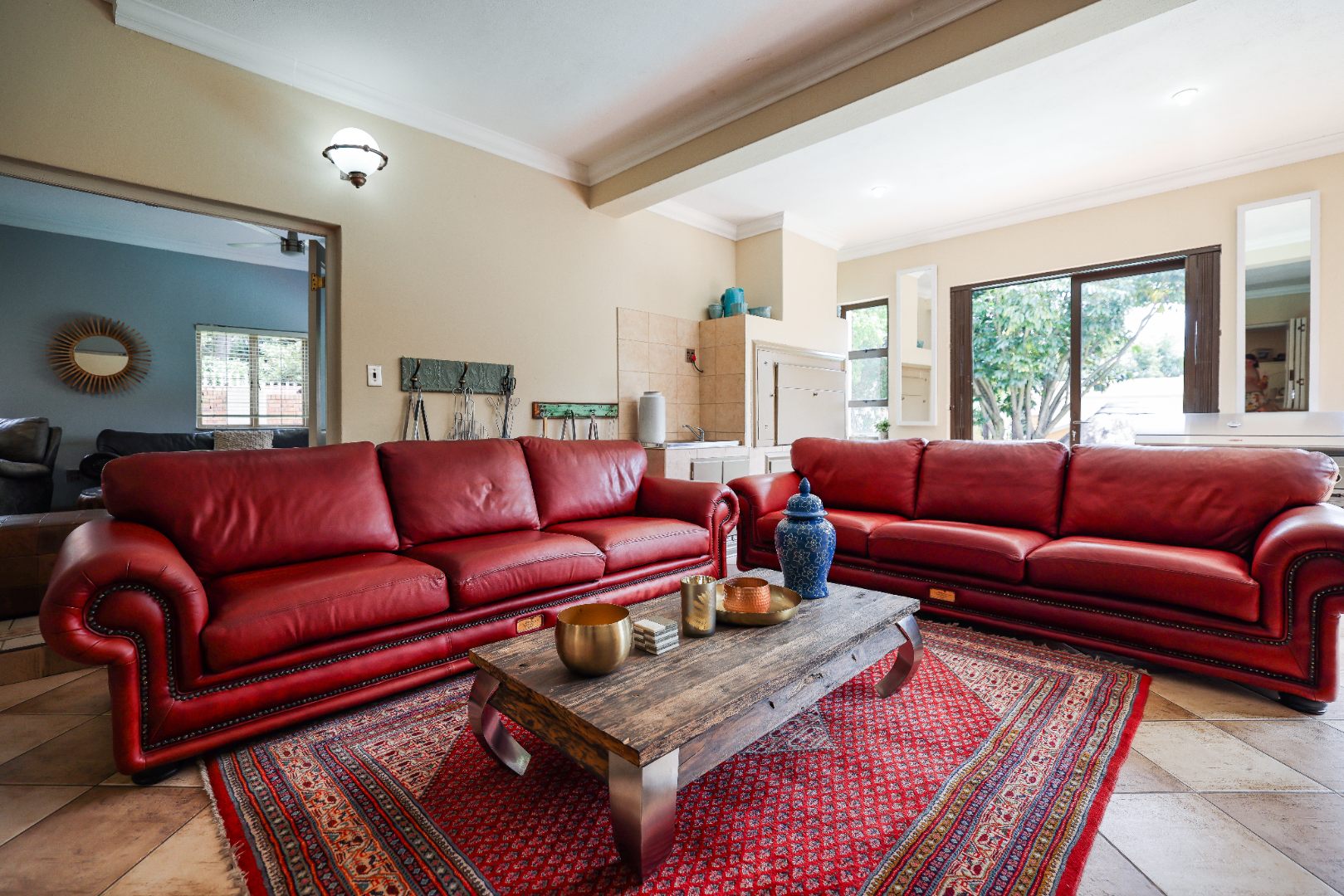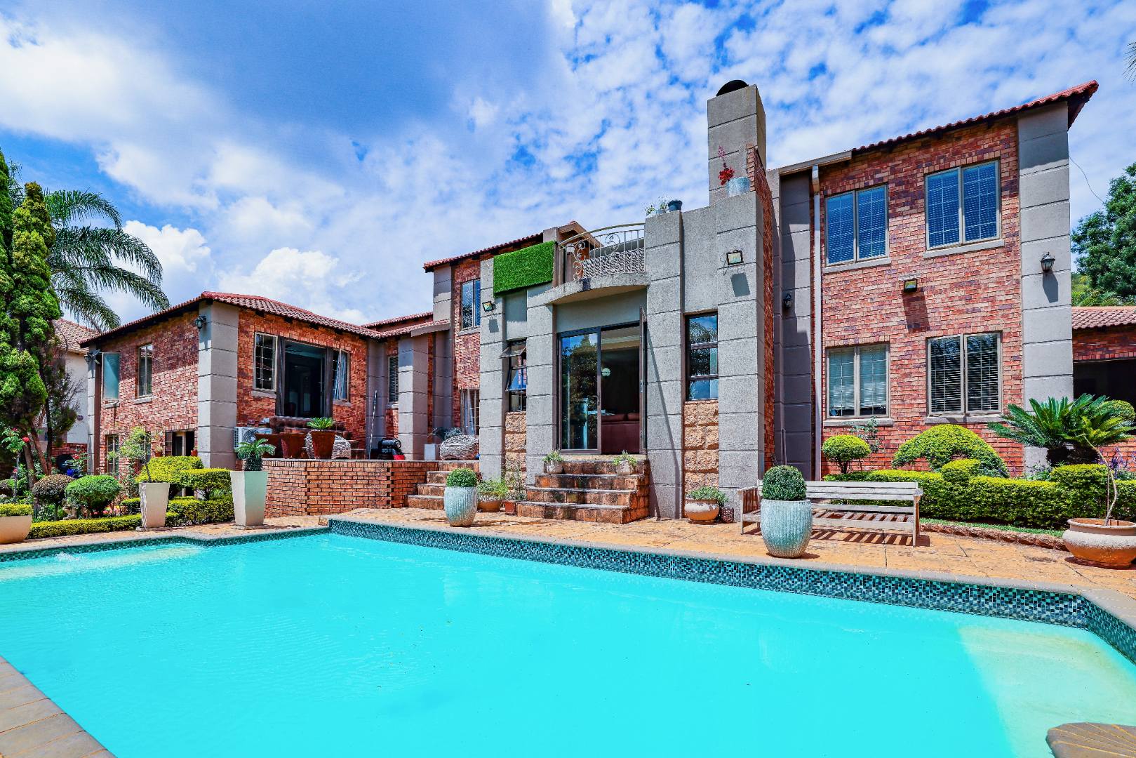 Step inside to discover multiple living areas, including a separate TV lounge and a dedicated braai room, ideal for entertaining all year around. A guest toilet and a private guest suite open directly onto the lush garden, creating a welcoming retreat for visitors. The open-plan dining area has a fireplace and flows seamlessly into the modern kitchen, fitted with beautiful cupboards, custom-made granite counters, AEG eye level oven, ceramic stove, pantry and a large scullery.