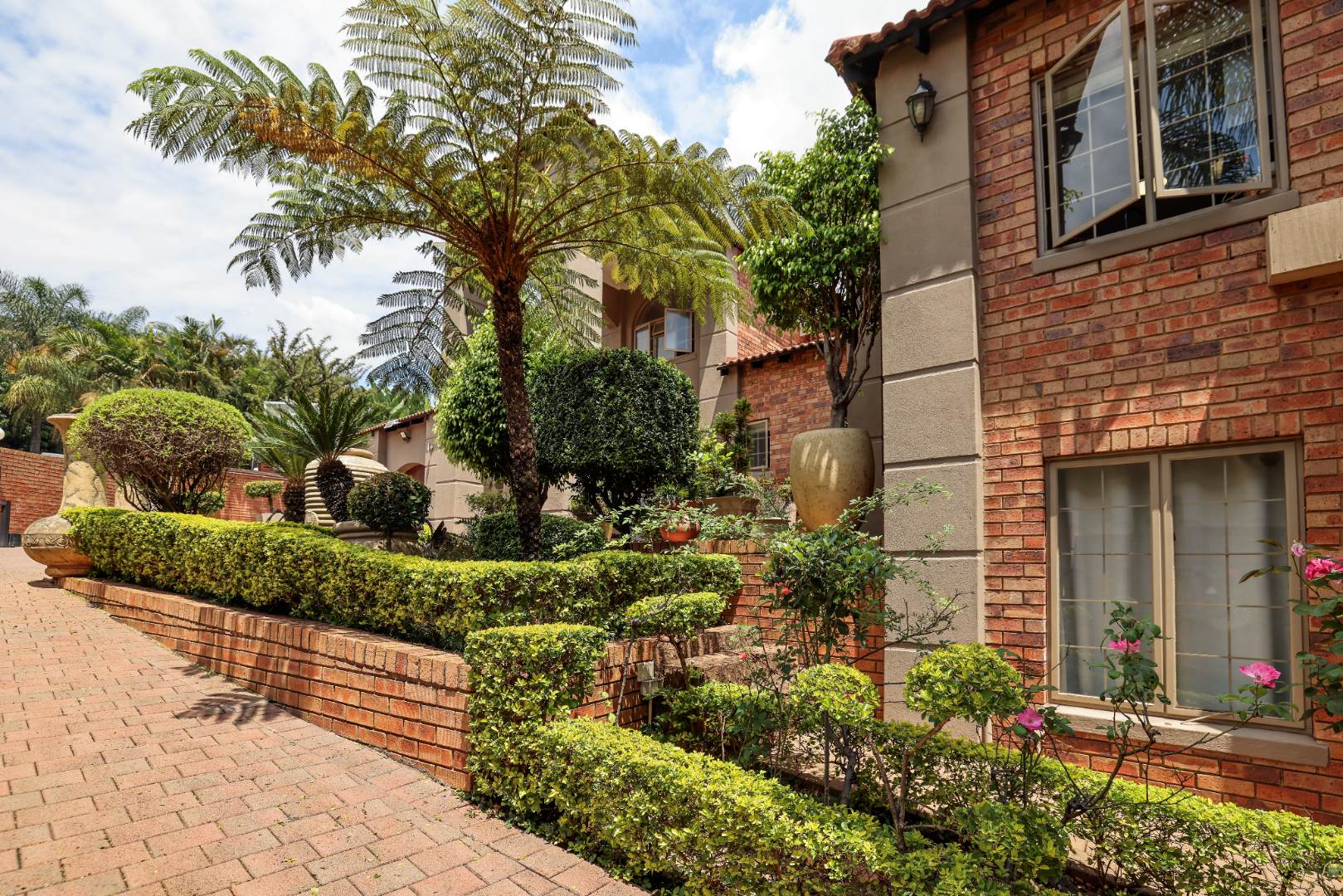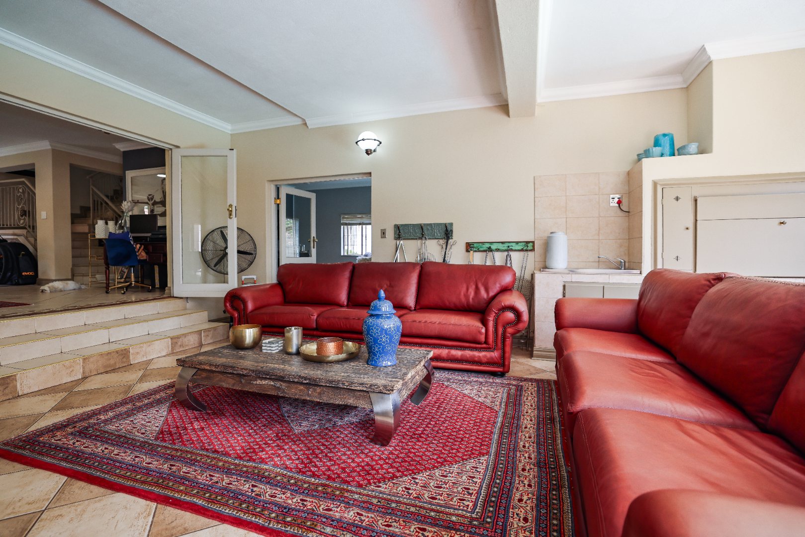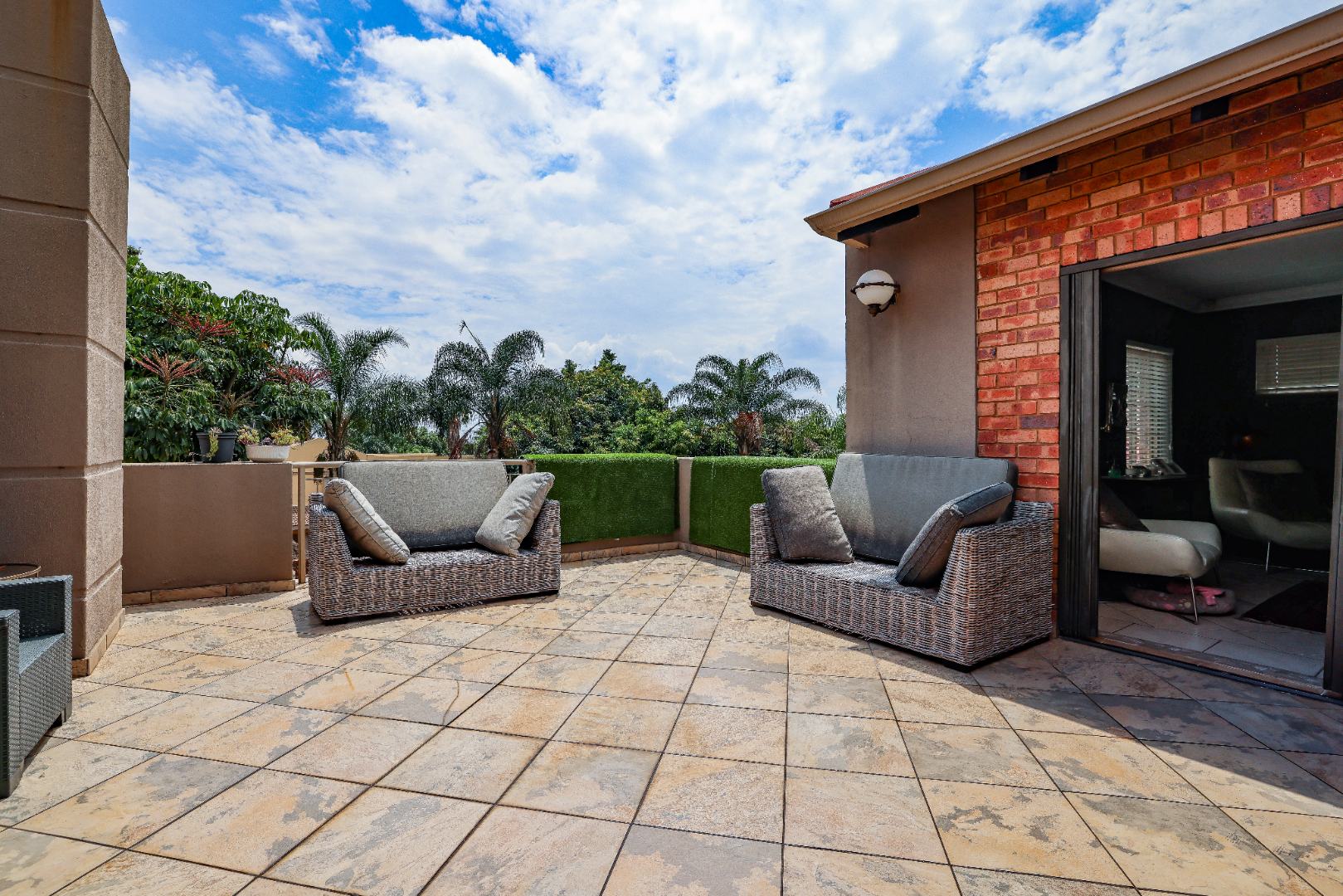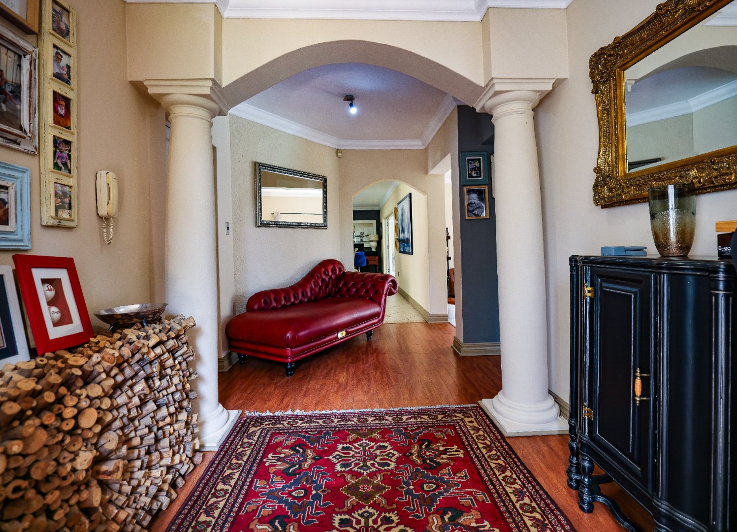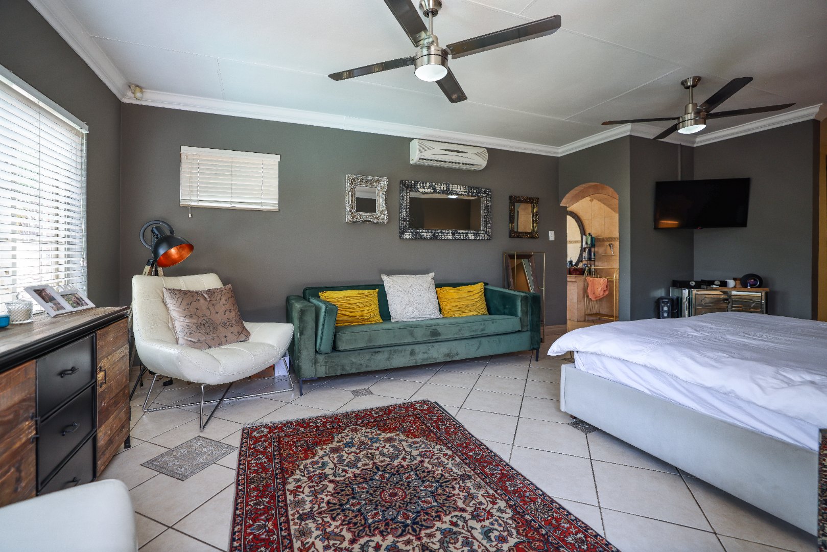 Step inside to discover multiple living areas, including a separate TV lounge and a dedicated braai room, ideal for entertaining all year around. A guest toilet and a private guest suite open directly onto the lush garden, creating a welcoming retreat for visitors. The open-plan dining area has a fireplace and flows seamlessly into the modern kitchen, fitted with beautiful cupboards, custom-made granite counters, AEG eye level oven, ceramic stove, pantry and a large scullery.