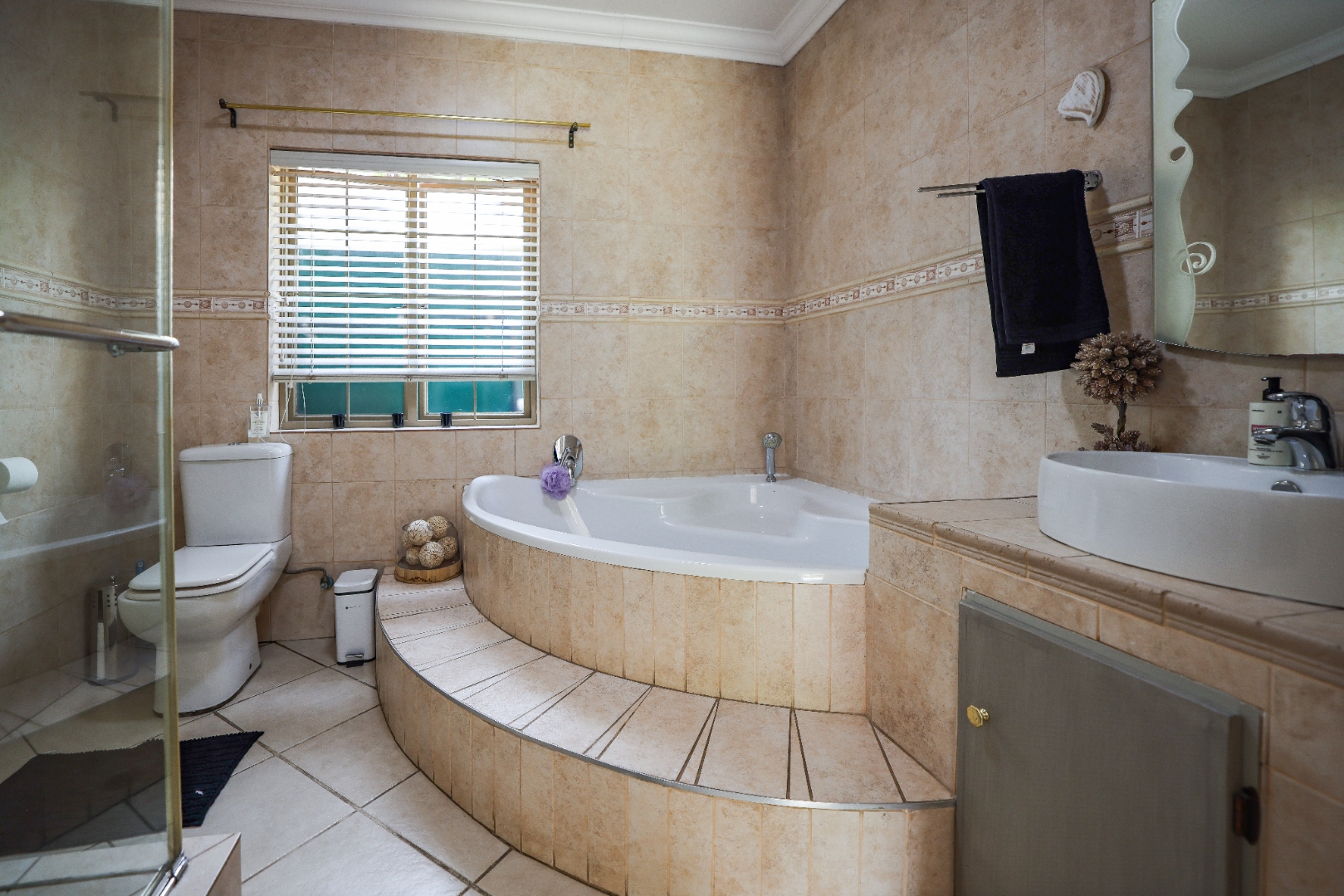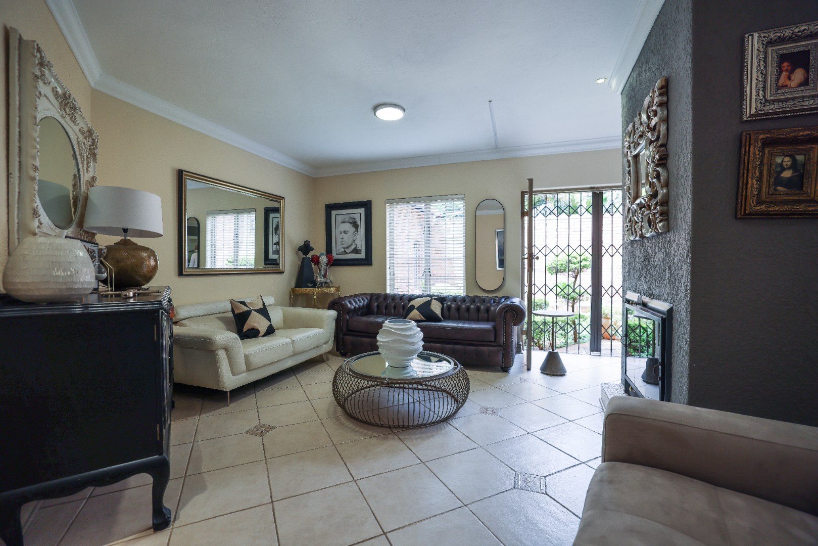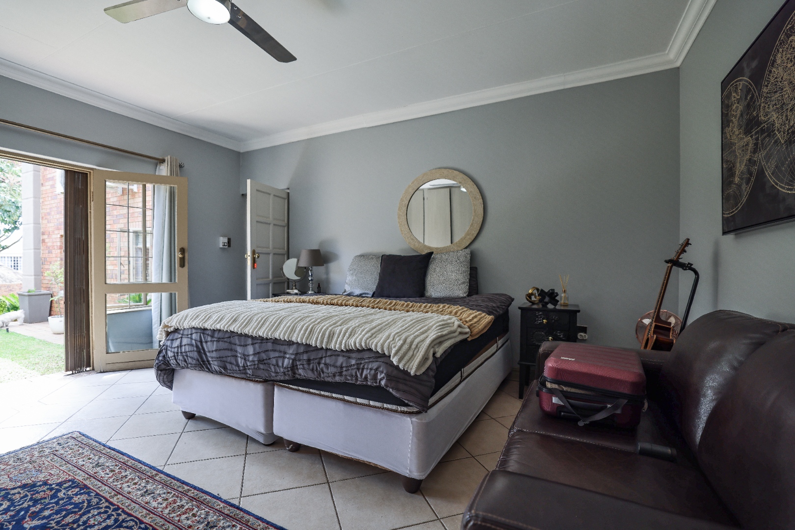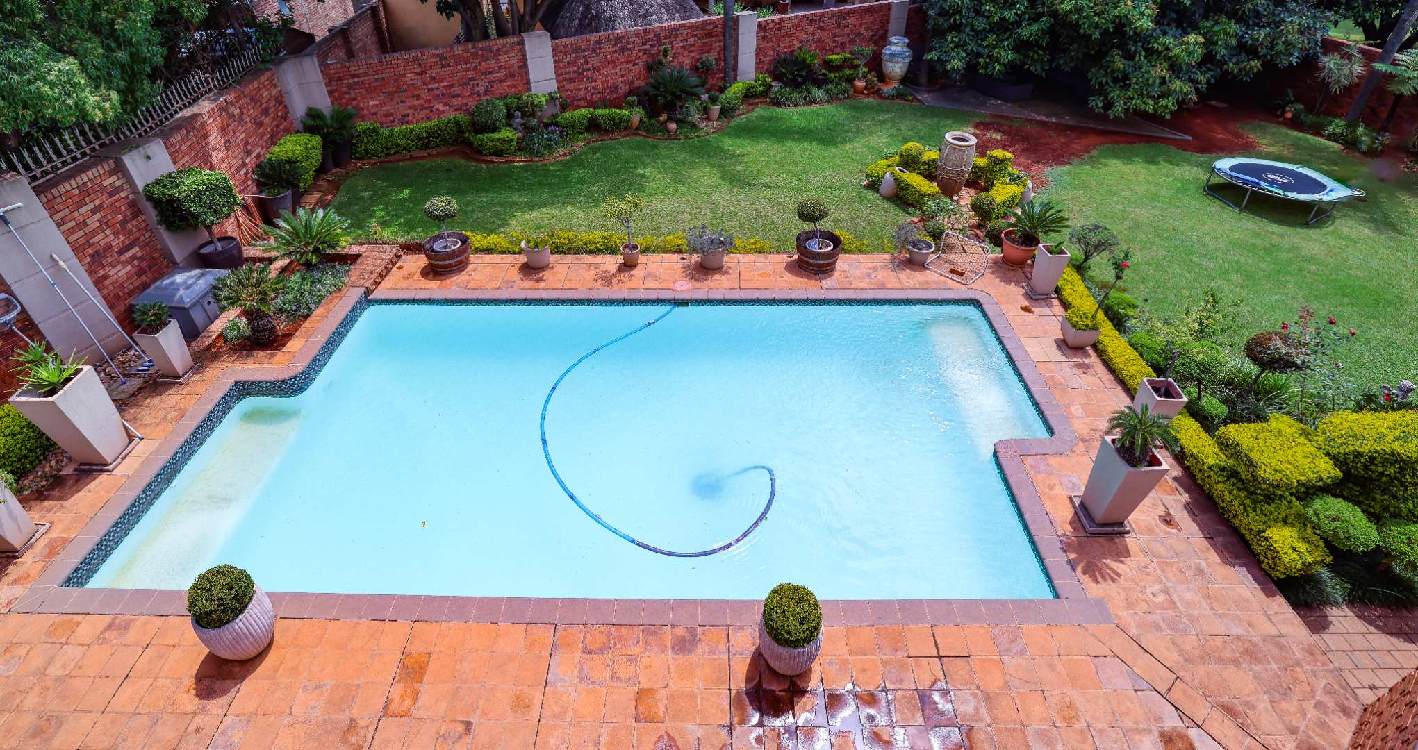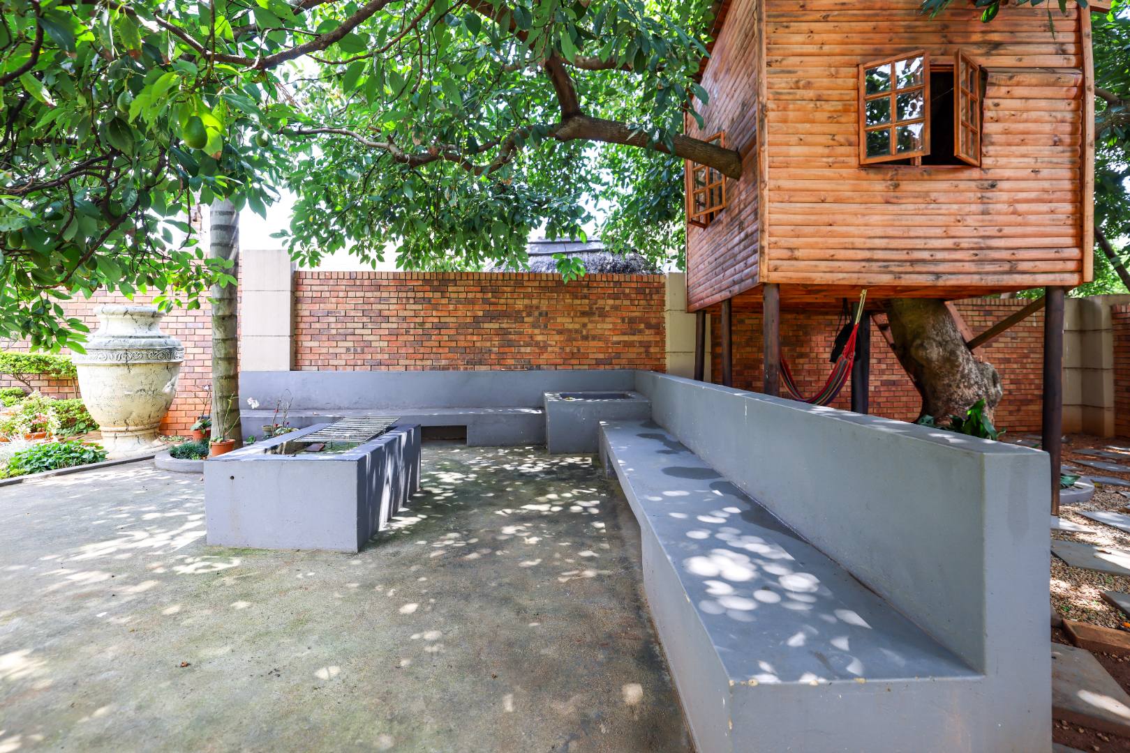 Step inside to discover multiple living areas, including a separate TV lounge and a dedicated braai room, ideal for entertaining all year around. A guest toilet and a private guest suite open directly onto the lush garden, creating a welcoming retreat for visitors. The open-plan dining area has a fireplace and flows seamlessly into the modern kitchen, fitted with beautiful cupboards, custom-made granite counters, AEG eye level oven, ceramic stove, pantry and a large scullery.
