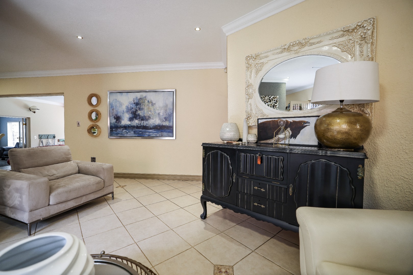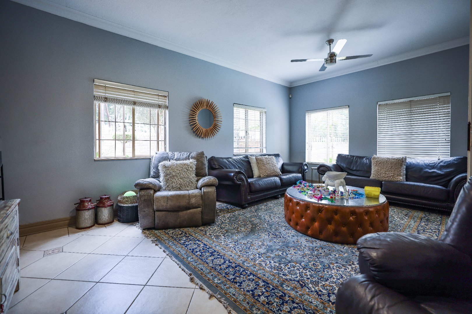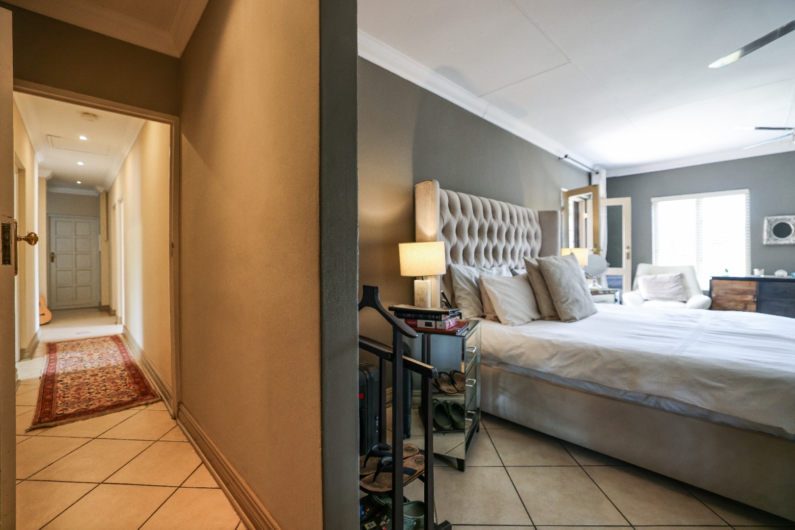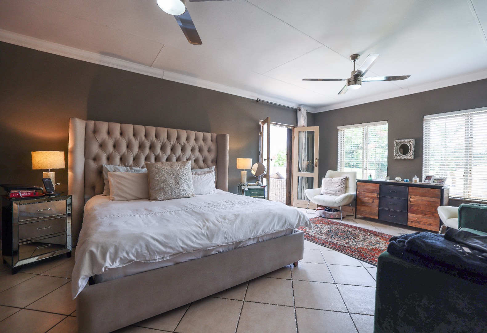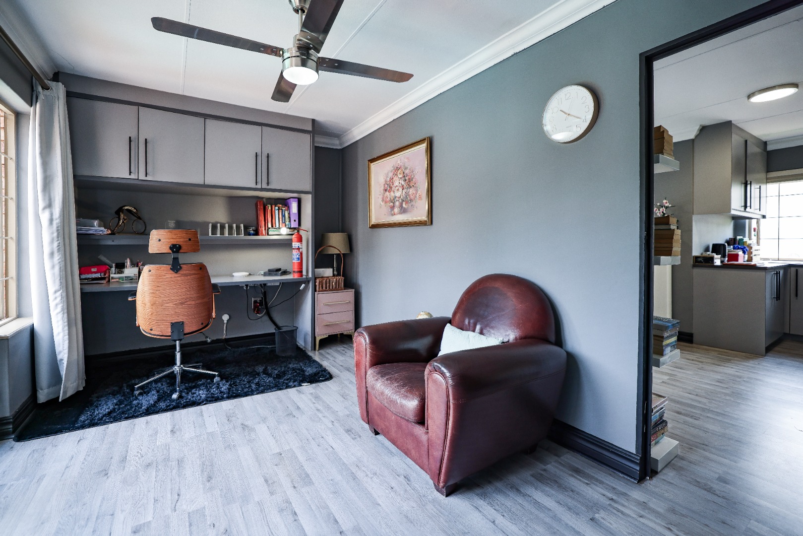 Step inside to discover multiple living areas, including a separate TV lounge and a dedicated braai room, ideal for entertaining all year around. A guest toilet and a private guest suite open directly onto the lush garden, creating a welcoming retreat for visitors. The open-plan dining area has a fireplace and flows seamlessly into the modern kitchen, fitted with beautiful cupboards, custom-made granite counters, AEG eye level oven, ceramic stove, pantry and a large scullery.