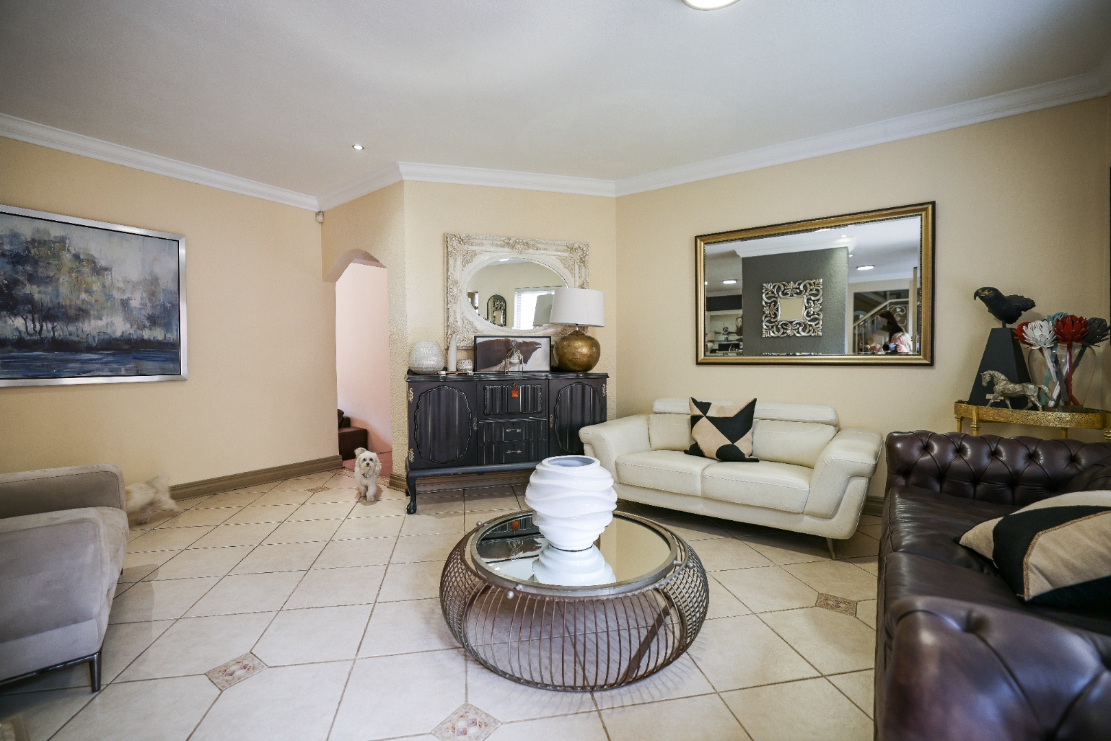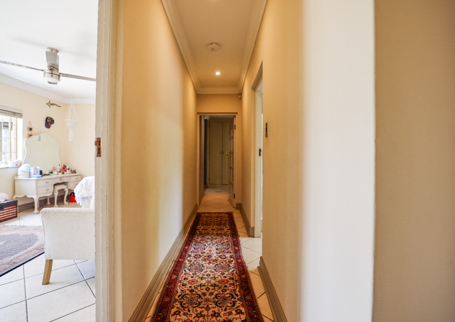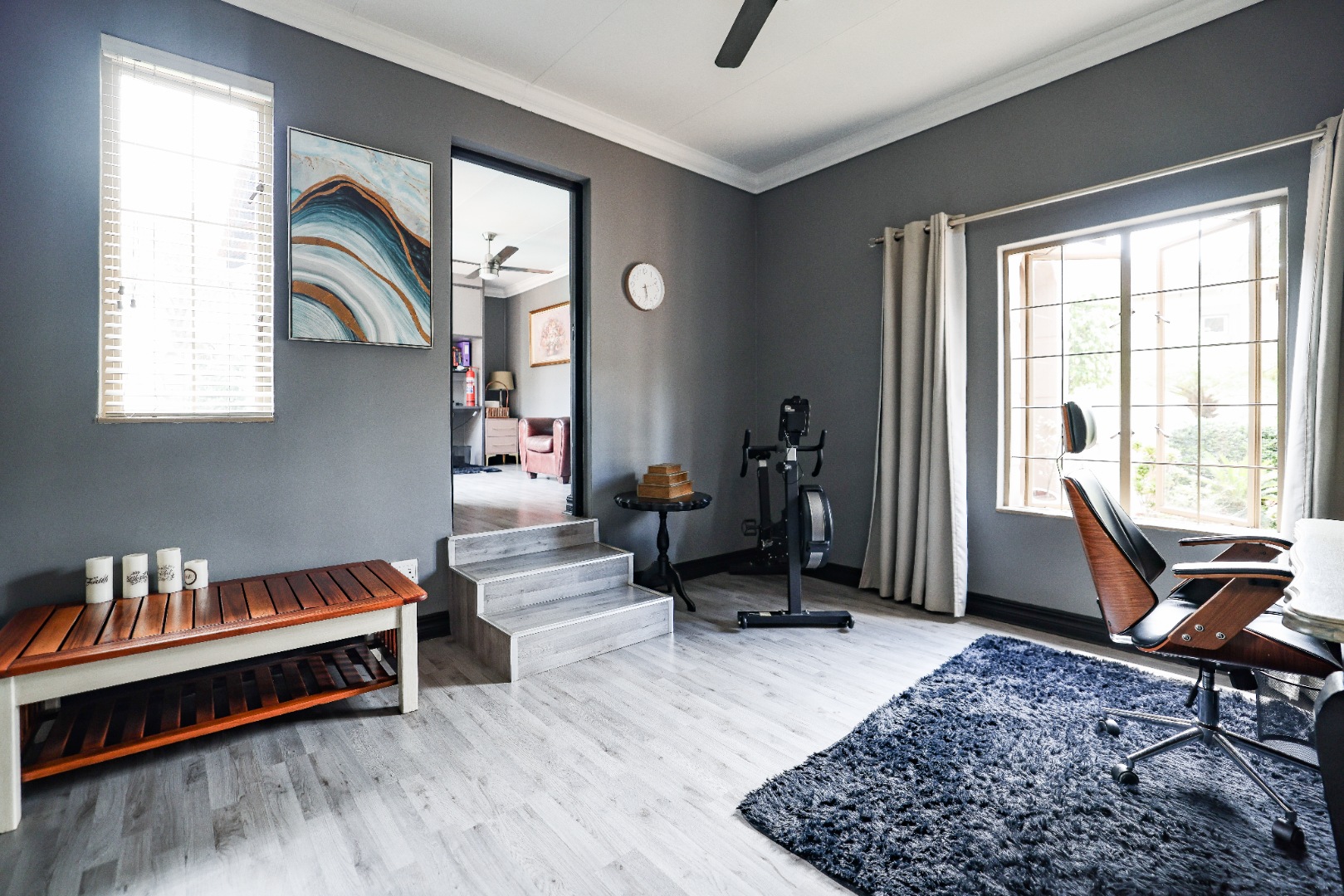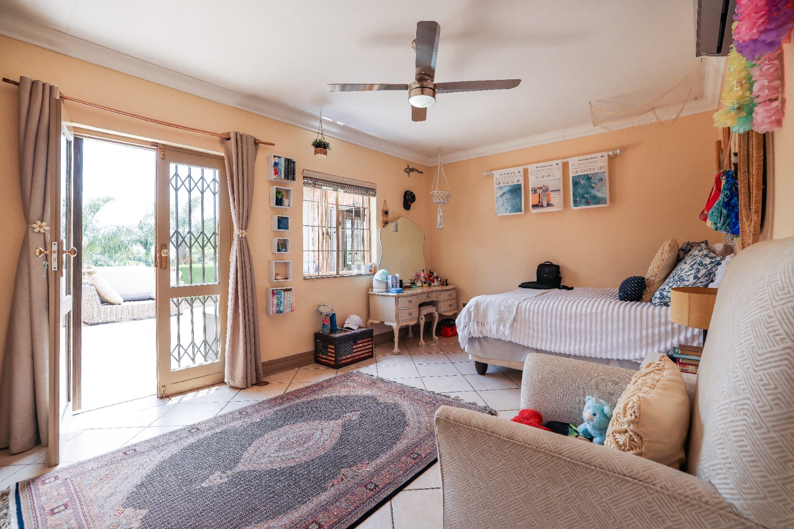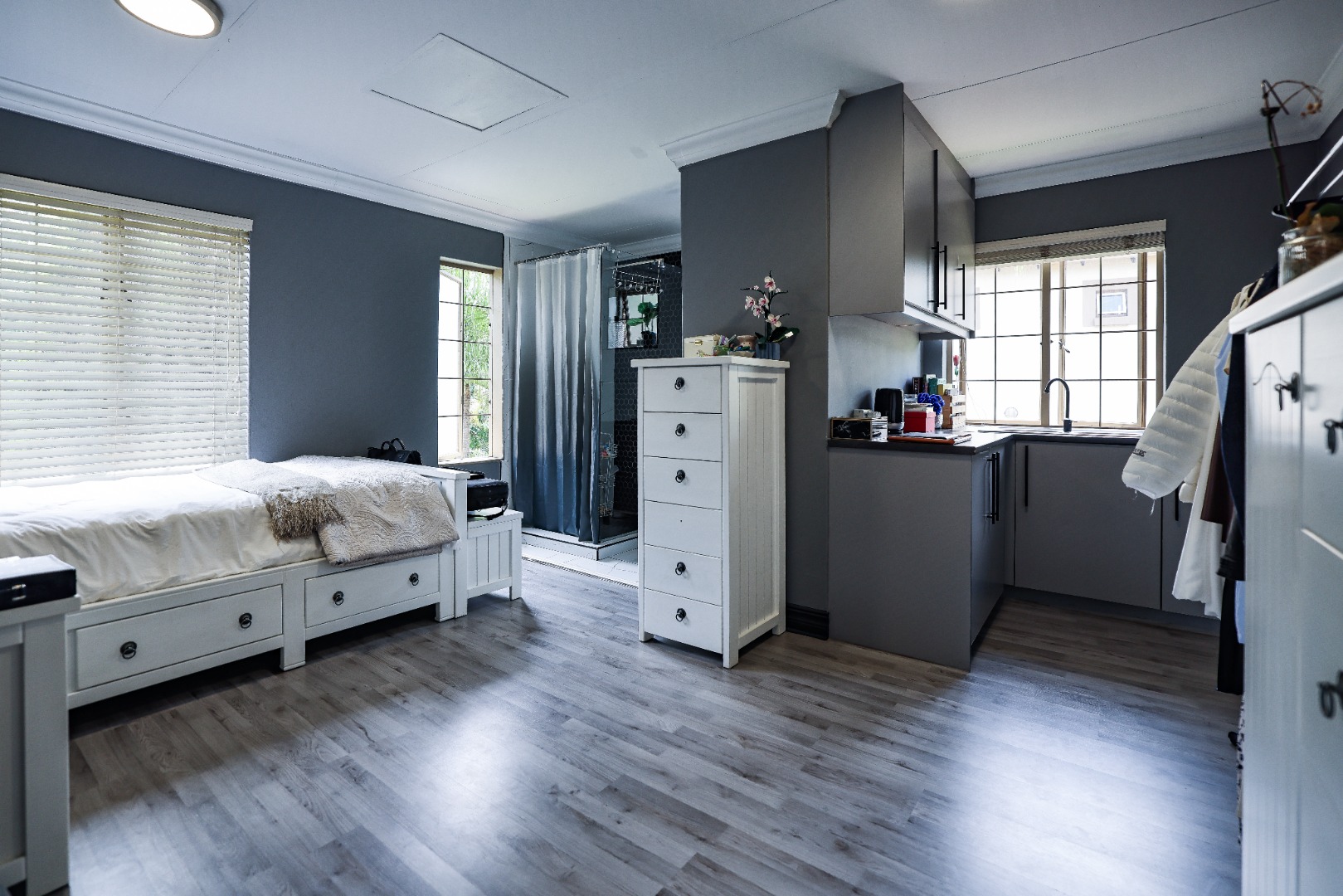 Step inside to discover multiple living areas, including a separate TV lounge and a dedicated braai room, ideal for entertaining all year around. A guest toilet and a private guest suite open directly onto the lush garden, creating a welcoming retreat for visitors. The open-plan dining area has a fireplace and flows seamlessly into the modern kitchen, fitted with beautiful cupboards, custom-made granite counters, AEG eye level oven, ceramic stove, pantry and a large scullery.