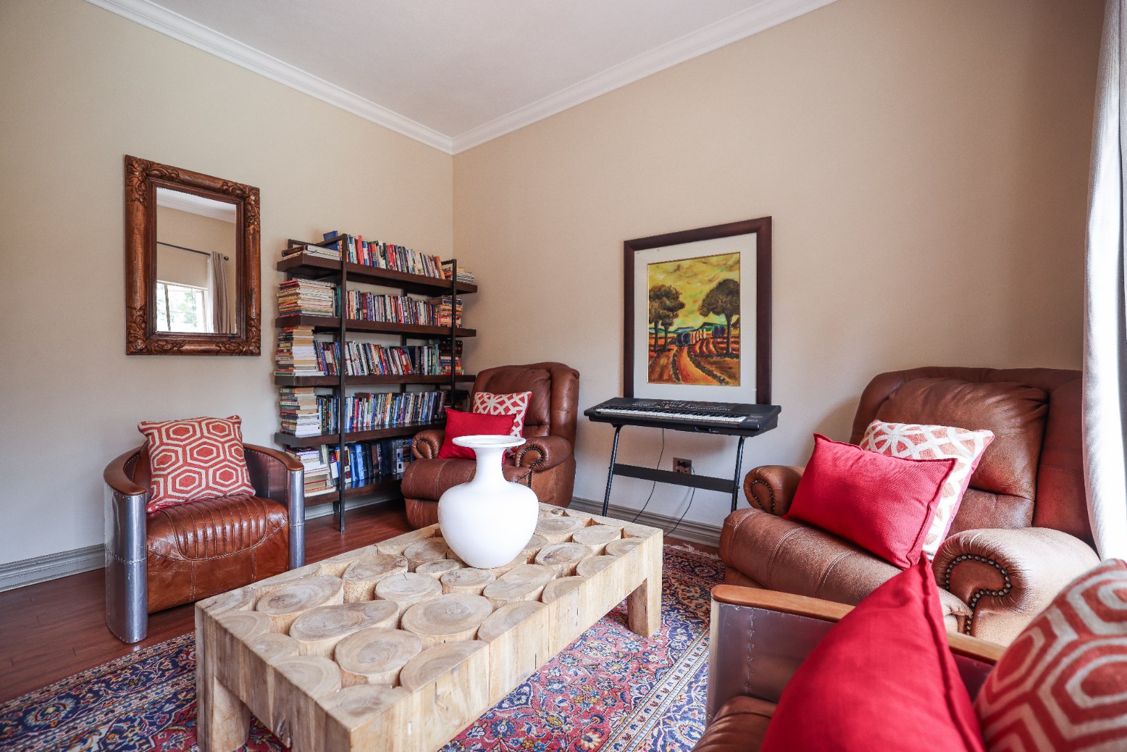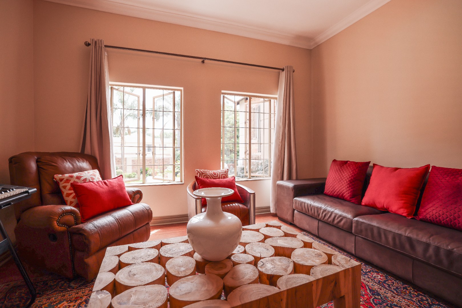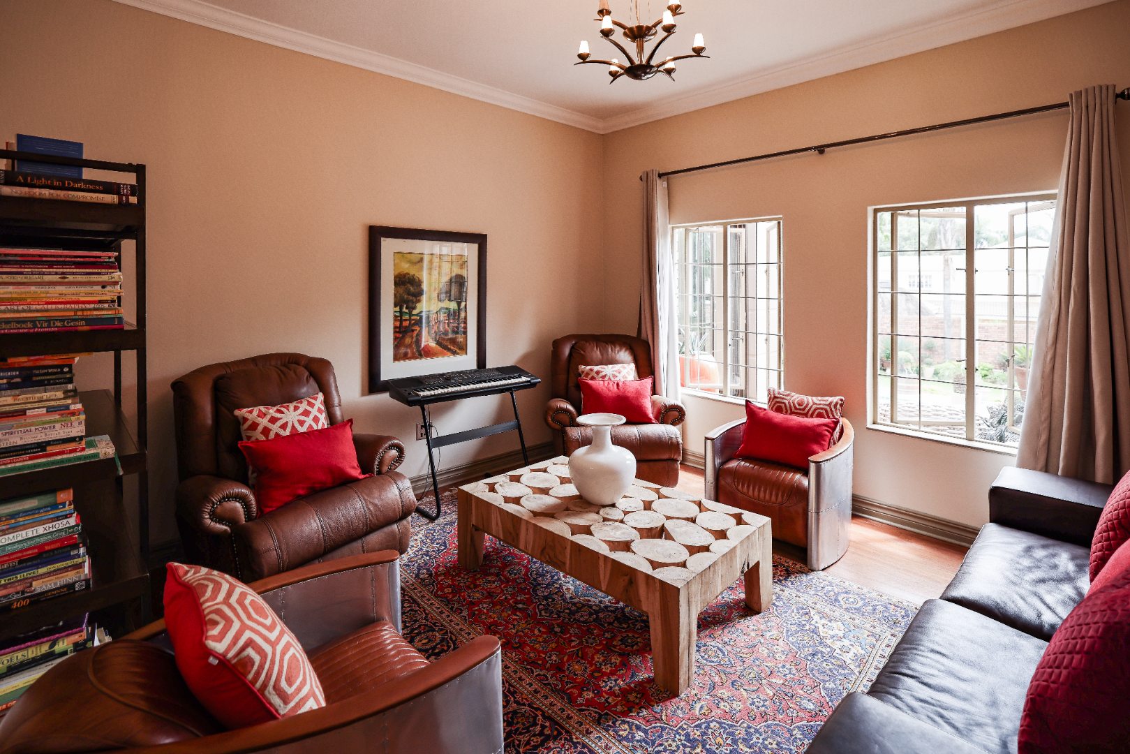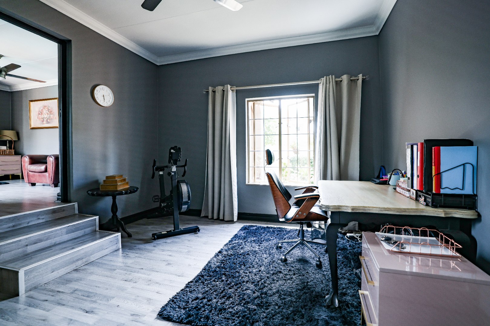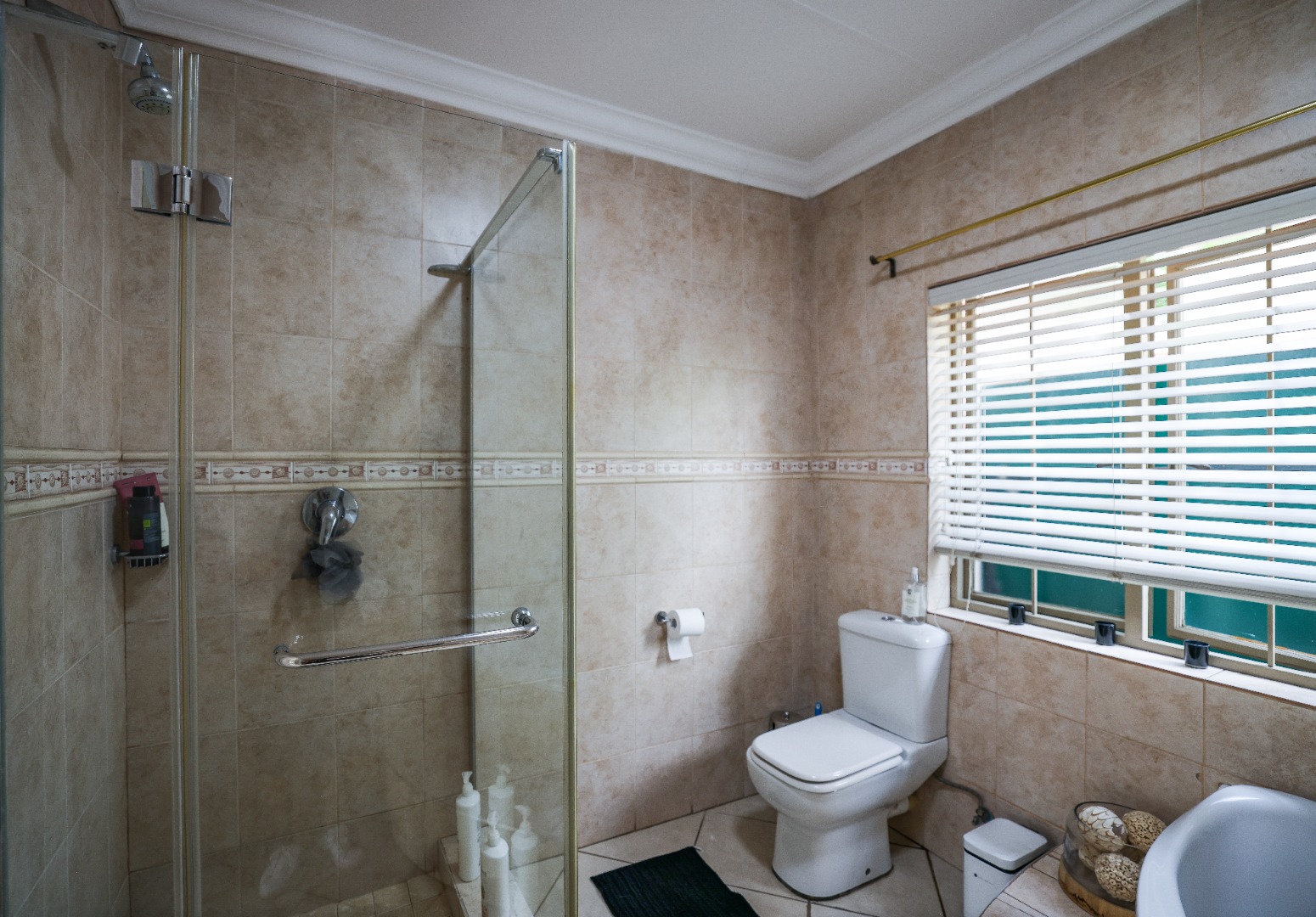 Step inside to discover multiple living areas, including a separate TV lounge and a dedicated braai room, ideal for entertaining all year around. A guest toilet and a private guest suite open directly onto the lush garden, creating a welcoming retreat for visitors. The open-plan dining area has a fireplace and flows seamlessly into the modern kitchen, fitted with beautiful cupboards, custom-made granite counters, AEG eye level oven, ceramic stove, pantry and a large scullery.