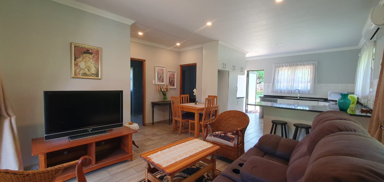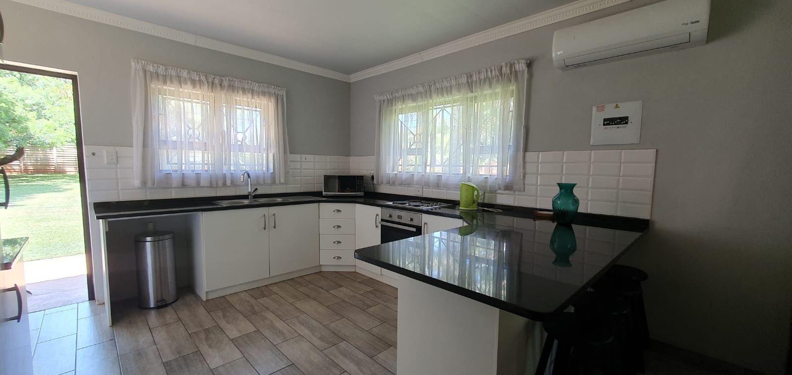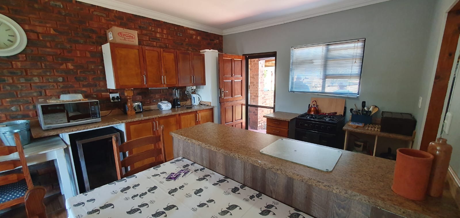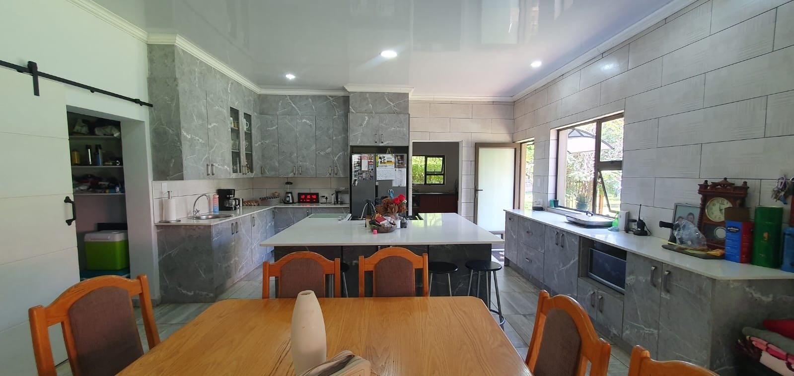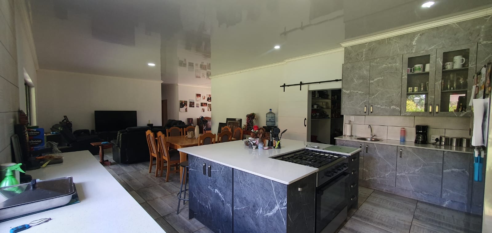 The open-plan kitchen is the heart of the home, complete with a large island, gas stove, scullery, and pantry, flowing through sliding doors to a patio with a built-in braai — ideal for relaxed entertaining.