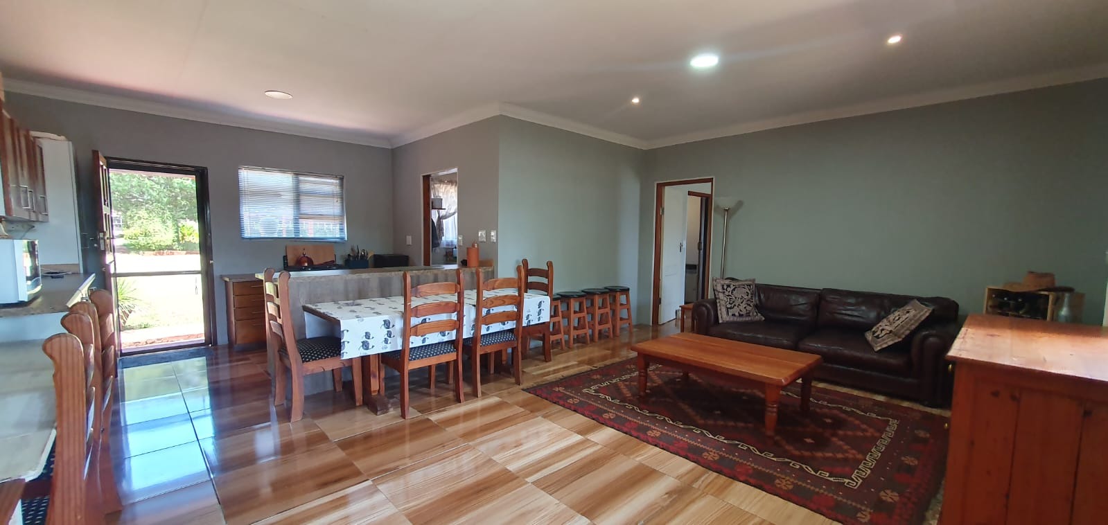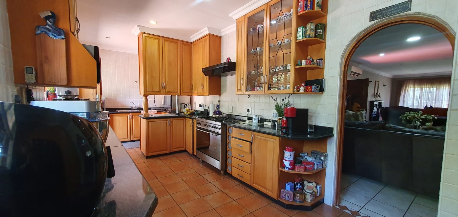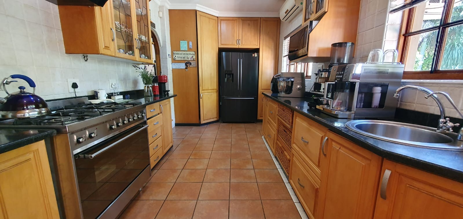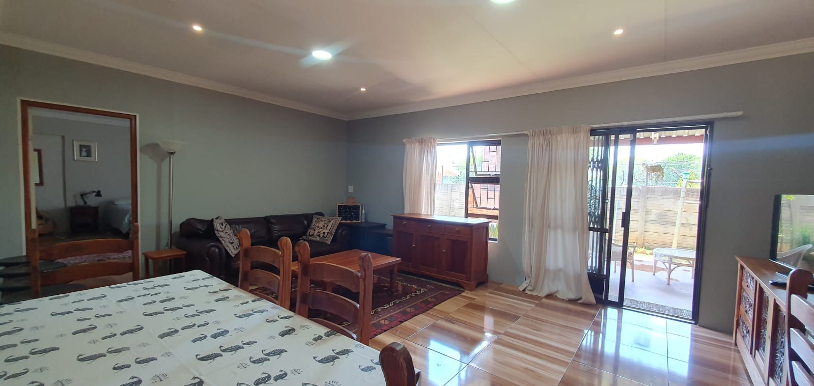 The open-plan kitchen is the heart of the home, complete with a large island, gas stove, scullery, and pantry, flowing through sliding doors to a patio with a built-in braai — ideal for relaxed entertaining.
