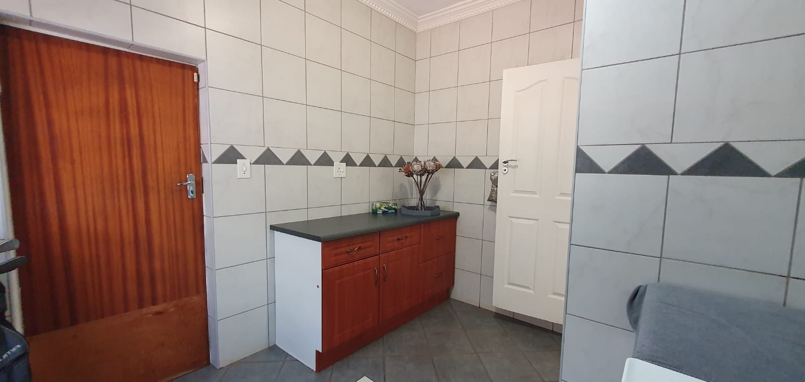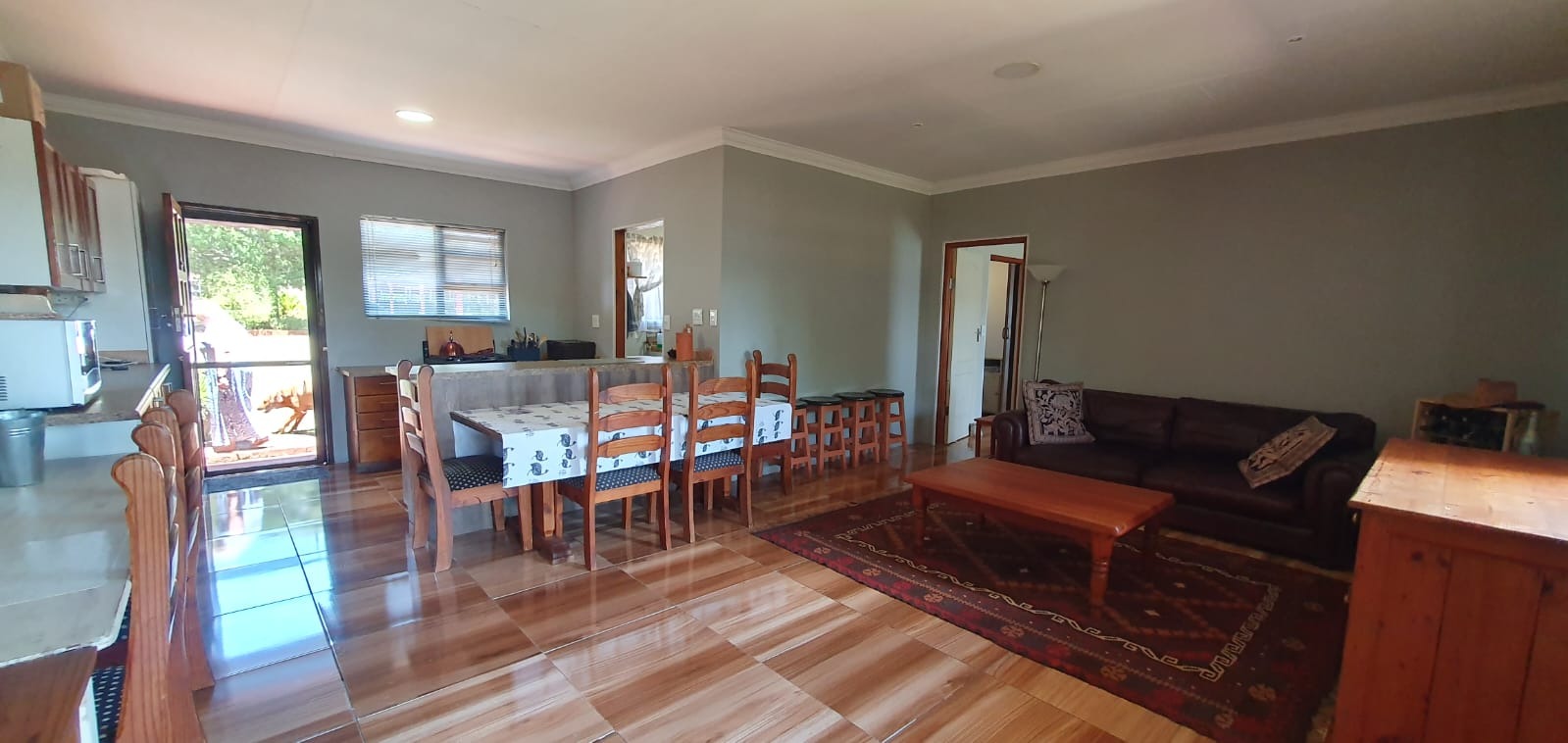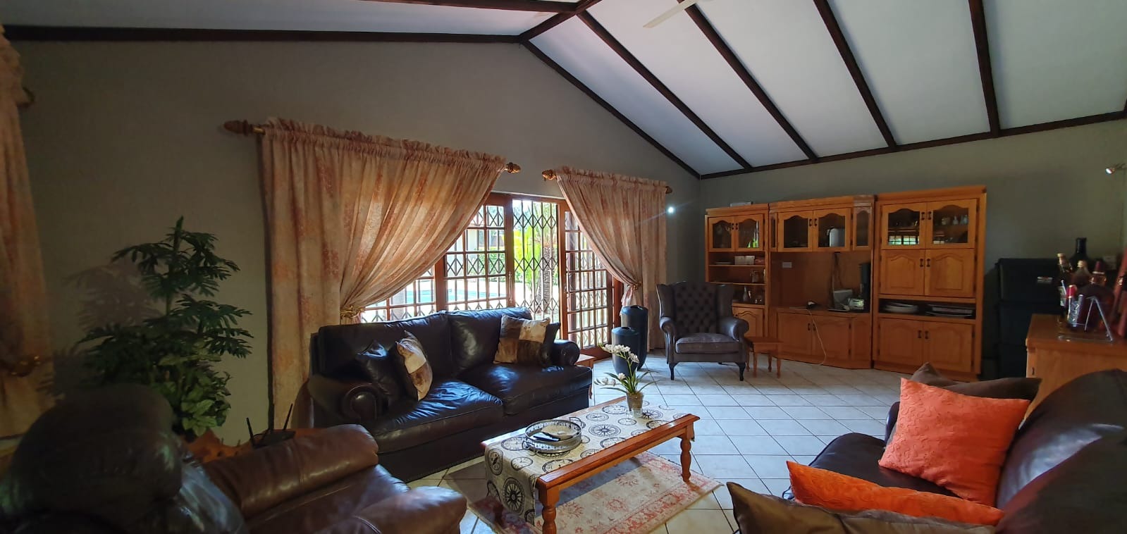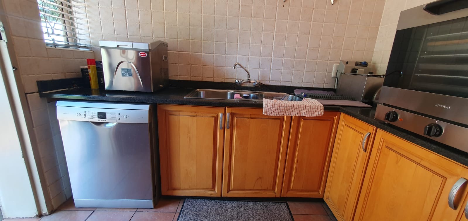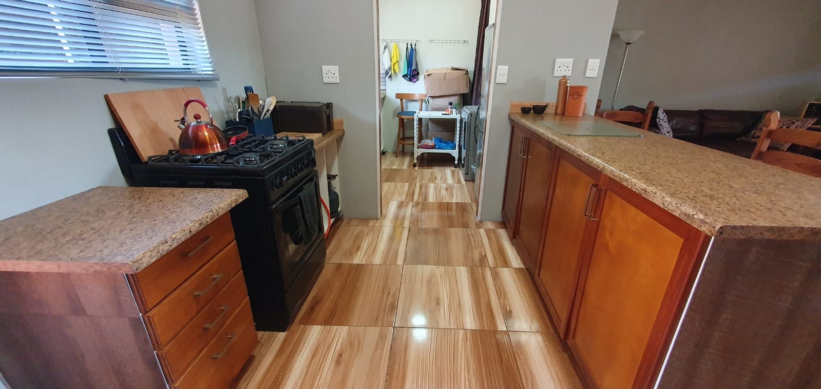 The open-plan kitchen is the heart of the home, complete with a large island, gas stove, scullery, and pantry, flowing through sliding doors to a patio with a built-in braai — ideal for relaxed entertaining.