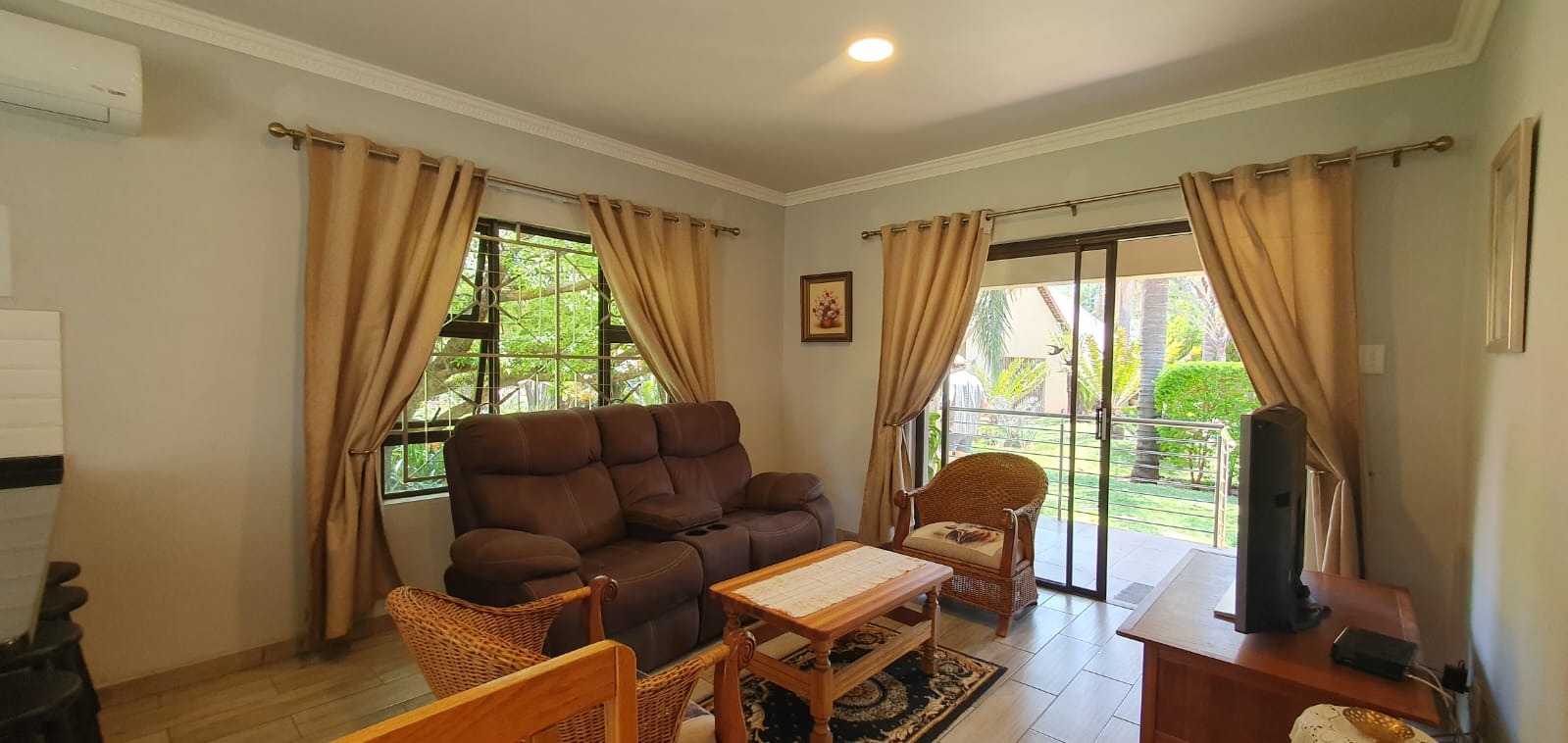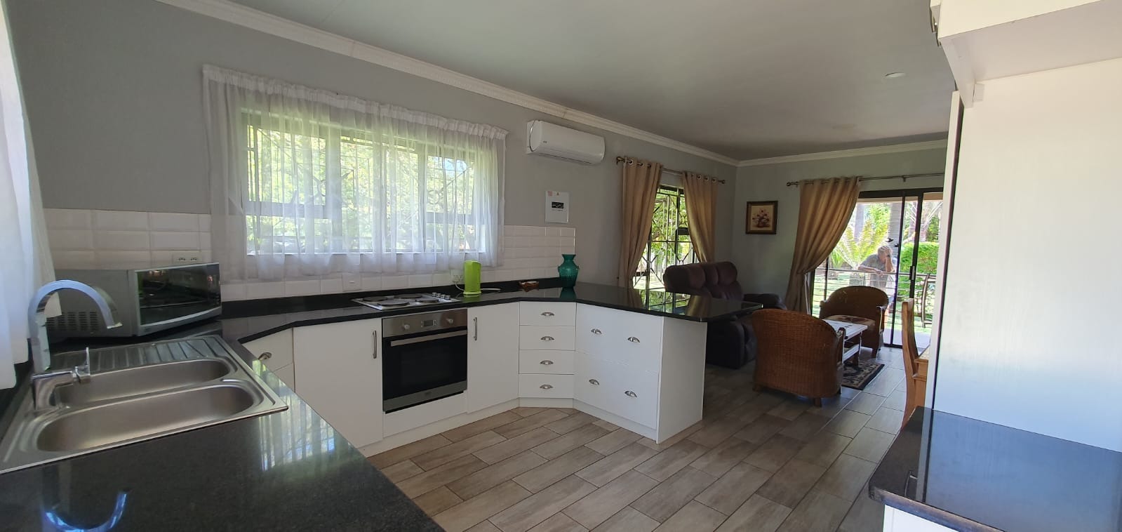 The open-plan kitchen, finished with granite countertops, flows seamlessly into the living area, enhanced by air-conditioning and large sliding doors that open onto a patio, creating a light, airy indoor-outdoor feel.