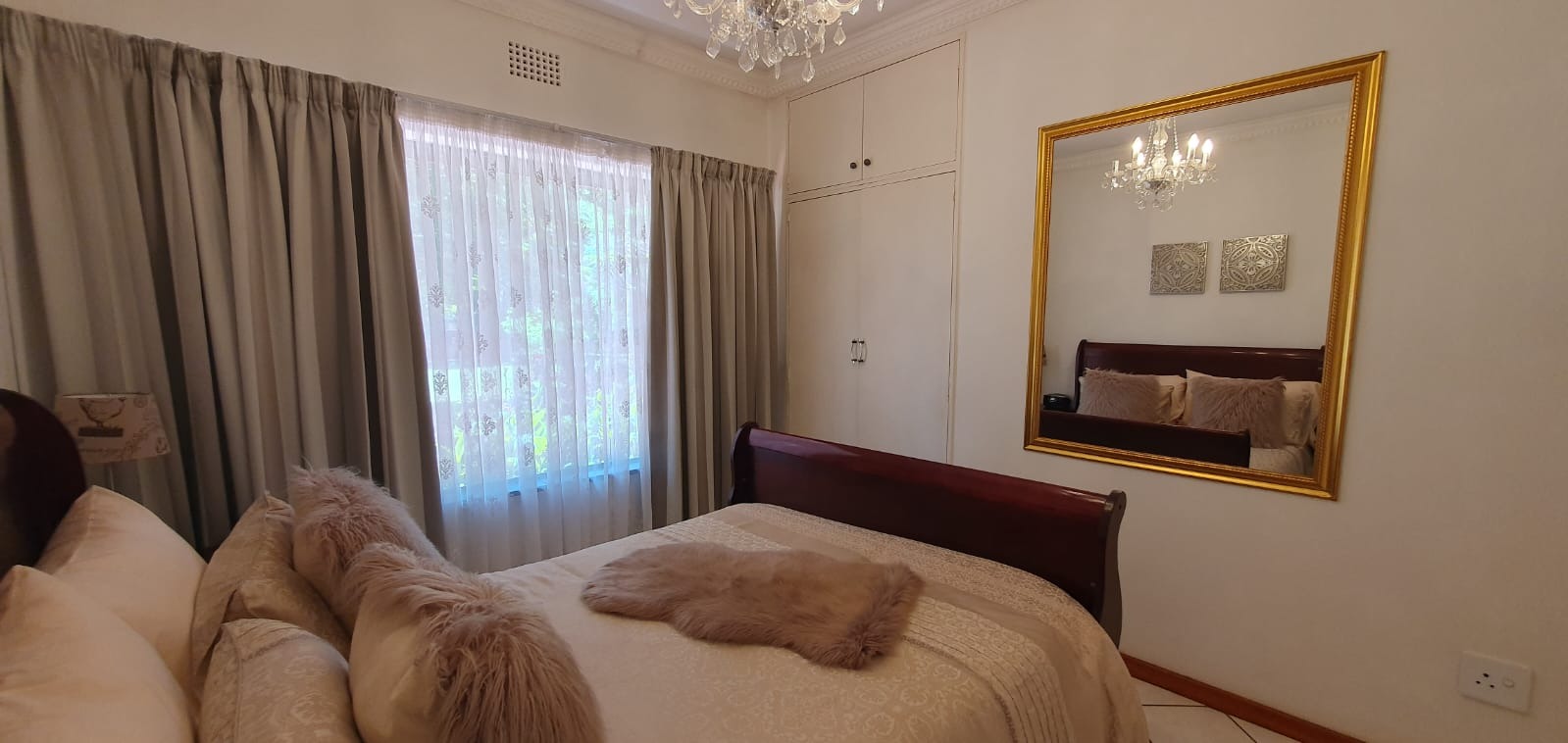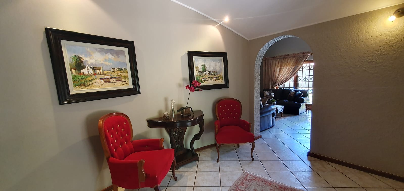 Inside, the home offers a welcoming entrance, formal lounge, additional lounge, and dining room, all enhanced by chandeliers, air-conditioning, and Trelidoors for comfort and security.