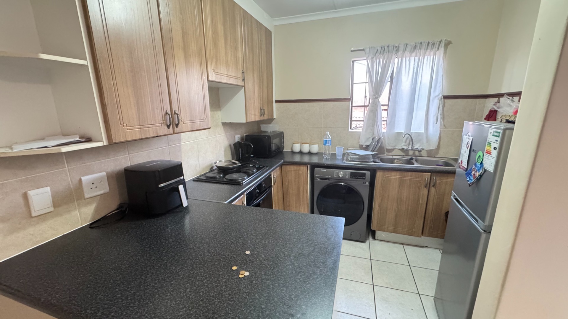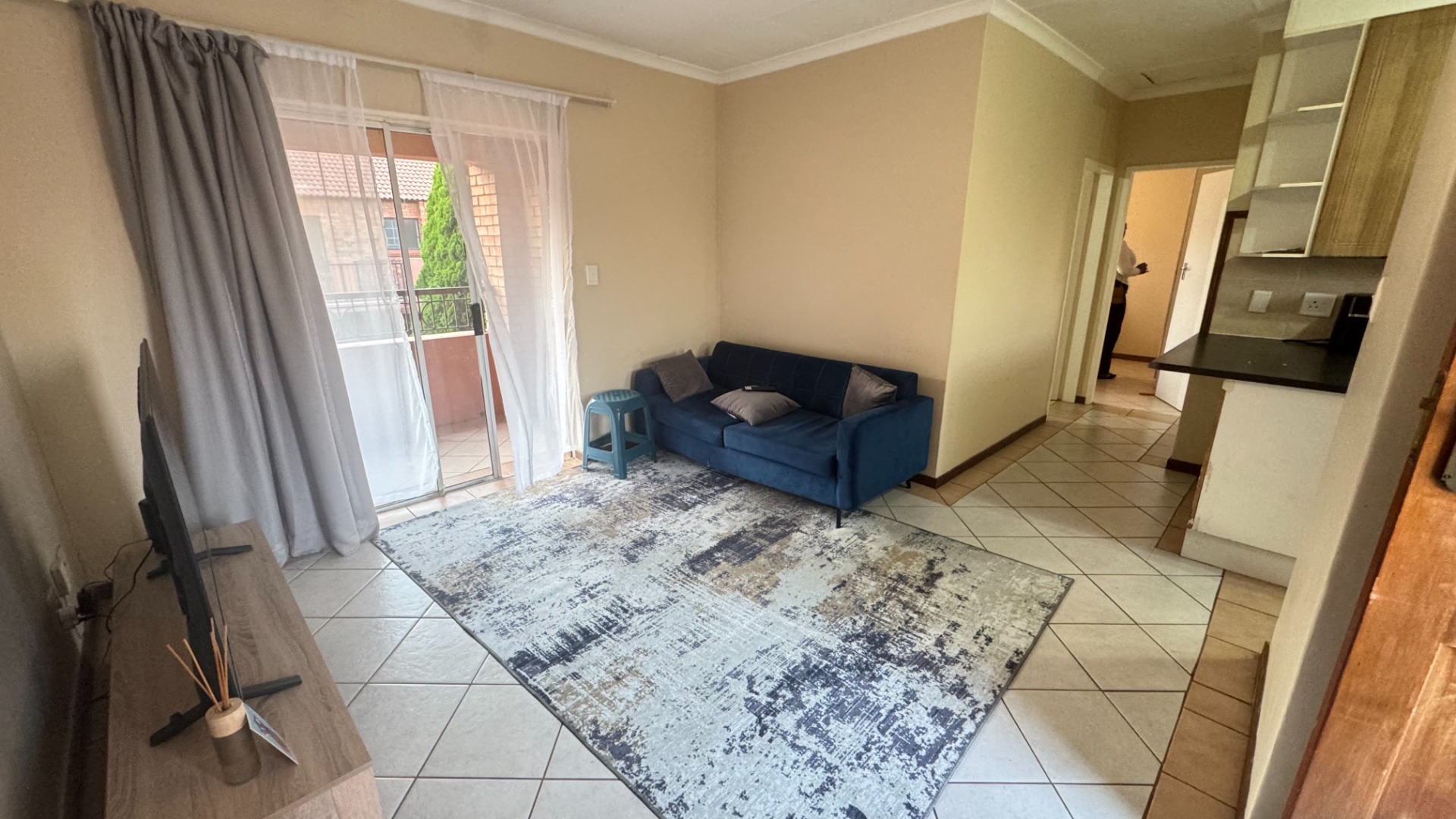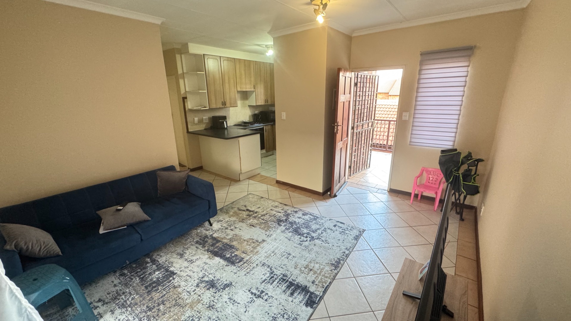 Lounge area and open-plan kitchen. All areas are tiled.