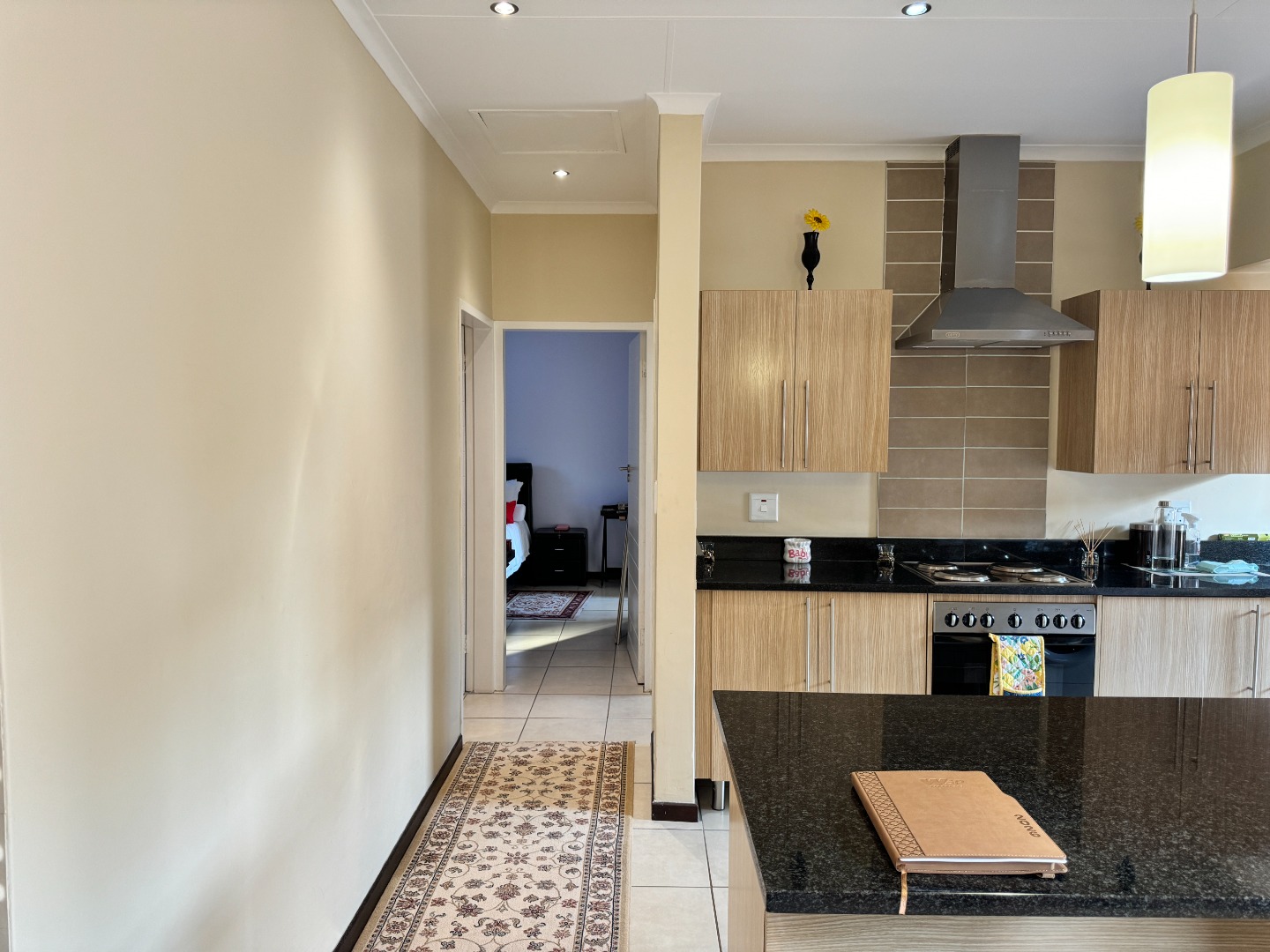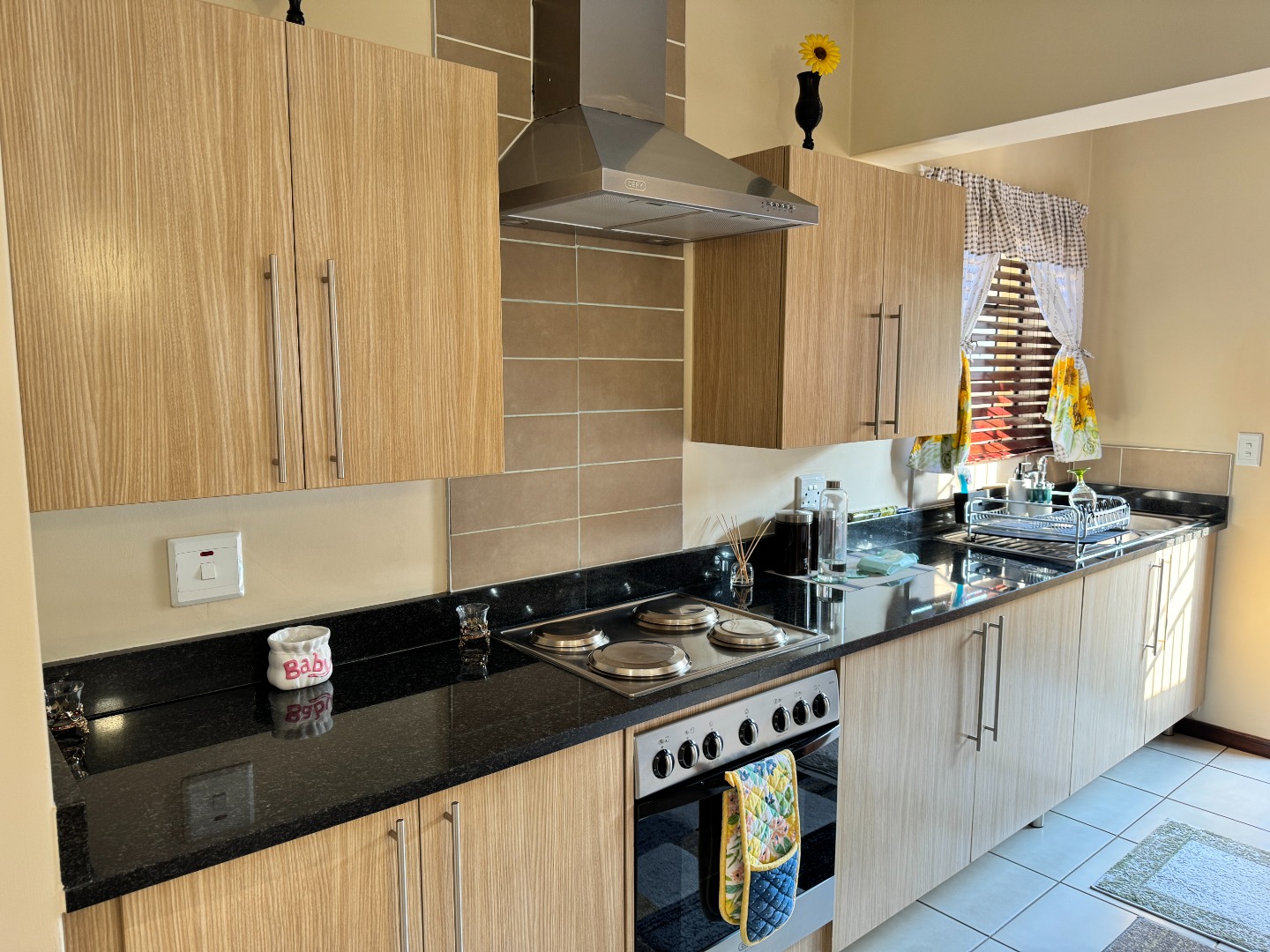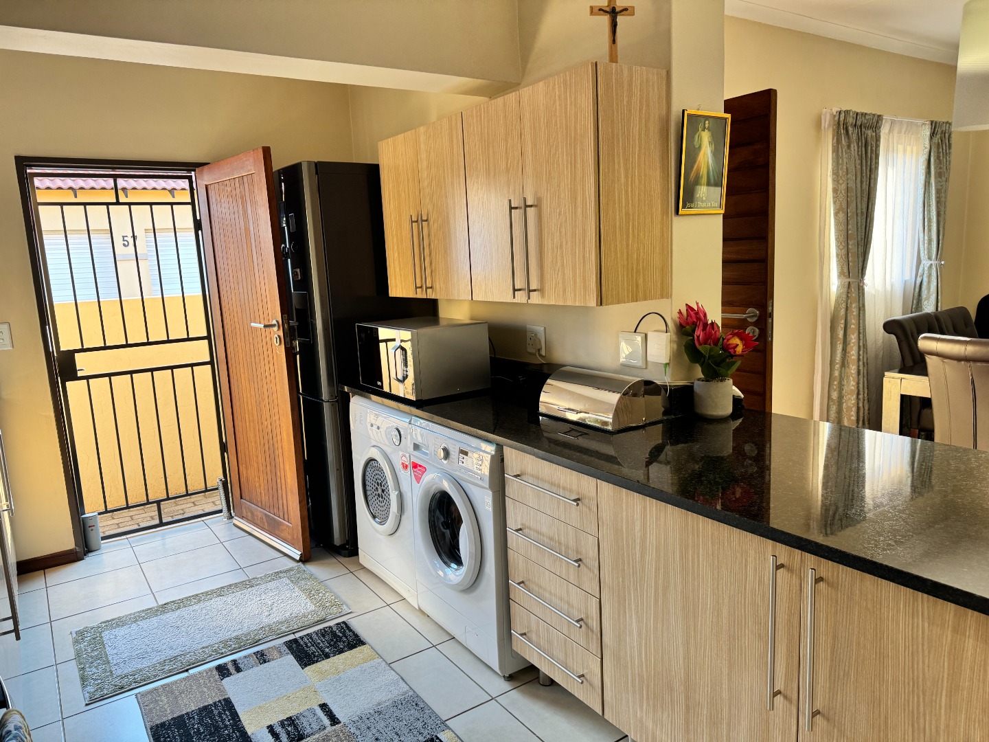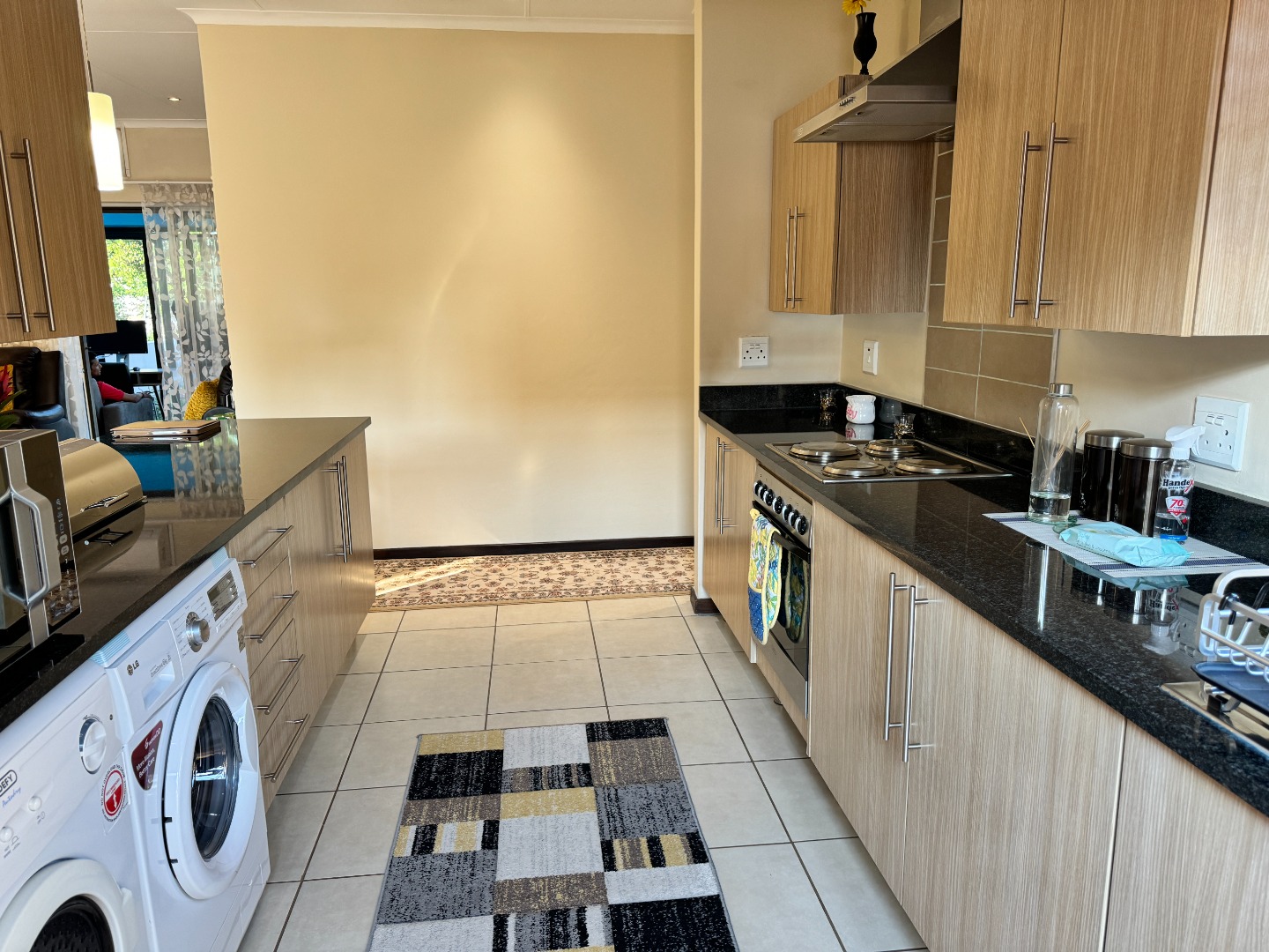 The heart of this home is its modern, open-plan kitchen, seamlessly connecting to the dining and lounge areas. The kitchen boasts stylish light wood-grain cabinetry, dark granite countertops, and a tiled backsplash. It comes equipped with an integrated hob, oven, and extractor fan, along with dedicated space for a washing machine, ensuring both functionality and aesthetic appeal. Tiled flooring throughout these living spaces enhances the clean, contemporary feel.