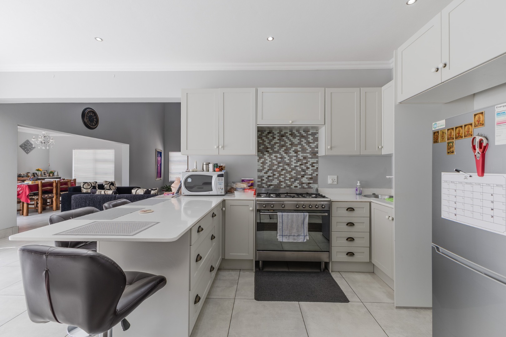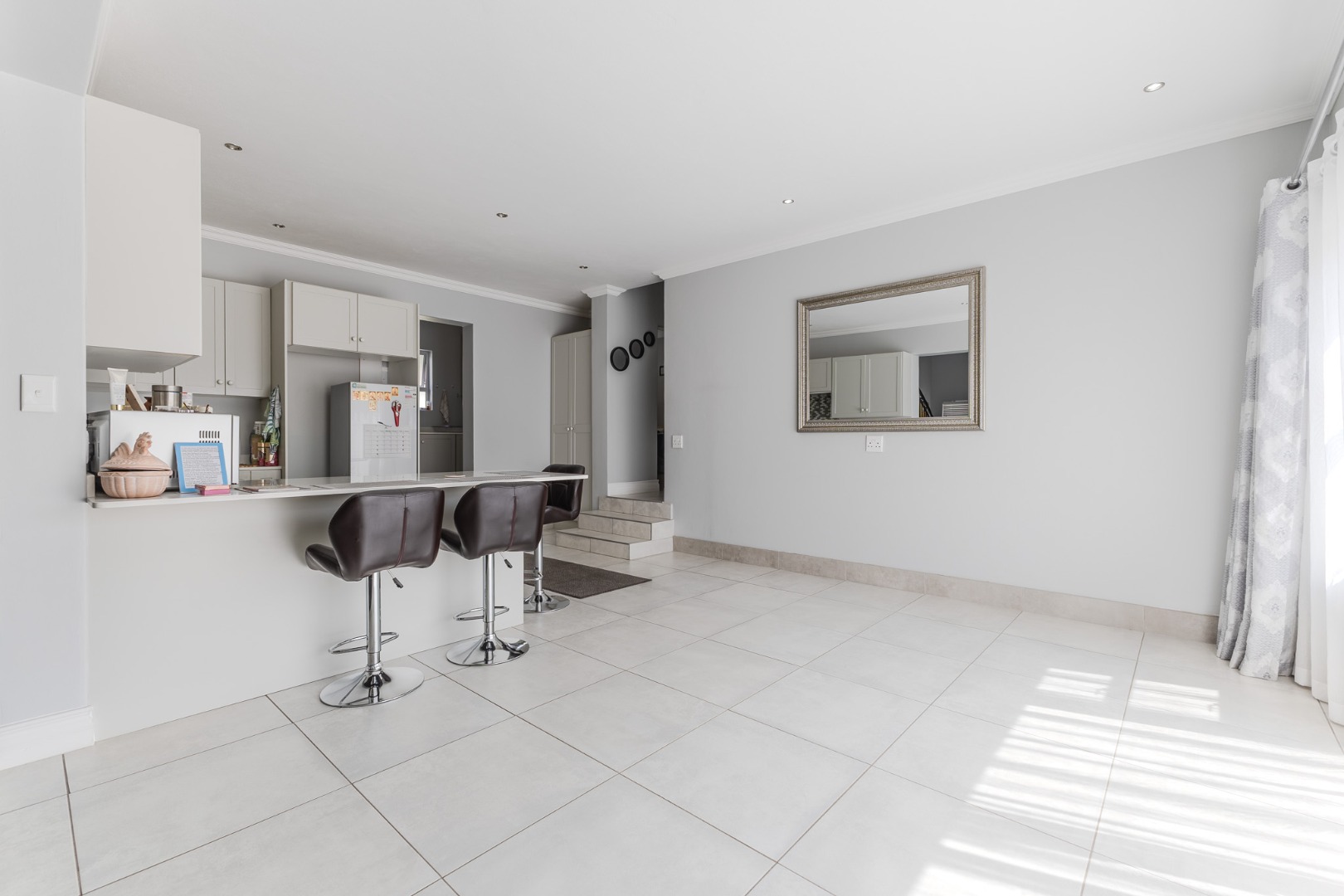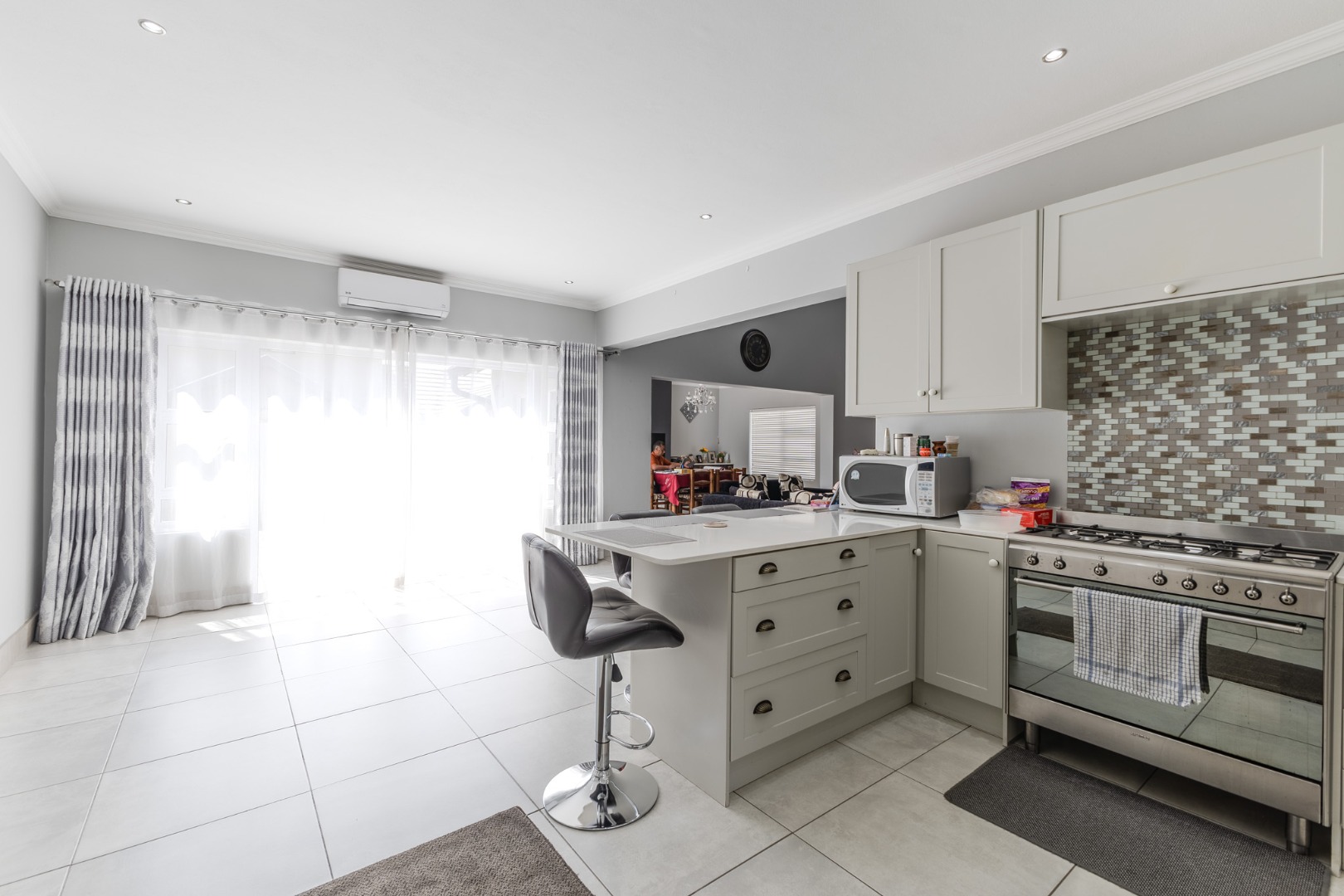 The home features a dedicated lounge, a spacious dining room, and a functional kitchen, all designed to accommodate both everyday family life and entertaining guests. Modern conveniences such as air conditioning ensure comfort throughout the seasons, while fibre connectivity supports contemporary living and remote work needs.