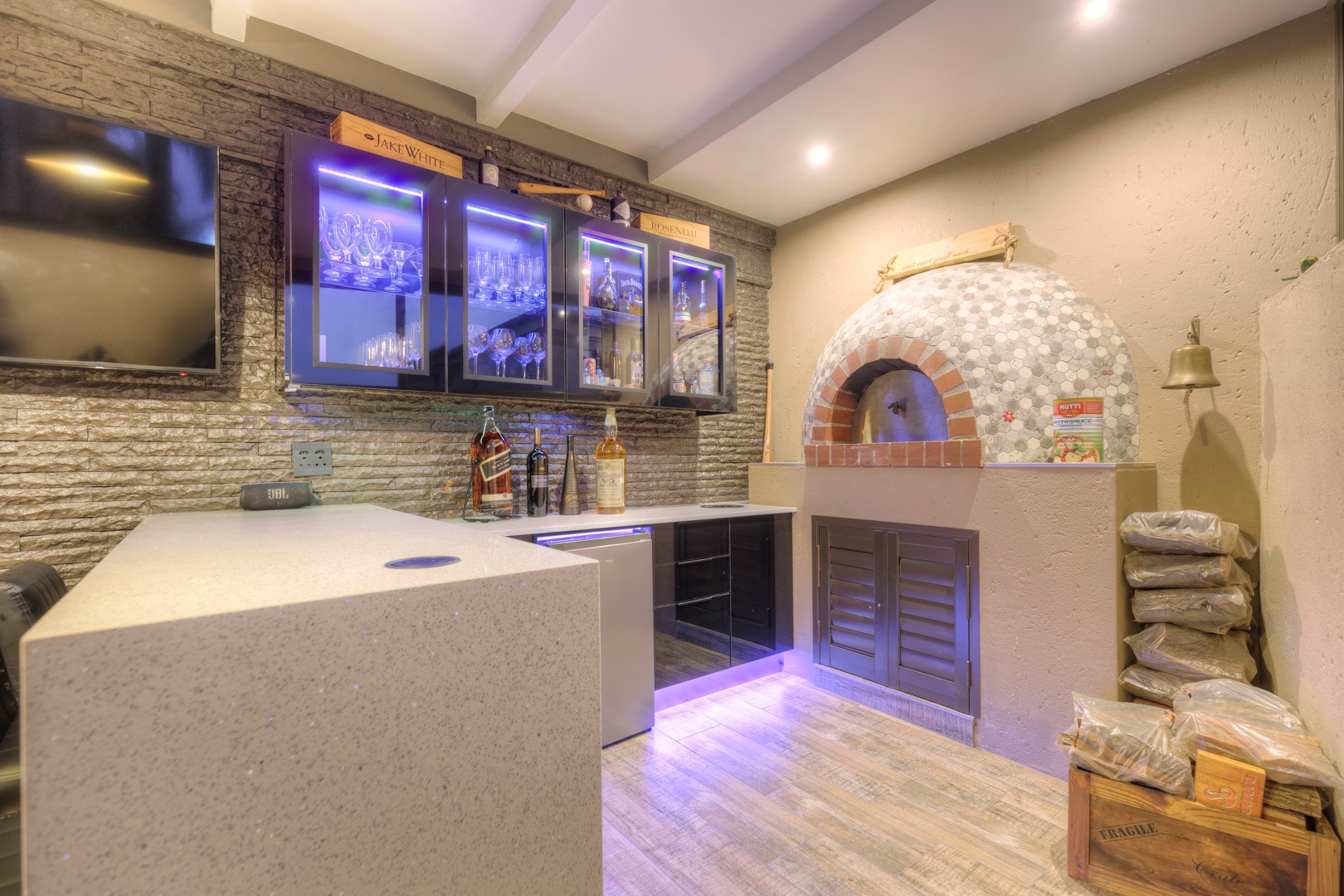 Step outside to a true entertainer’s paradise: a covered patio featuring a custom built-in bar, wood-fired pizza oven, and ample seating areas – all overlooking a heated swimming pool encased in stylish composite decking for a seamless, low-maintenance finish. This outdoor haven is ideal for year-round entertaining, offering comfort, style, and functionality.
