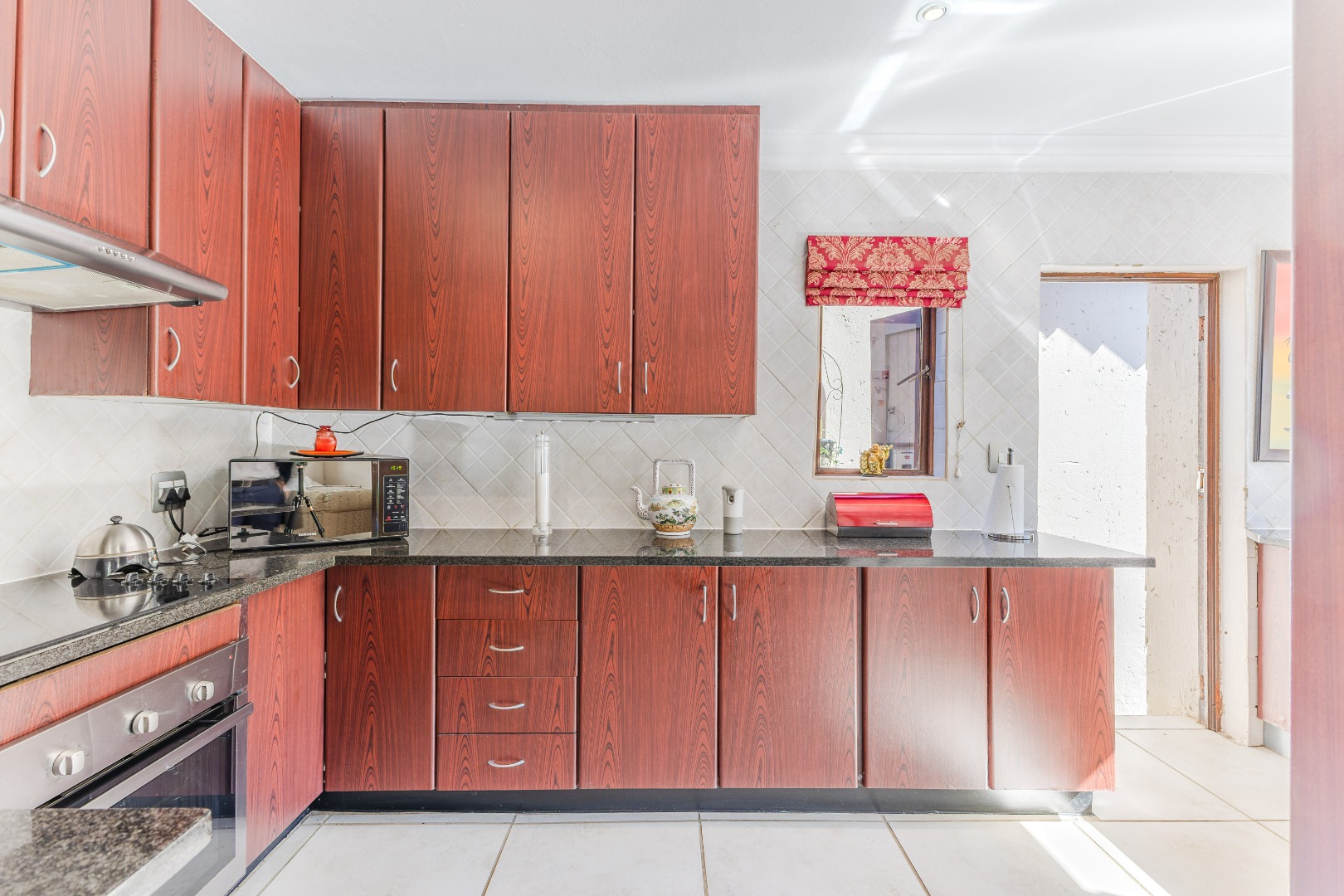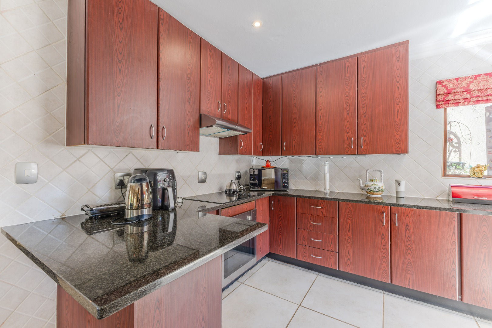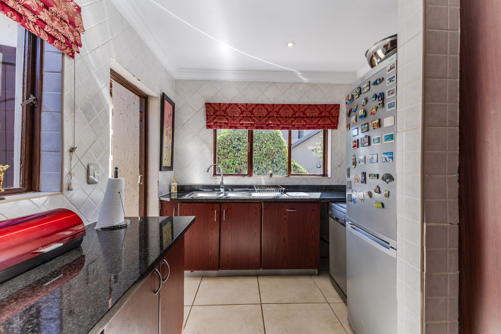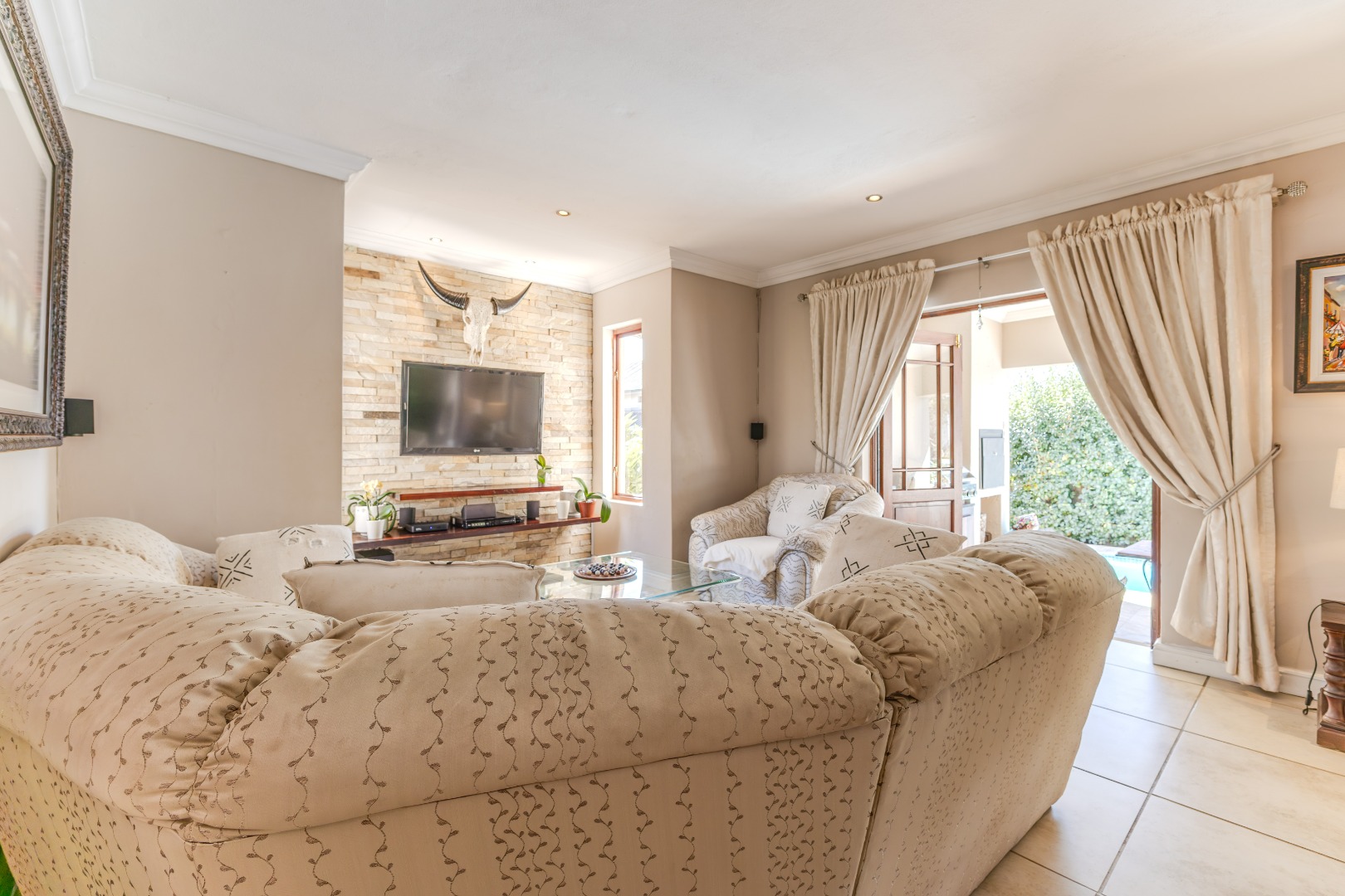 The heart of the home lies in its expansive entertainment area. A large, covered patio with built-in braai opens to a sparkling pool – the perfect backdrop for weekend gatherings or relaxing afternoons. The kitchen, cleverly positioned just off the dining and TV rooms, ensures the cook is always part of the conversation. Whether it’s a casual get-together or a celebration with friends, this home knows how to host in style.