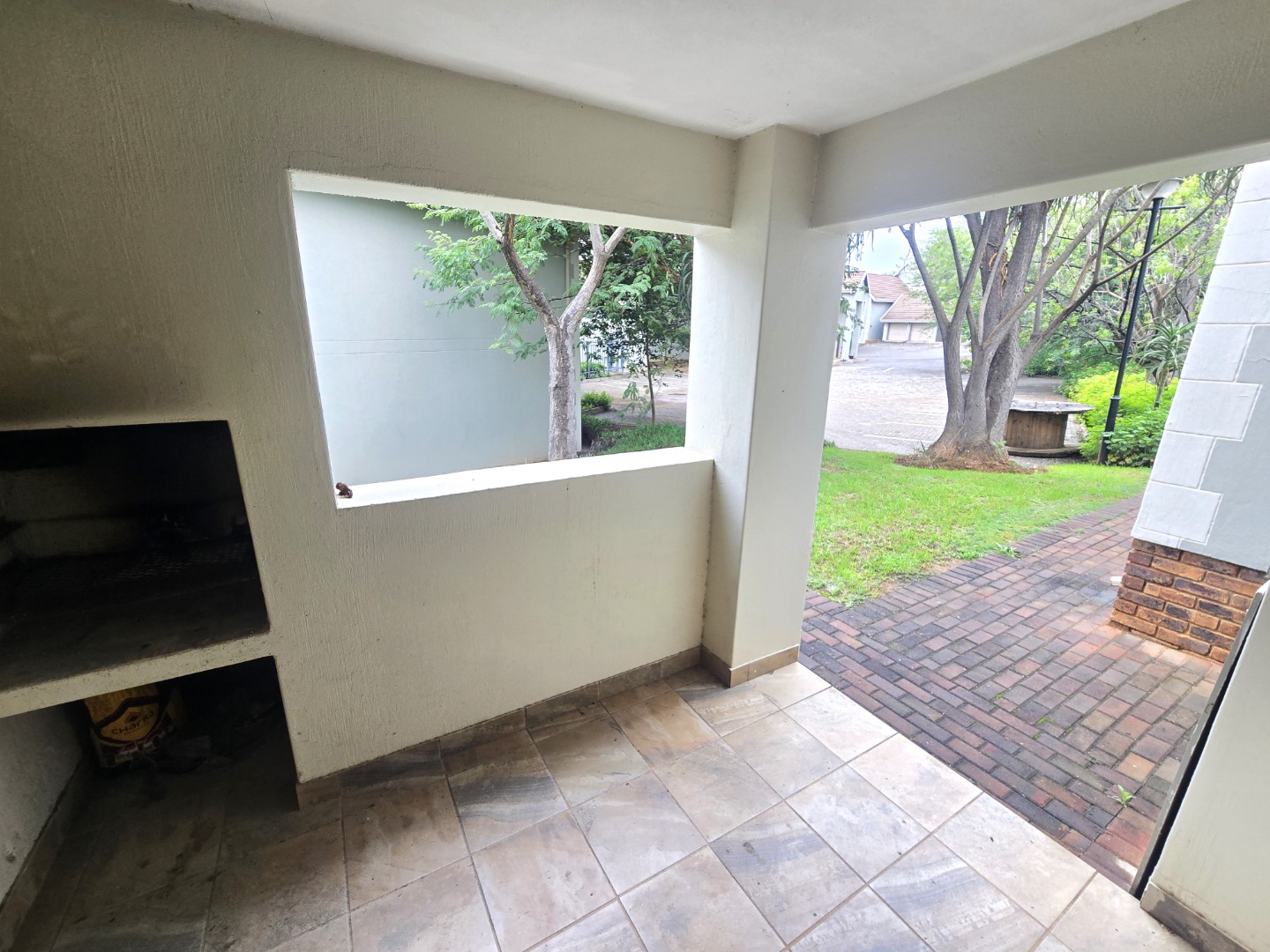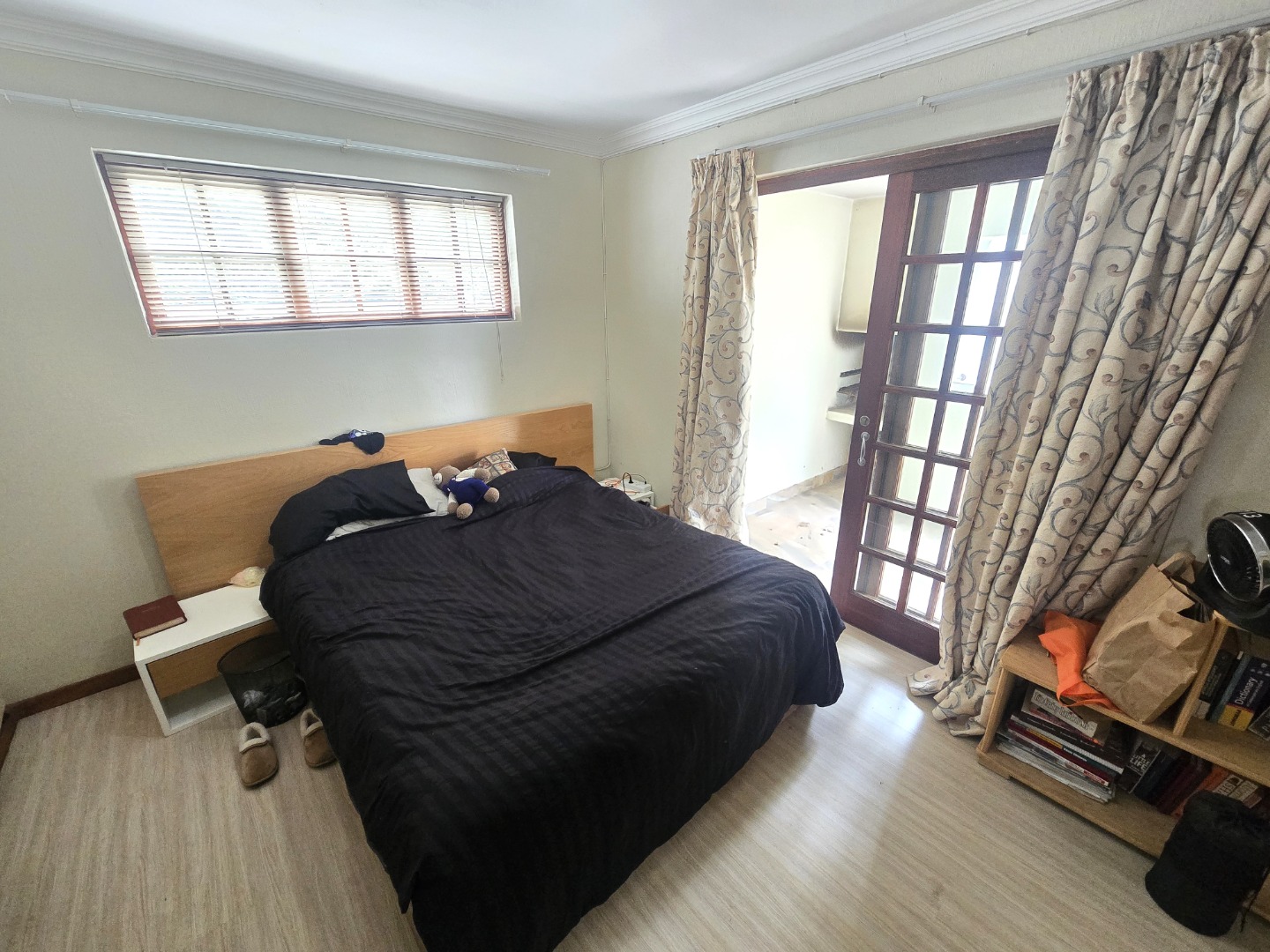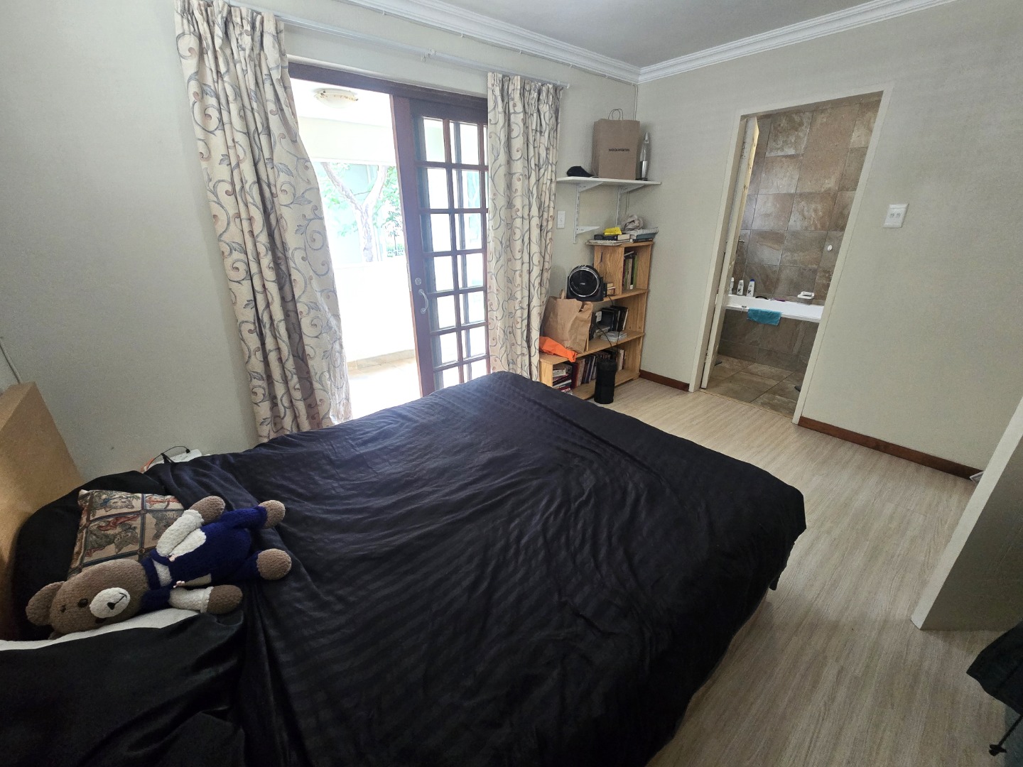 The spacious bedroom with laminated floors leads to a covered patio with braai and direct access to beautiful park-like gardens.