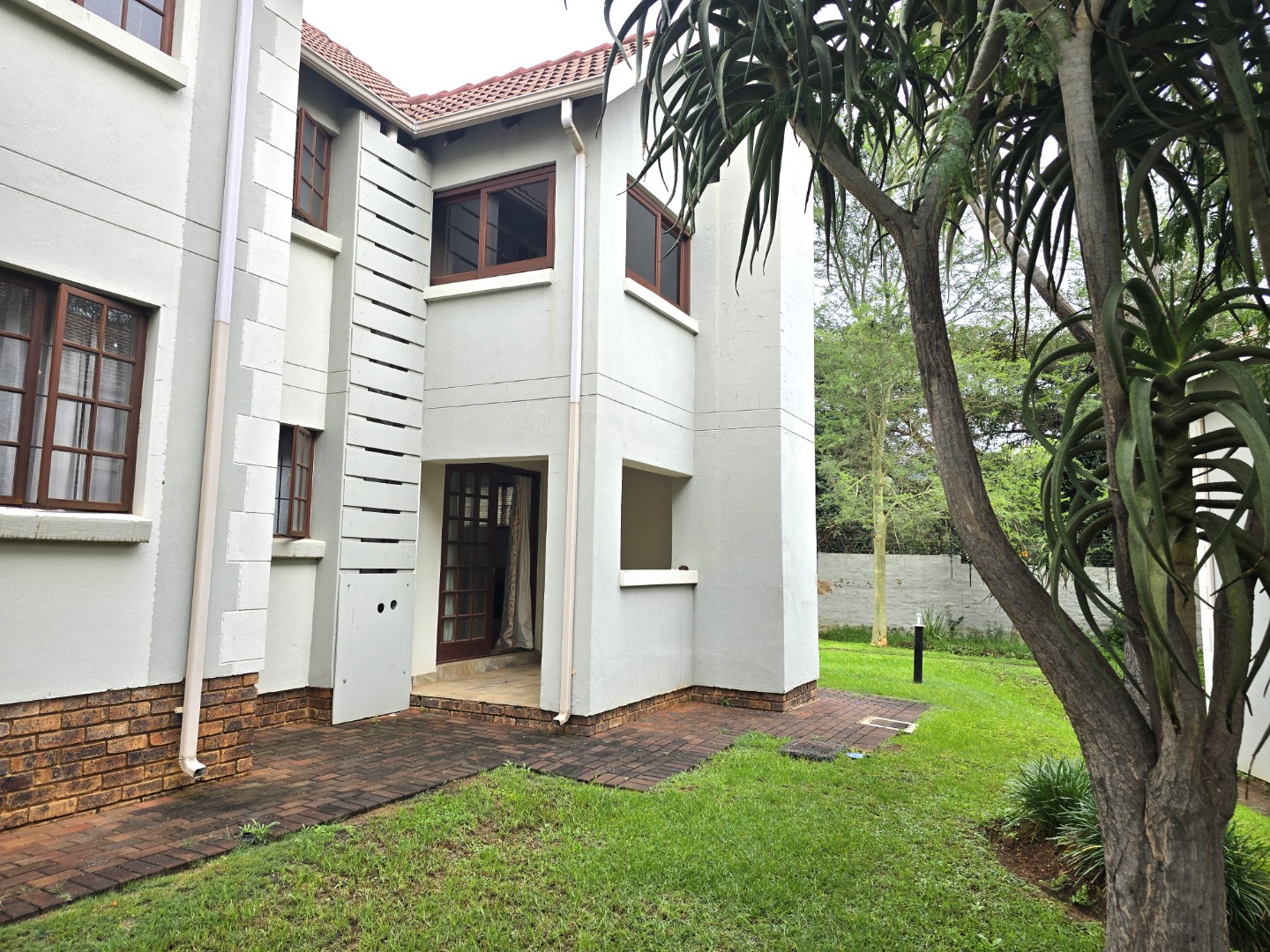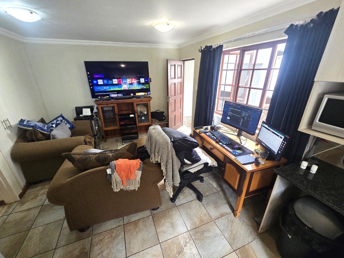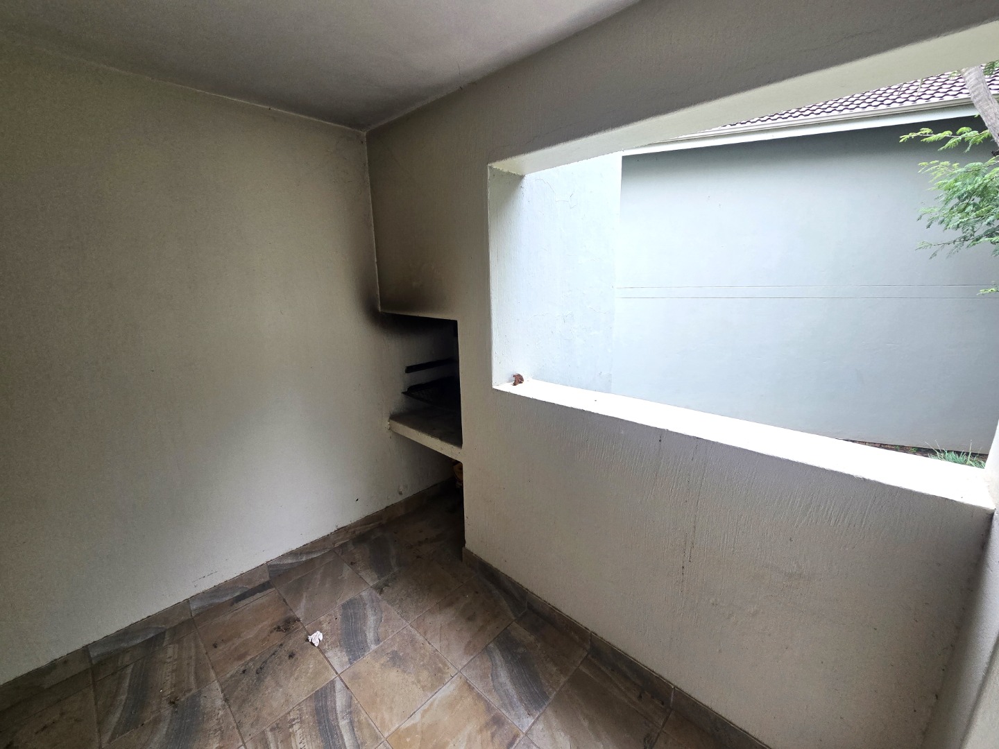 The spacious bedroom with laminated floors leads to a covered patio with braai and direct access to beautiful park-like gardens.