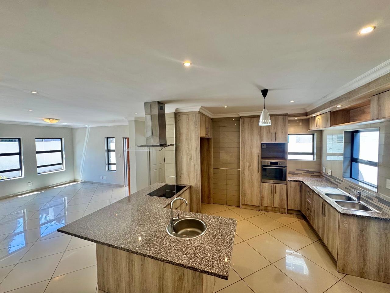 The open-plan living and dining areas are bathed in Natural lighting, flowing seamlessly from the Contemporary kitchen.