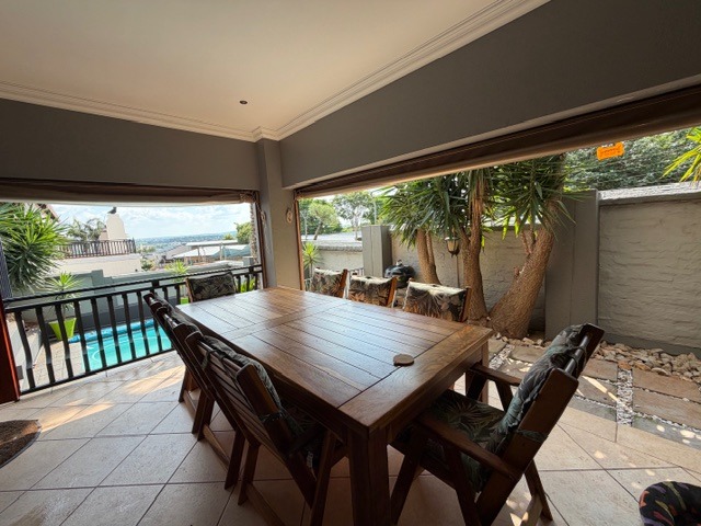 Outdoor living is a highlight, with a private swimming pool and deck area for relaxation. Multiple entertaining spaces include a covered ground-floor patio with a built-in braai and a second-story balcony offering scenic views. A lush, private garden and an enclosed courtyard with a fire pit provide diverse options for outdoor enjoyment, complemented by a jacuzzi.