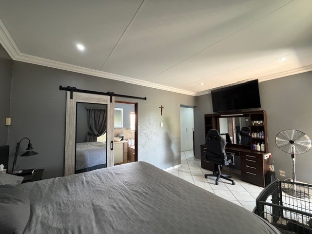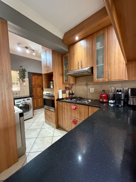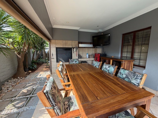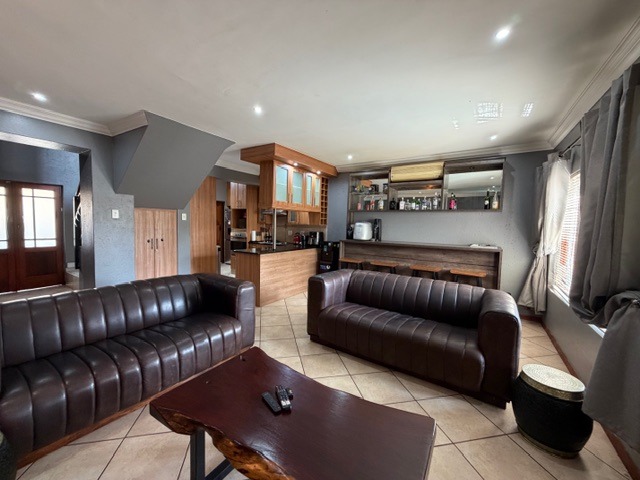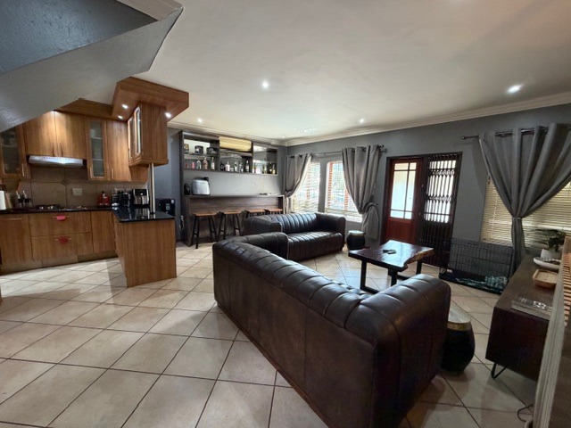 Discover this modern family home in a secure Olympus AH estate, Pretoria. The attractive contemporary facade with a double wooden garage door and landscaped entrance creates a welcoming first impression. Inside, an inviting open-plan living and entertainment area features tiled flooring and recessed lighting, flowing seamlessly into the kitchen and a dedicated built-in bar, perfect for social gatherings.