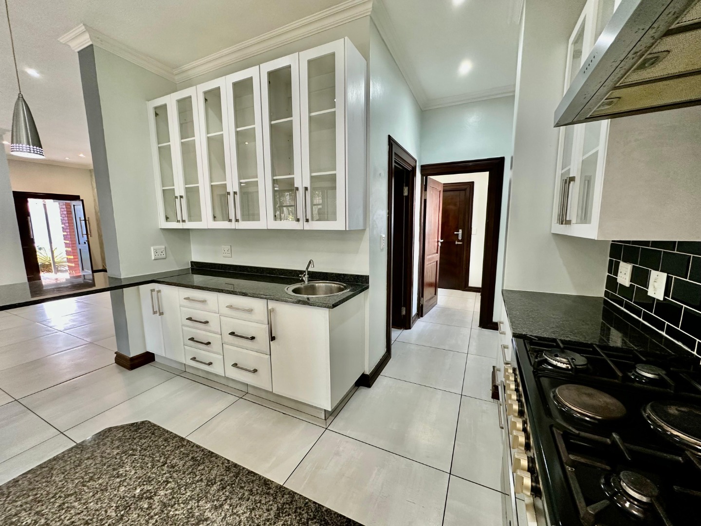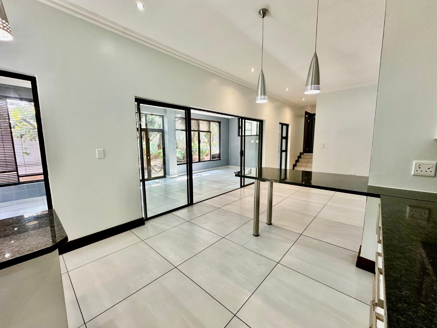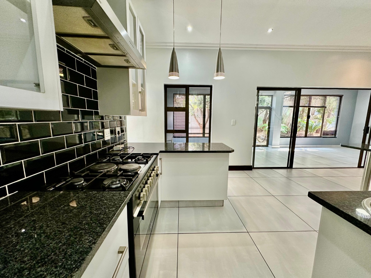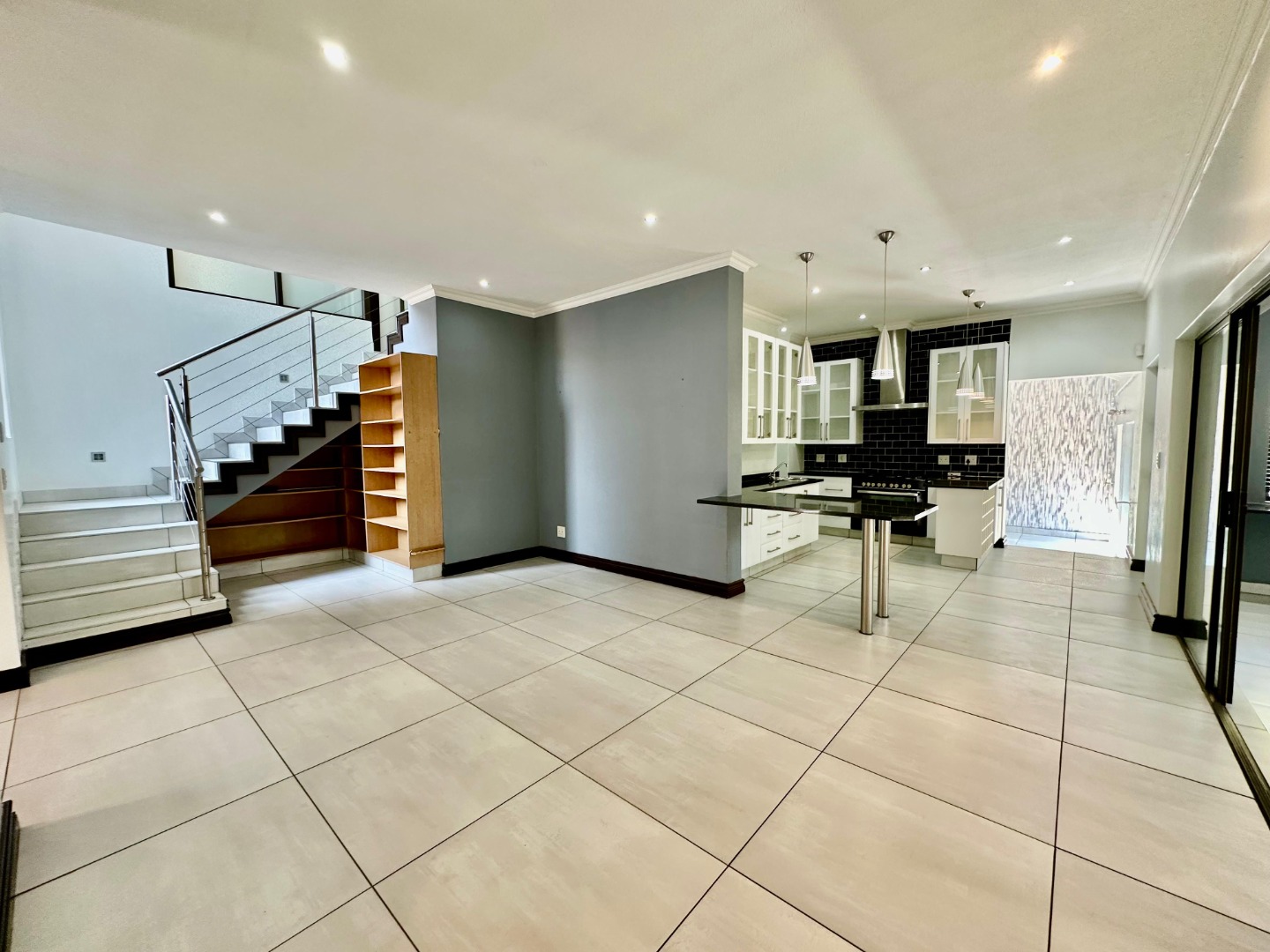 The interior unfolds into a bright and expansive open-plan layout, featuring light-colored tiled flooring and neutral walls throughout. Large glass sliding doors invite abundant natural light and offer seamless access to the garden and pool area. The heart of the home is a sleek, modern kitchen equipped with white cabinetry, dark granite countertops, a stylish black subway tile backsplash, and a gas stove, complemented by a convenient pantry. A contemporary staircase with stainless steel railing and built-in shelving adds to the sophisticated design.