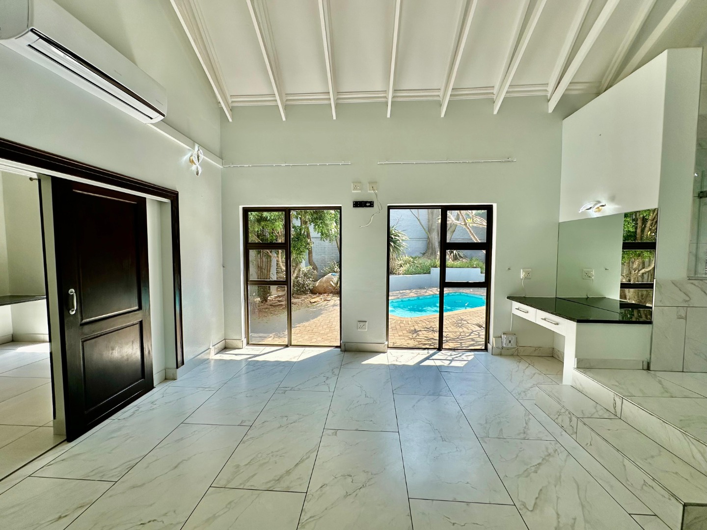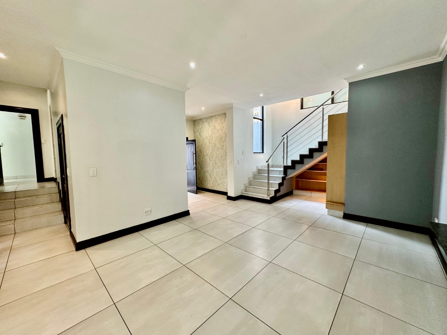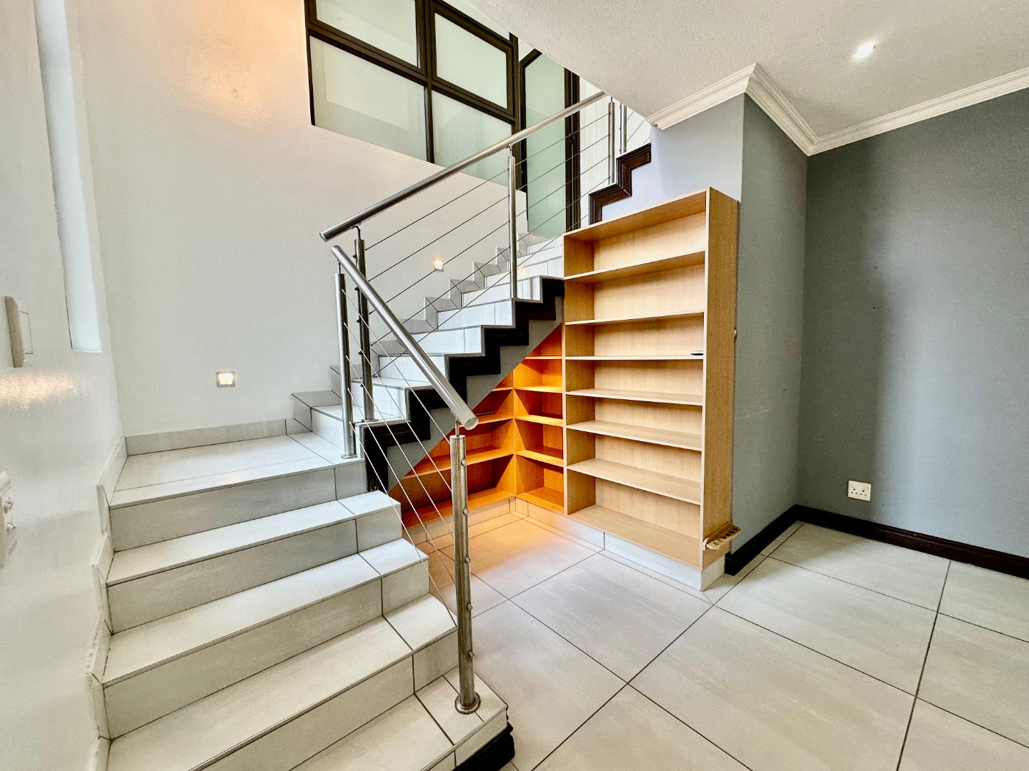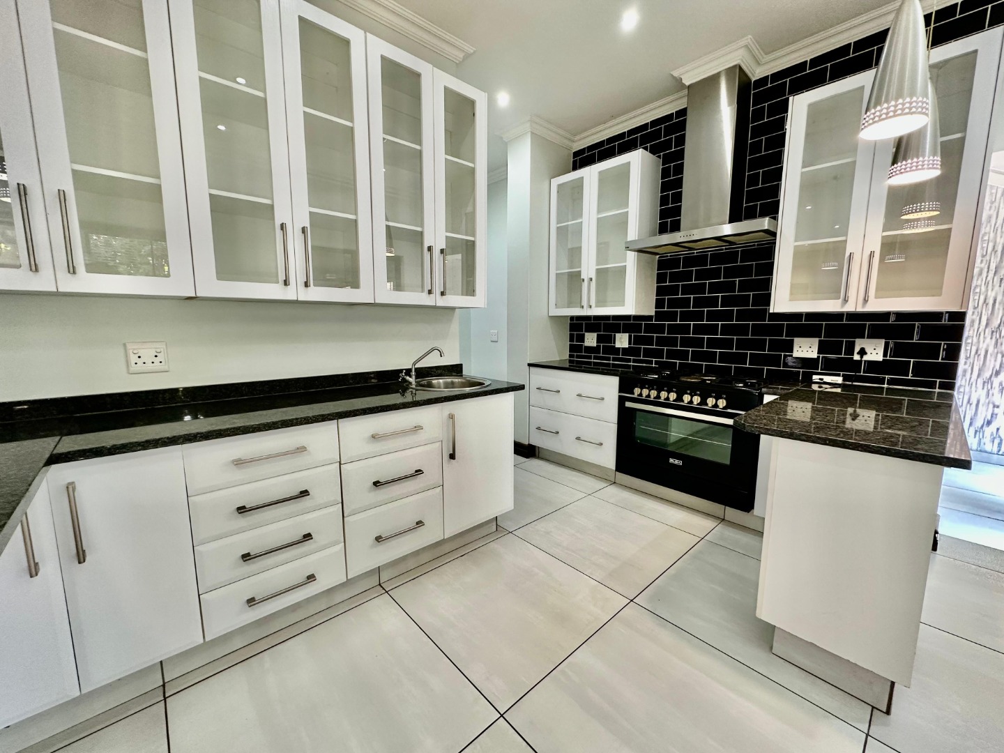 The interior unfolds into a bright and expansive open-plan layout, featuring light-colored tiled flooring and neutral walls throughout. Large glass sliding doors invite abundant natural light and offer seamless access to the garden and pool area. The heart of the home is a sleek, modern kitchen equipped with white cabinetry, dark granite countertops, a stylish black subway tile backsplash, and a gas stove, complemented by a convenient pantry. A contemporary staircase with stainless steel railing and built-in shelving adds to the sophisticated design.