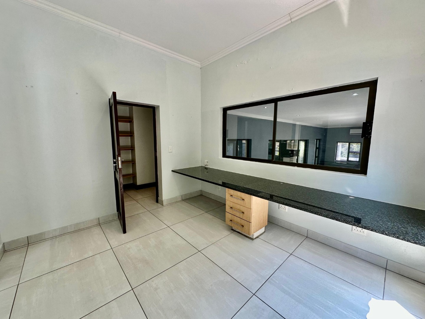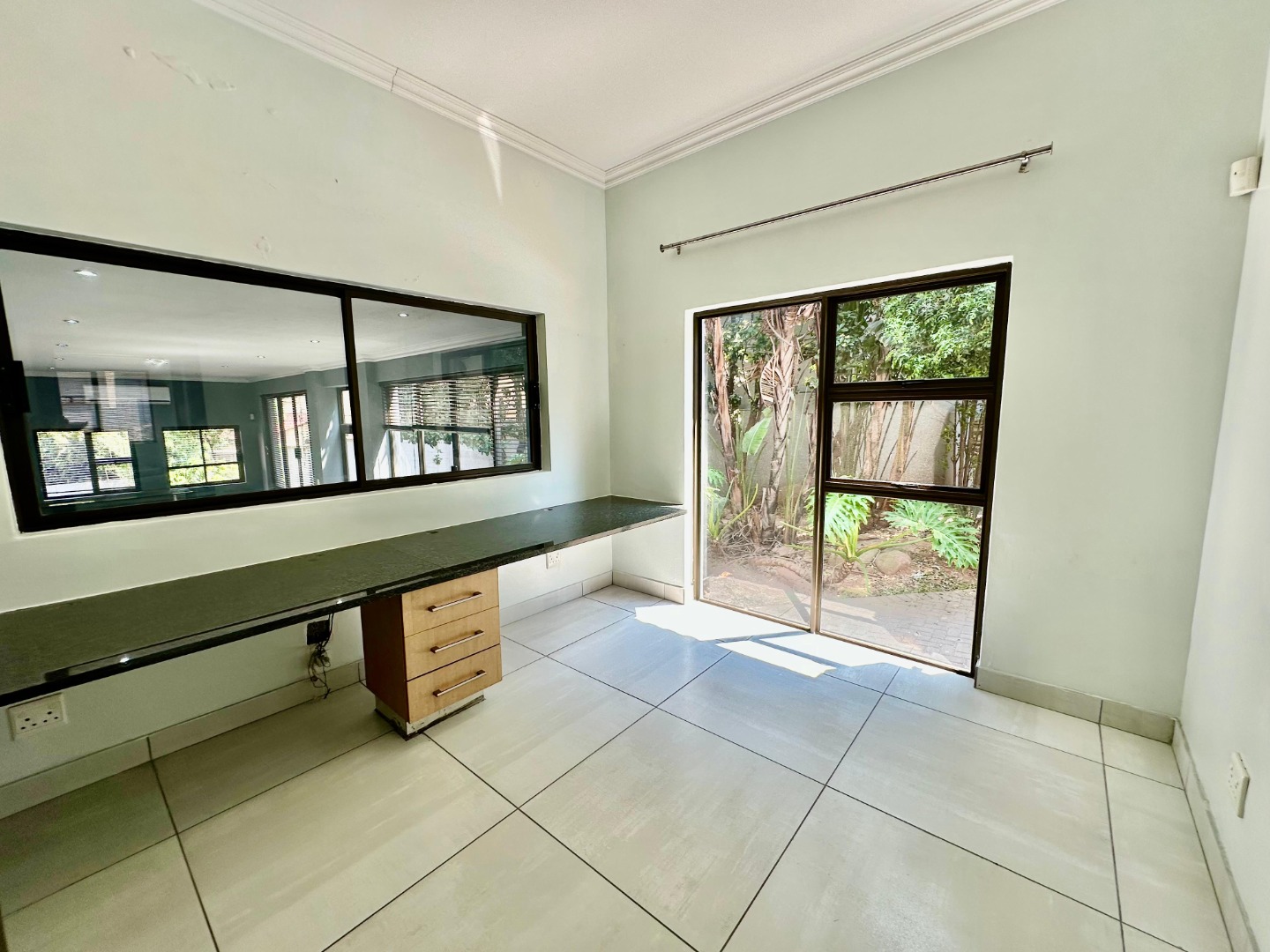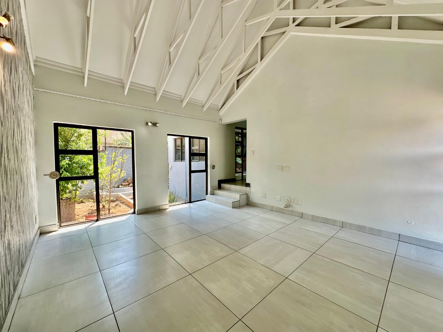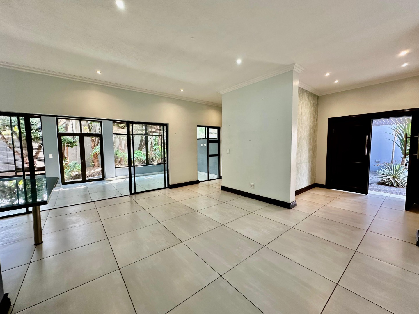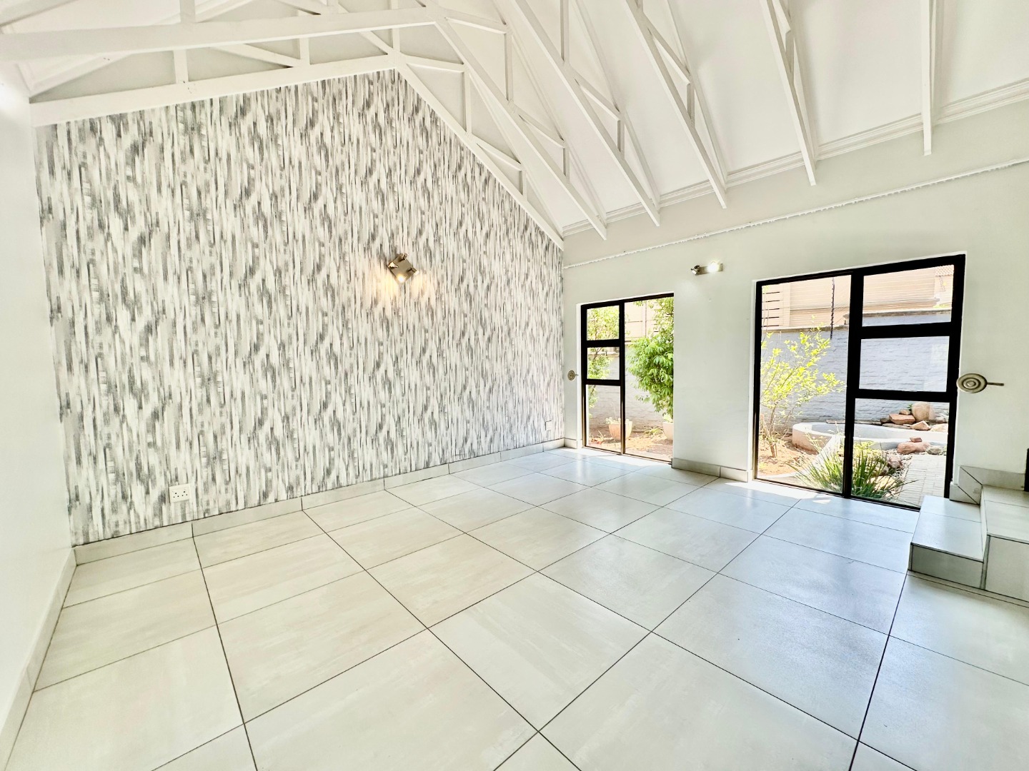 The interior unfolds into a bright and expansive open-plan layout, featuring light-colored tiled flooring and neutral walls throughout. Large glass sliding doors invite abundant natural light and offer seamless access to the garden and pool area. The heart of the home is a sleek, modern kitchen equipped with white cabinetry, dark granite countertops, a stylish black subway tile backsplash, and a gas stove, complemented by a convenient pantry. A contemporary staircase with stainless steel railing and built-in shelving adds to the sophisticated design.