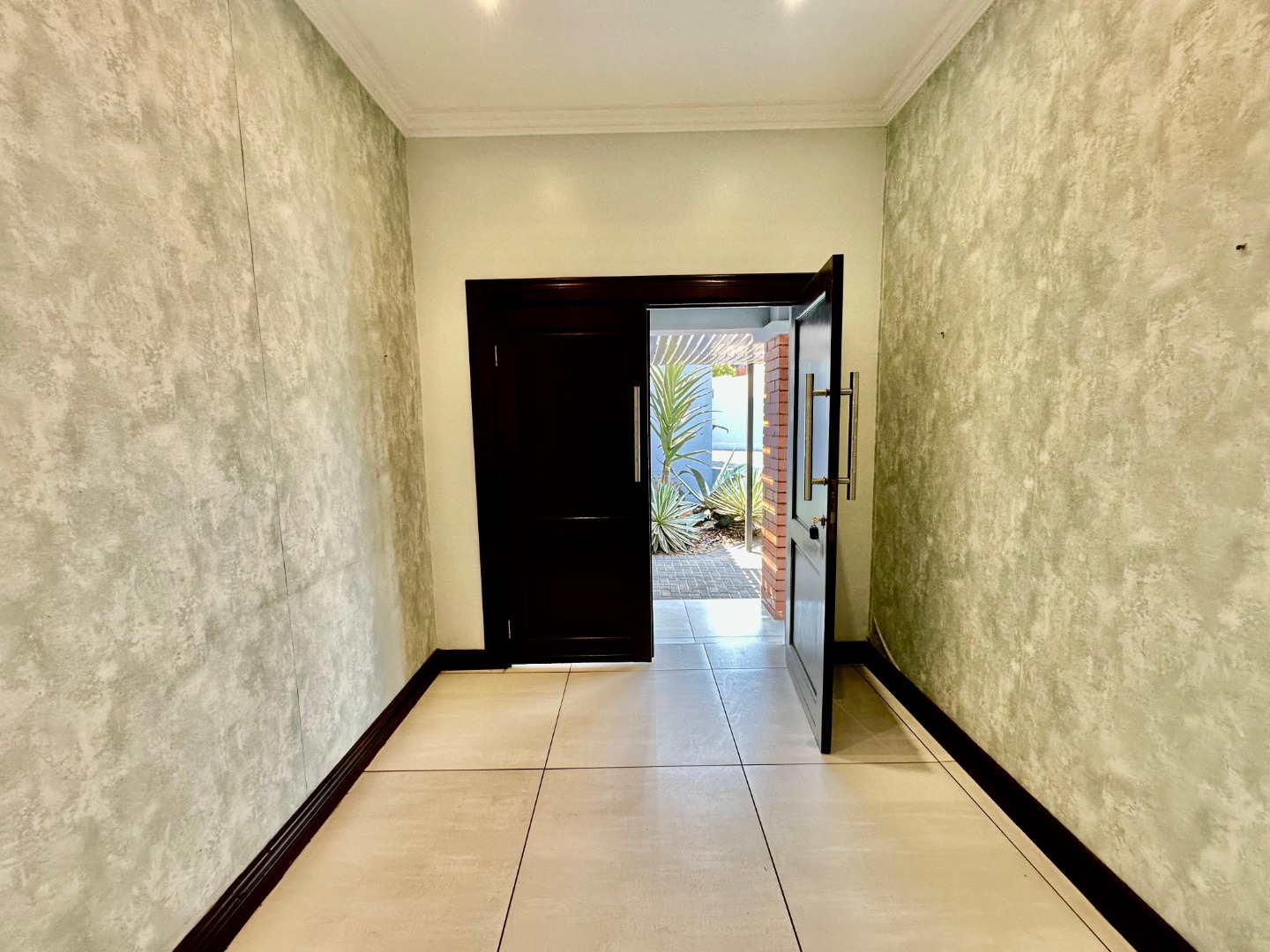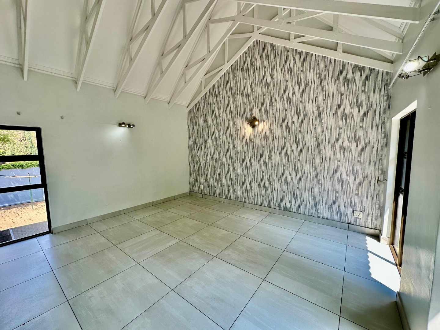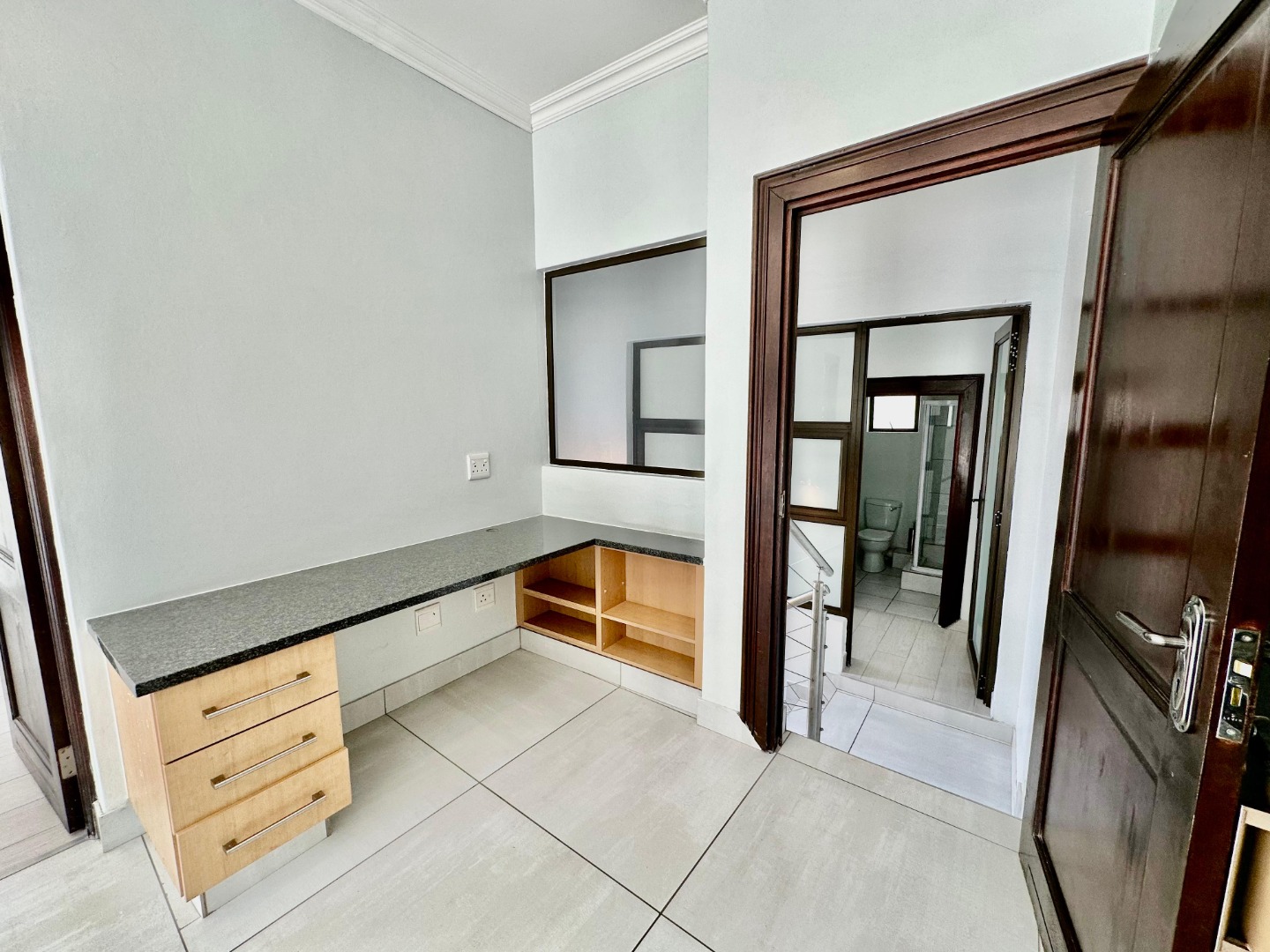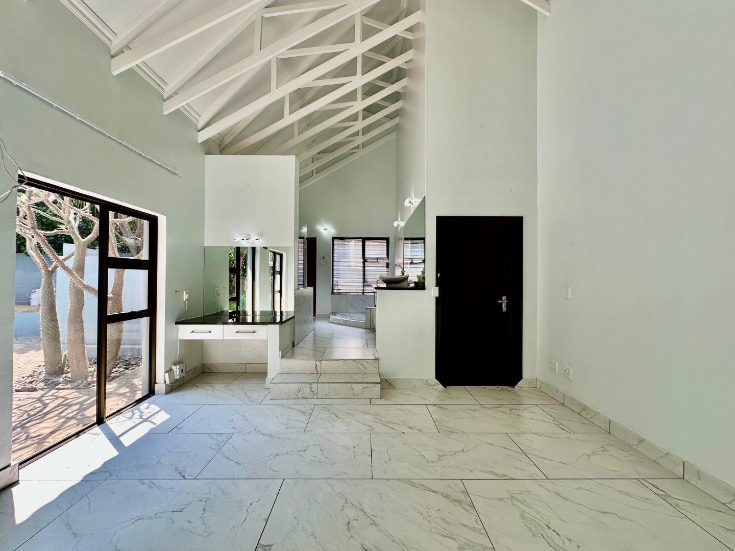 The interior unfolds into a bright and expansive open-plan layout, featuring light-colored tiled flooring and neutral walls throughout. Large glass sliding doors invite abundant natural light and offer seamless access to the garden and pool area. The heart of the home is a sleek, modern kitchen equipped with white cabinetry, dark granite countertops, a stylish black subway tile backsplash, and a gas stove, complemented by a convenient pantry. A contemporary staircase with stainless steel railing and built-in shelving adds to the sophisticated design.