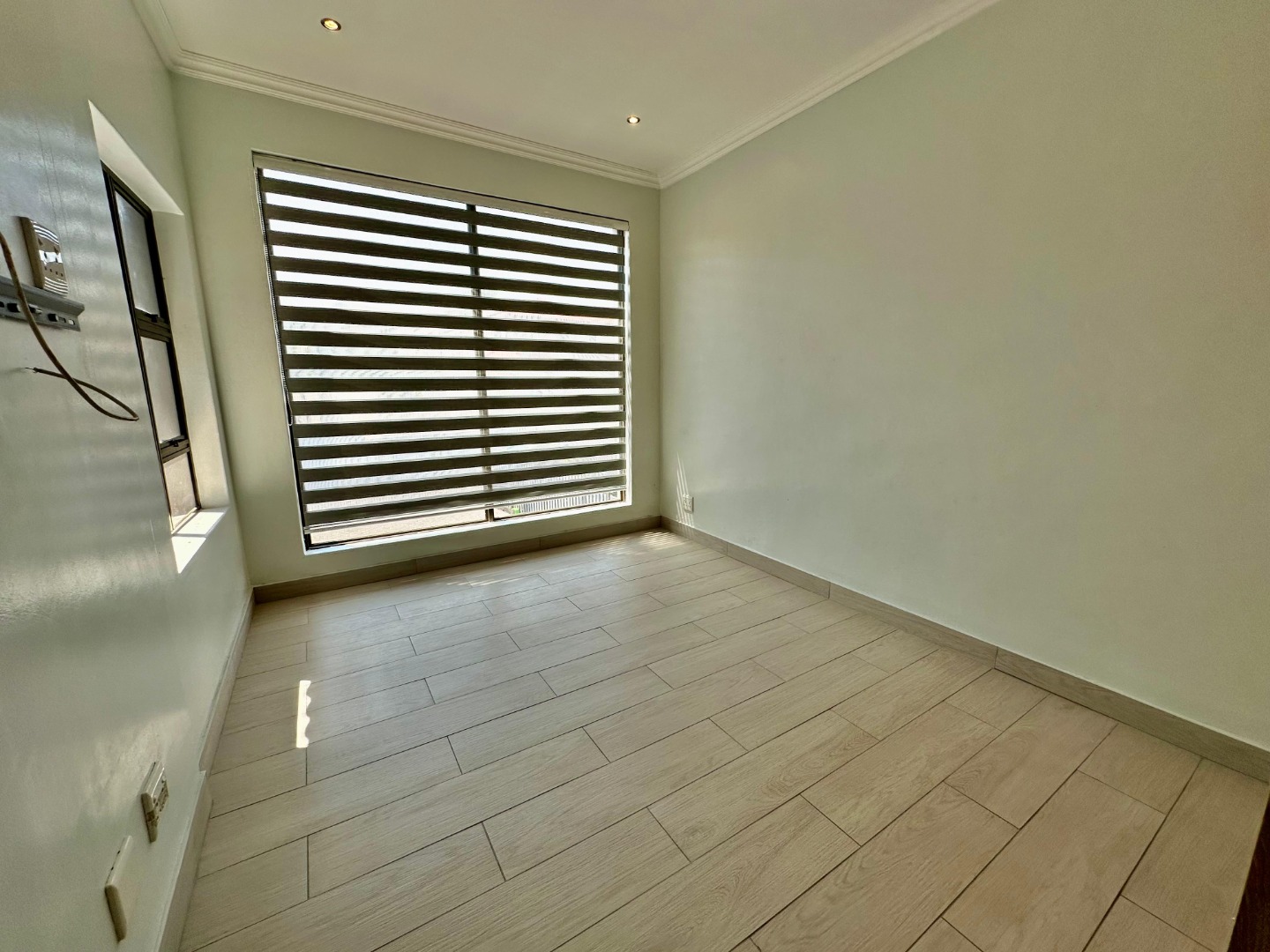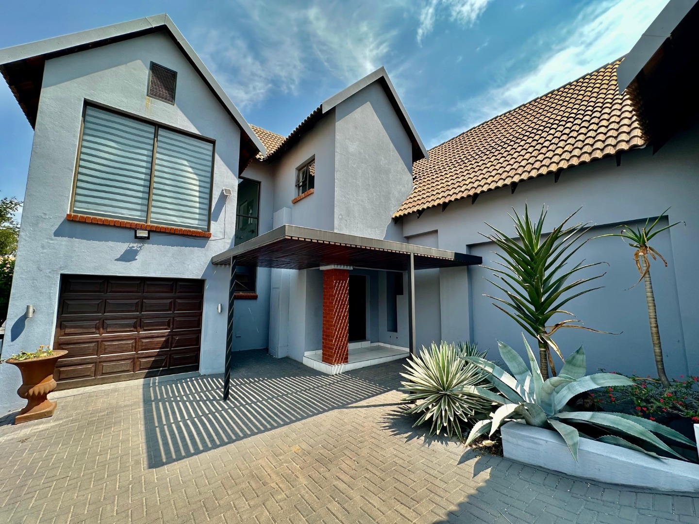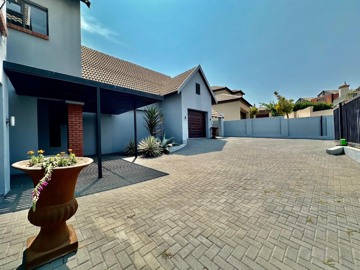 Discover modern living in this exquisite 4-bedroom, 4.5-bathroom residence located within a secure eco-estate in Olympus AH, Pretoria. Boasting a generous 422 sqm under roof on a 993 sqm erf, this home presents a striking contemporary exterior with light grey walls, distinctive gabled roofs, and a spacious paved driveway leading to a double garage and covered carport, ensuring ample parking.
