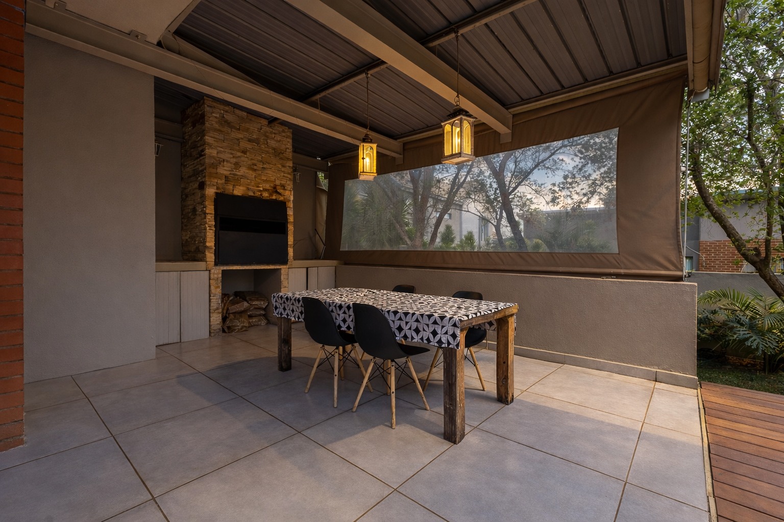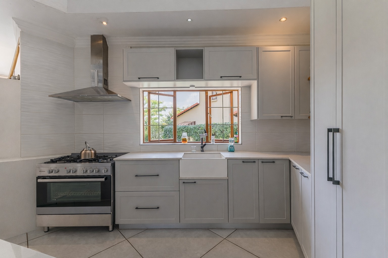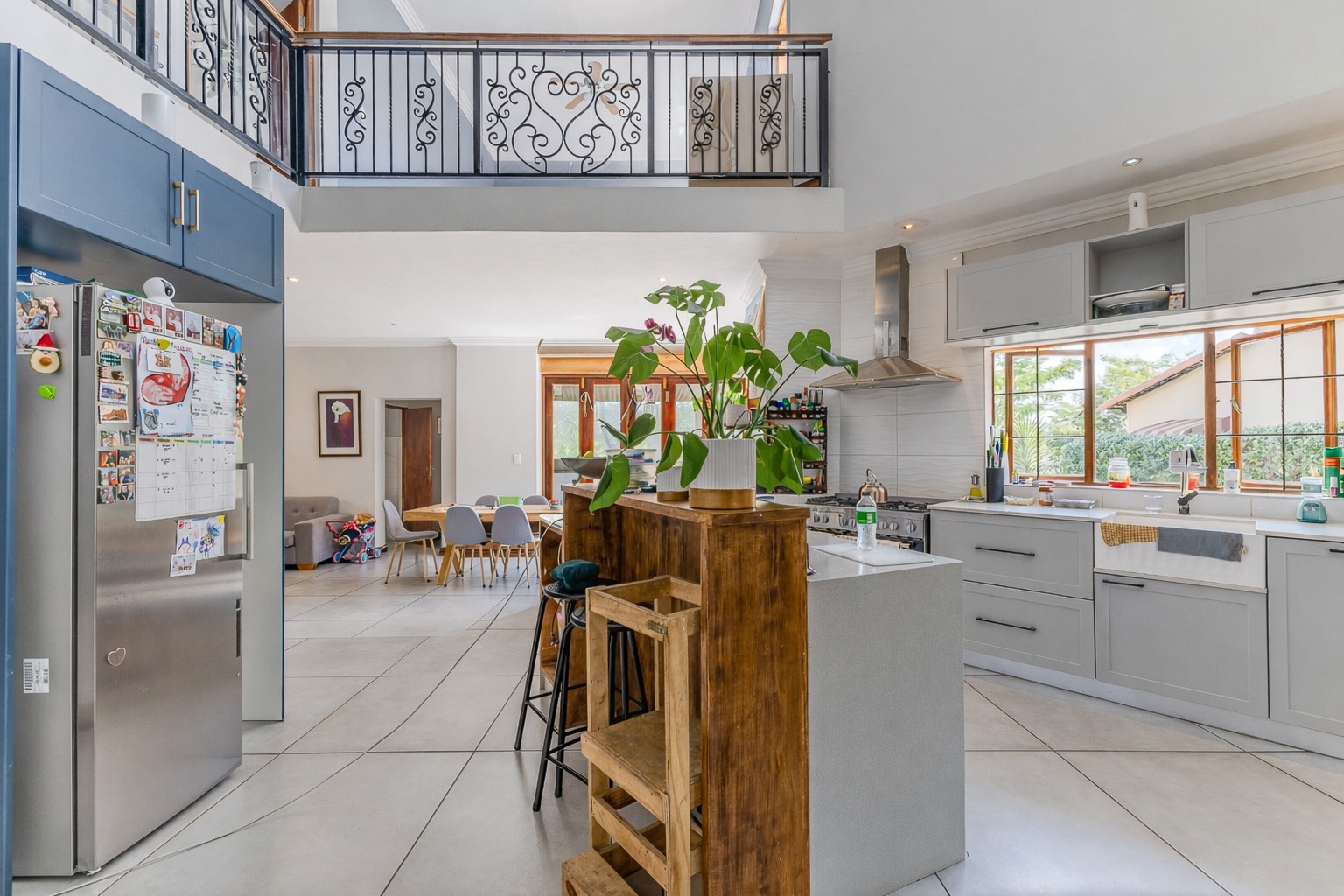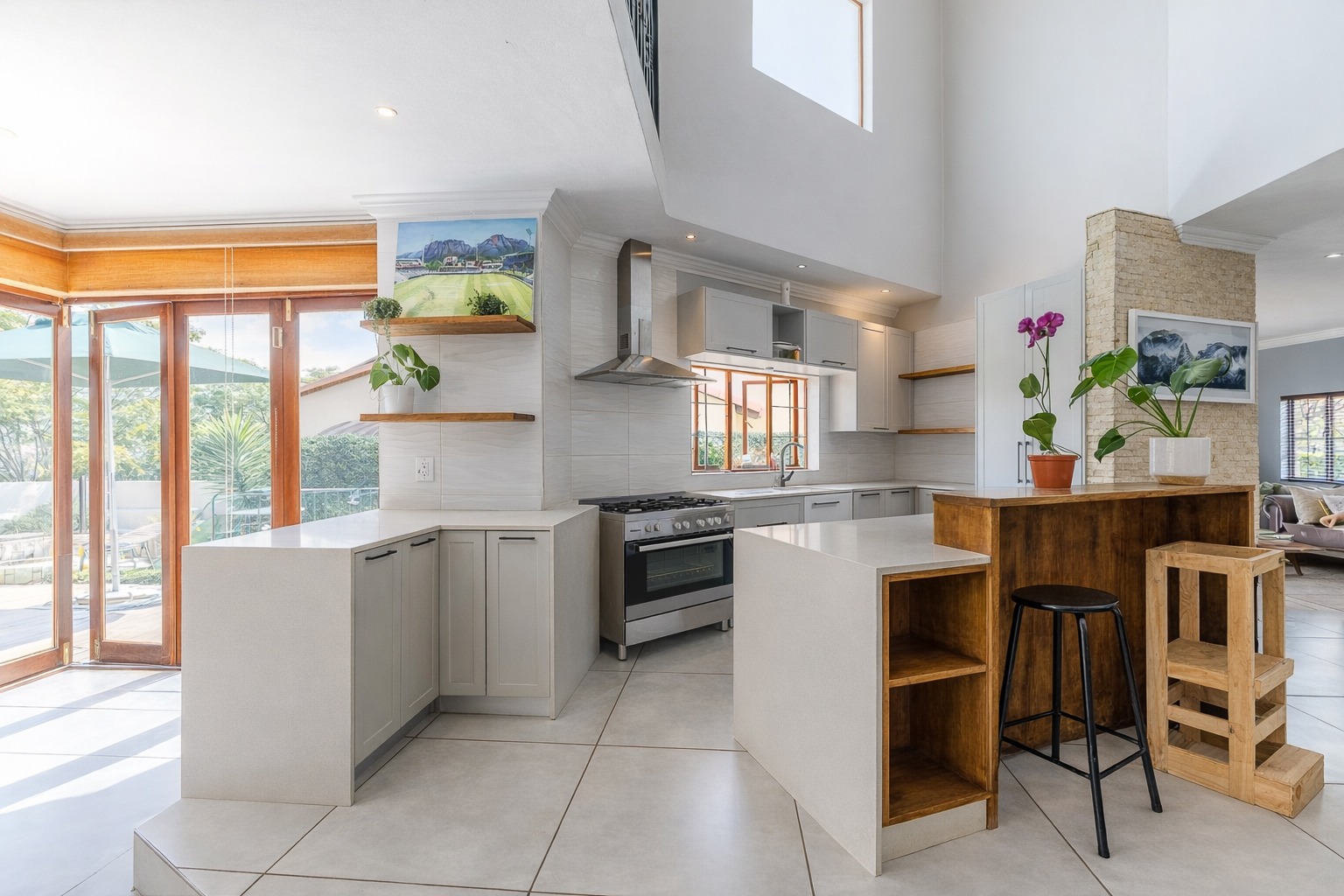 At the centre of it all is a striking designer kitchen, featuring a generous island, 5-burner gas stove, and butler’s sink. The kitchen extends naturally to a covered patio, making entertaining effortless. Host memorable summer braais enclosed by custom canvas blinds or enjoy relaxed evenings around the private fire-pit boma — this home was made for gathering.