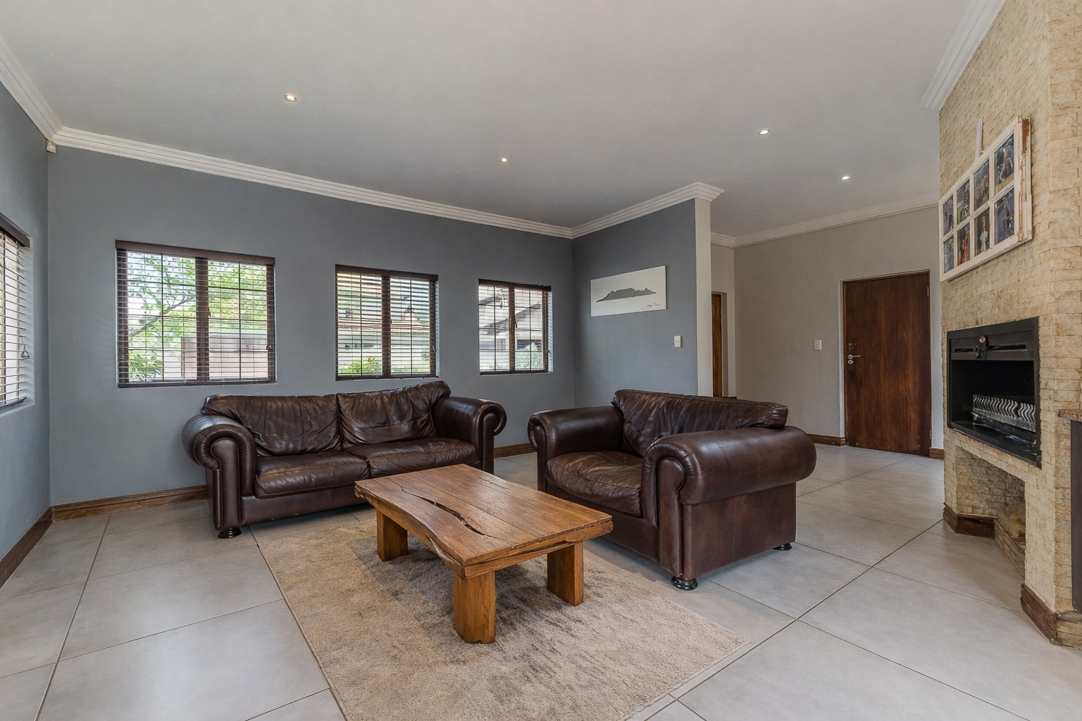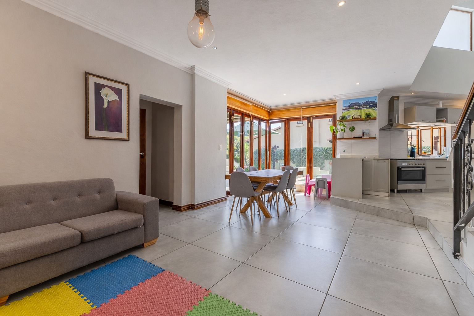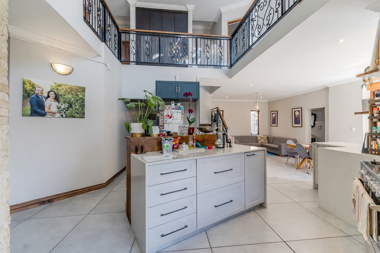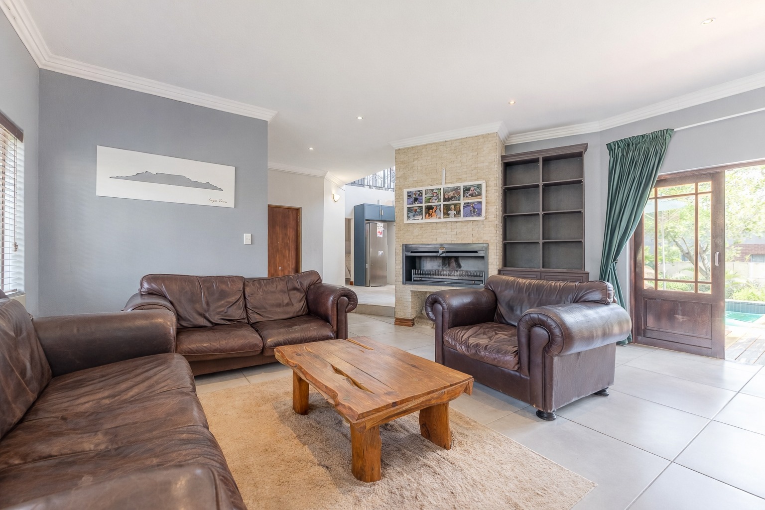At the centre of it all is a striking designer kitchen, featuring a generous island, 5-burner gas stove, and butler’s sink. The kitchen extends naturally to a covered patio, making entertaining effortless. Host memorable summer braais enclosed by custom canvas blinds or enjoy relaxed evenings around the private fire-pit boma — this home was made for gathering.