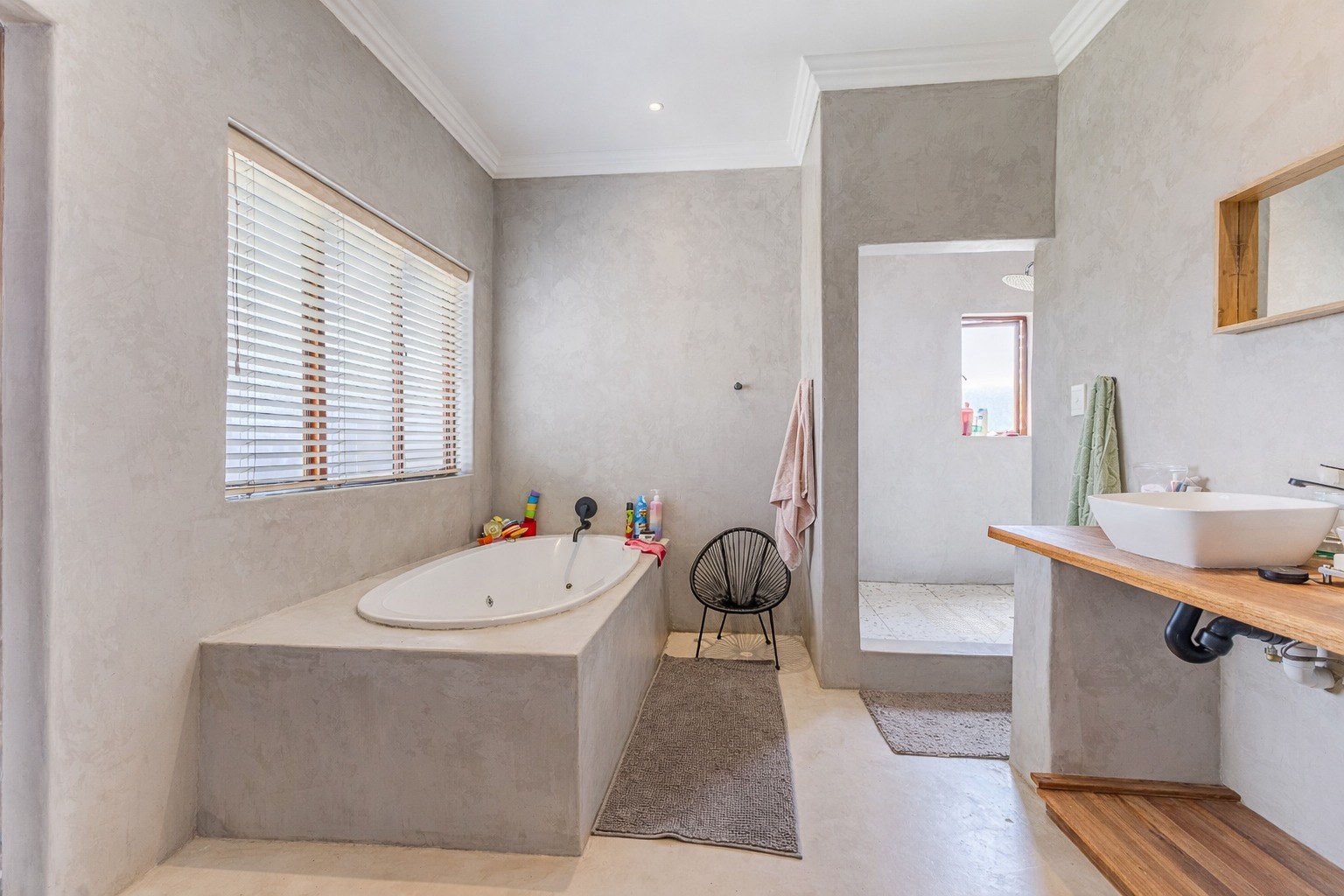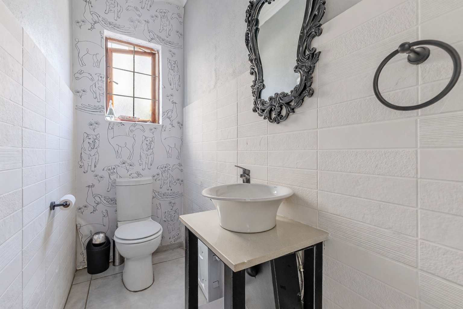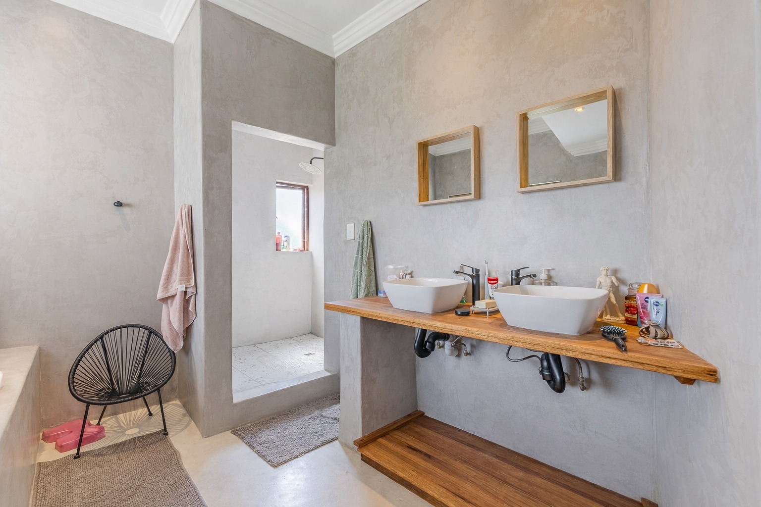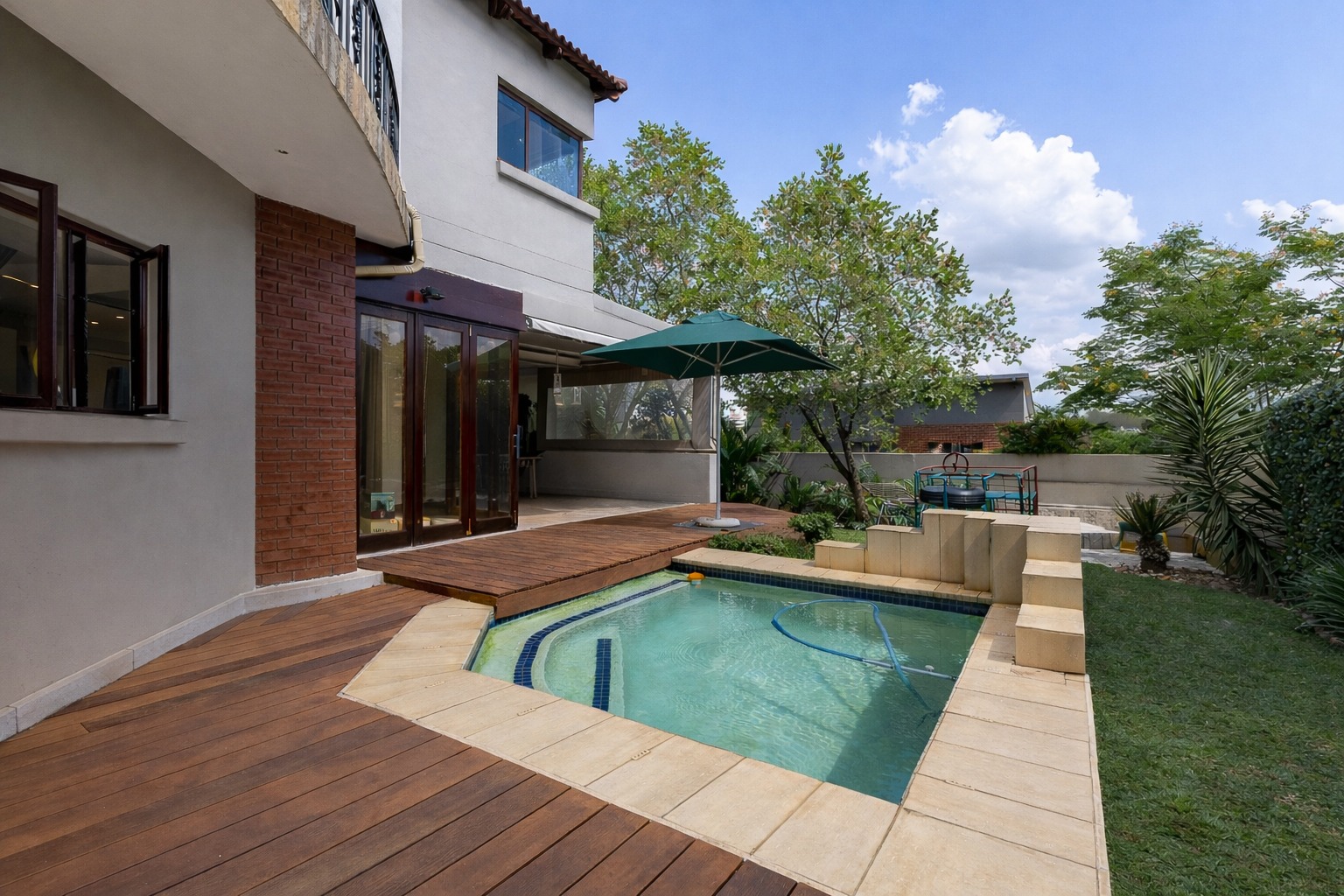 At the centre of it all is a striking designer kitchen, featuring a generous island, 5-burner gas stove, and butler’s sink. The kitchen extends naturally to a covered patio, making entertaining effortless. Host memorable summer braais enclosed by custom canvas blinds or enjoy relaxed evenings around the private fire-pit boma — this home was made for gathering.