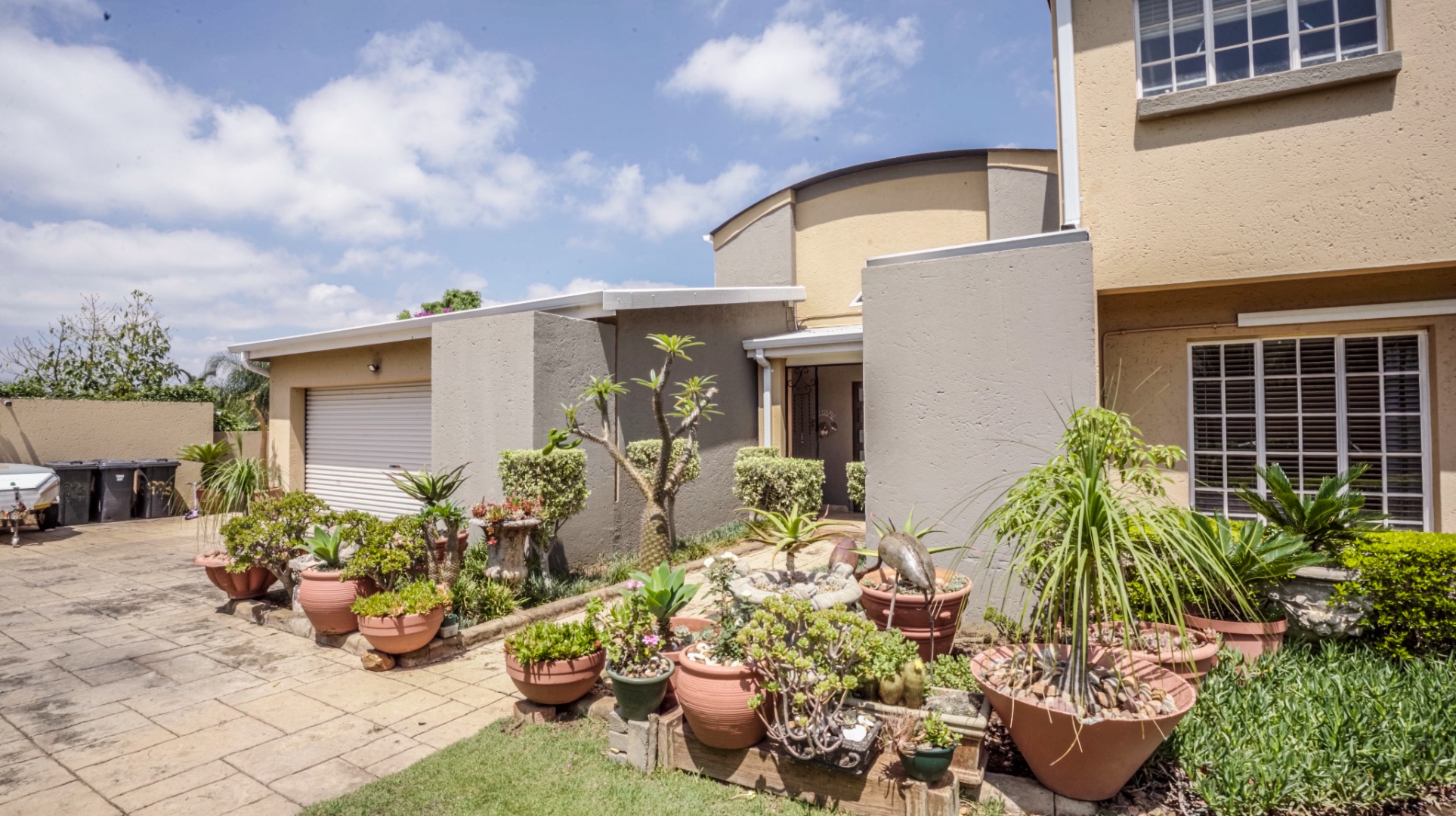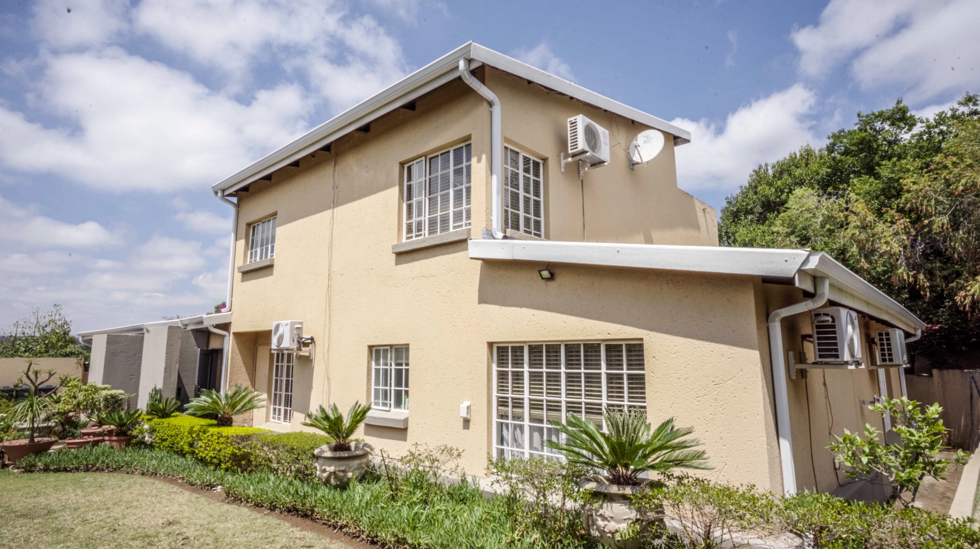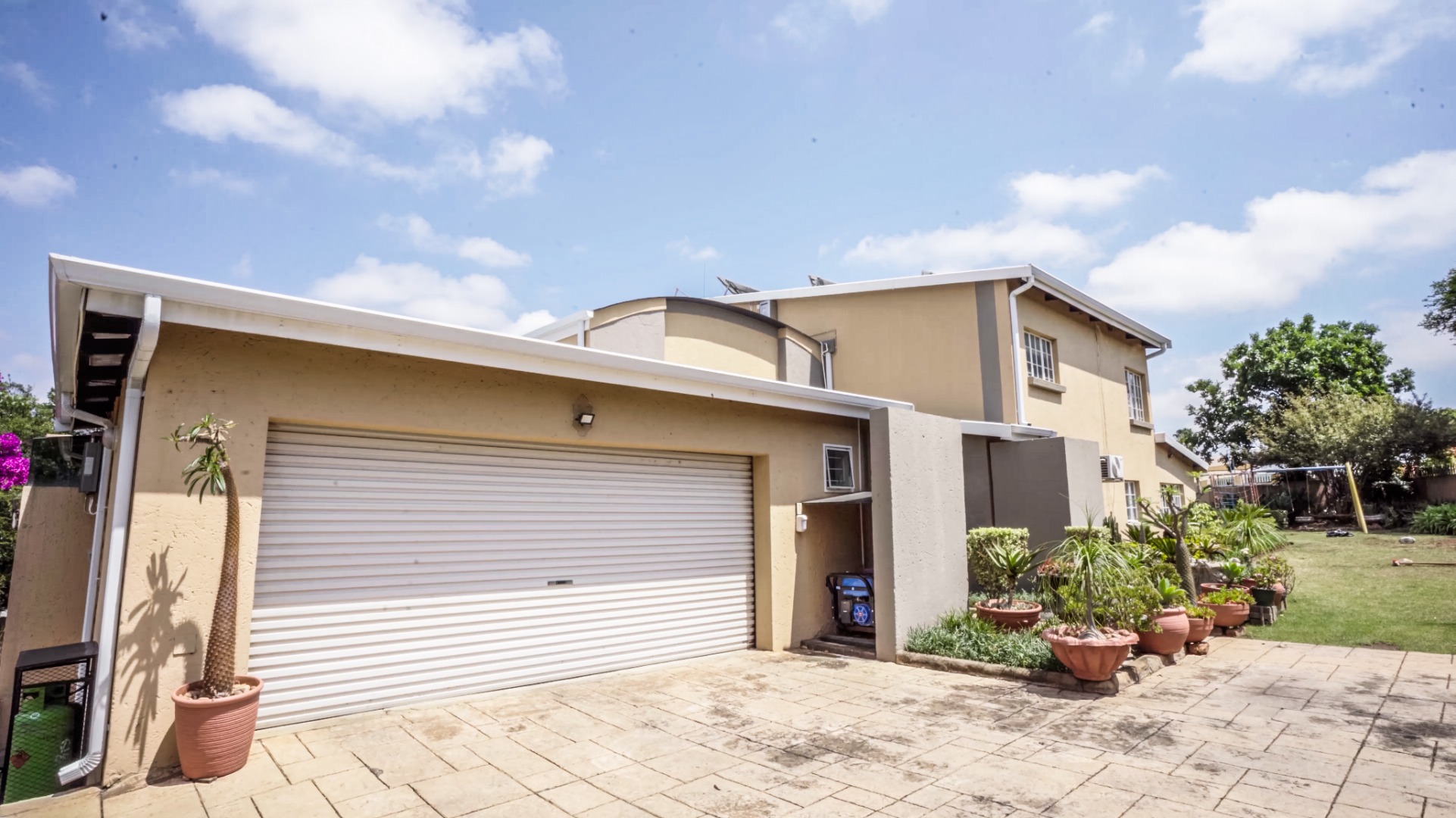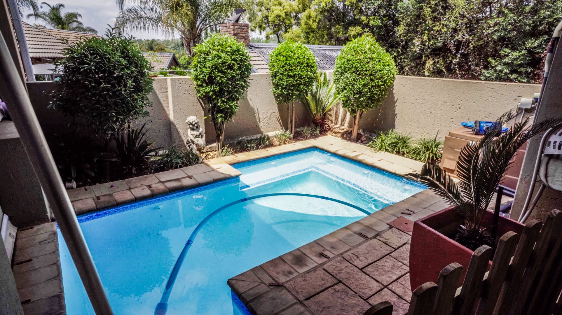Discover this inviting two-story residence in Pretoriuspark, Pretoria, featuring a well-maintained exterior with light beige and grey accents. The property boasts a meticulously landscaped garden, a spacious lawn with a children's playset, and a refreshing swimming pool. A paved driveway leads to a double garage, complementing the home's functional design and kerb appeal on its 1081 sqm erf.