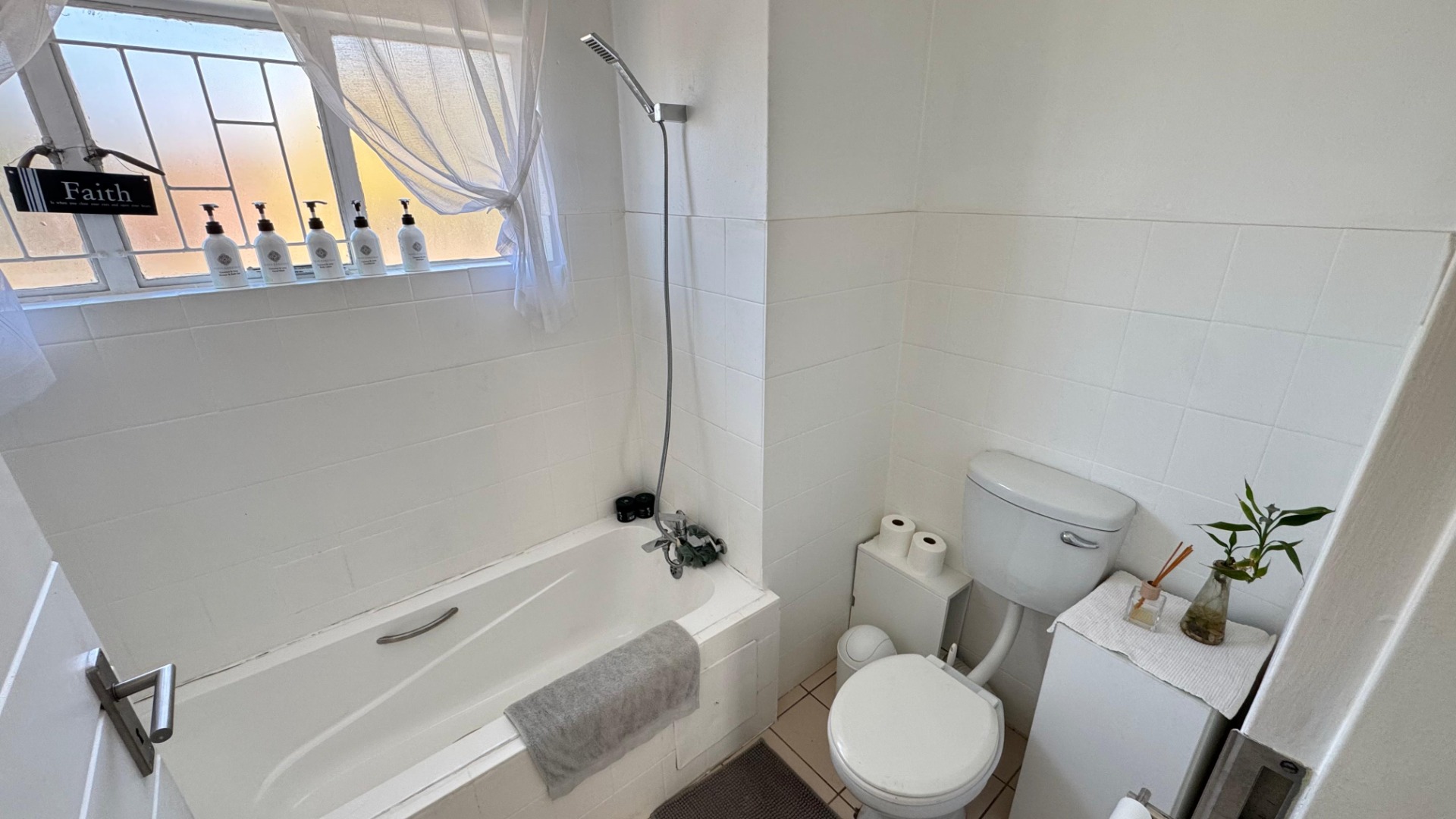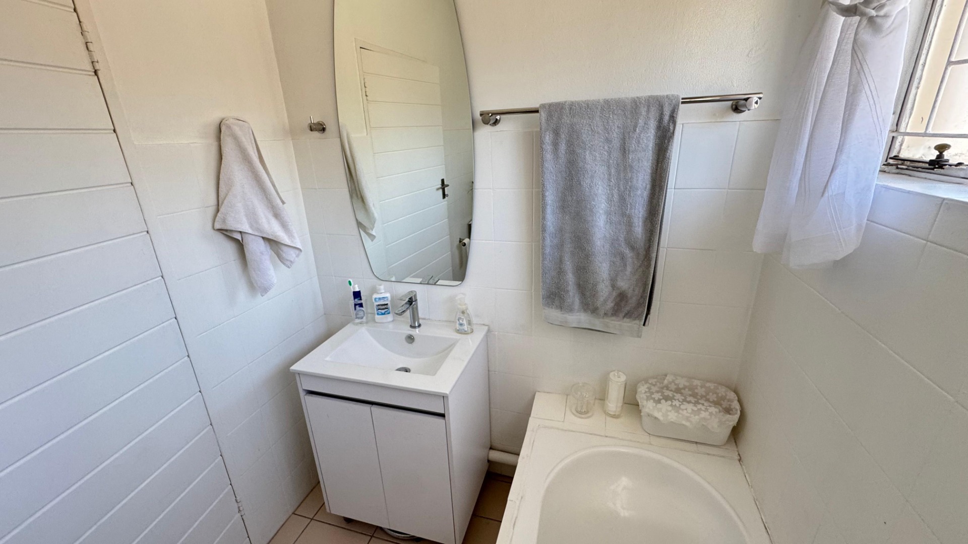 The living room is filled with natural light, thanks to its large windows, creating a warm and inviting atmosphere. The property features 2 bedrooms with built-in cupboards, providing ample storage space. The single full bathroom is fully tiled and equipped with a bathtub and handheld shower, offering the ultimate relaxation experience.