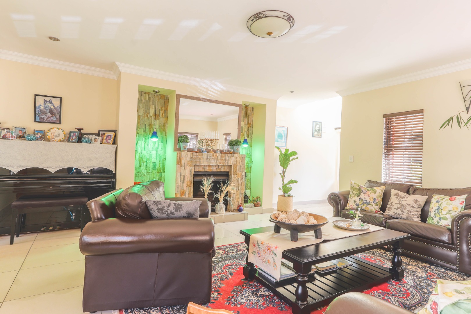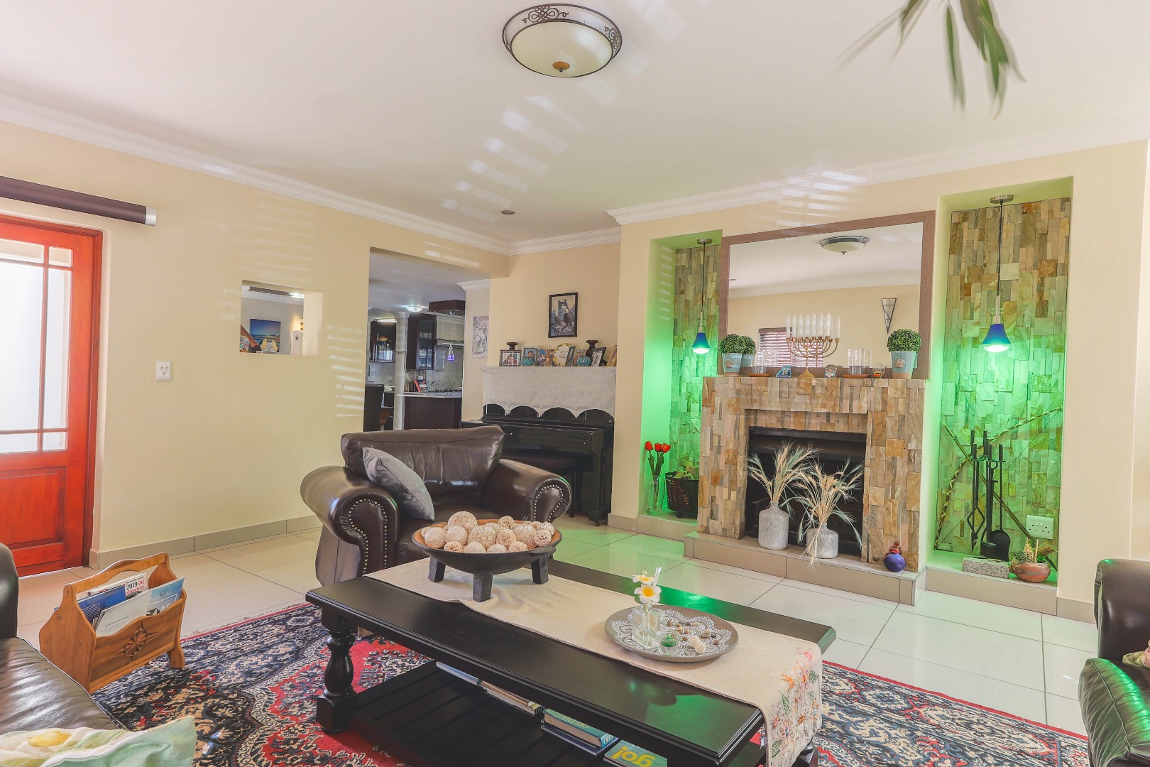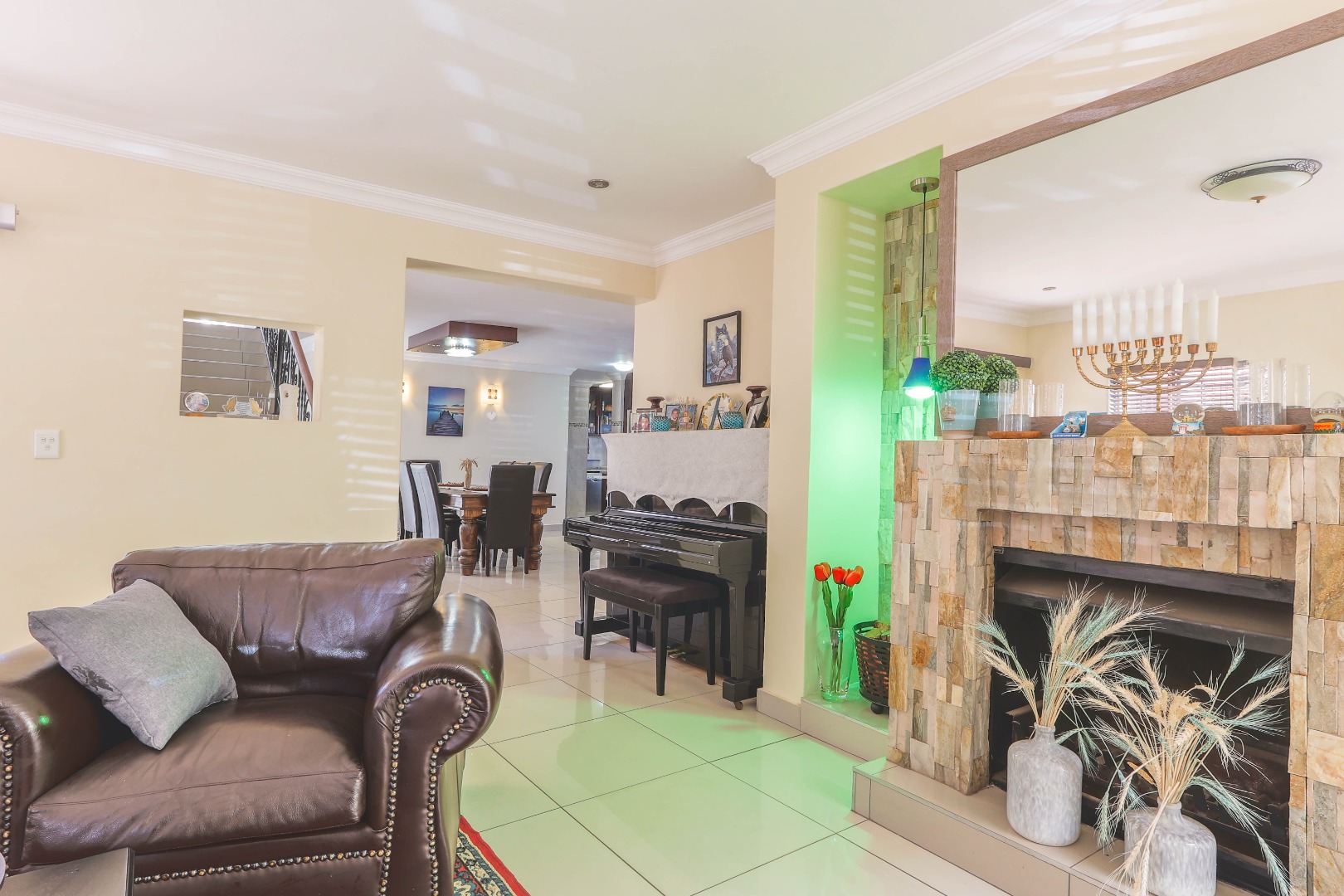 Upon entry, one is greeted by an inviting entrance hall that sets the tone for the spacious interiors. The residence features an intelligently designed open-plan layout, fostering a seamless flow between the principal living areas. Two distinct lounges provide versatile spaces for both formal entertaining and relaxed family gatherings, complemented by a dedicated dining room ideal for hosting. The well-appointed kitchen, complete with a practical pantry, is equipped to cater to culinary pursuits, serving as the heart of the home. Enhanced by special lighting installations and a charming fireplace, the communal areas exude an atmosphere of refined comfort and warmth, suitable for all seasons.
