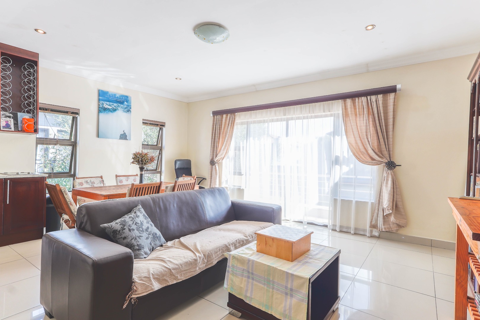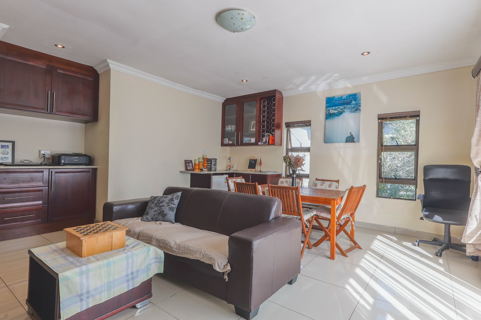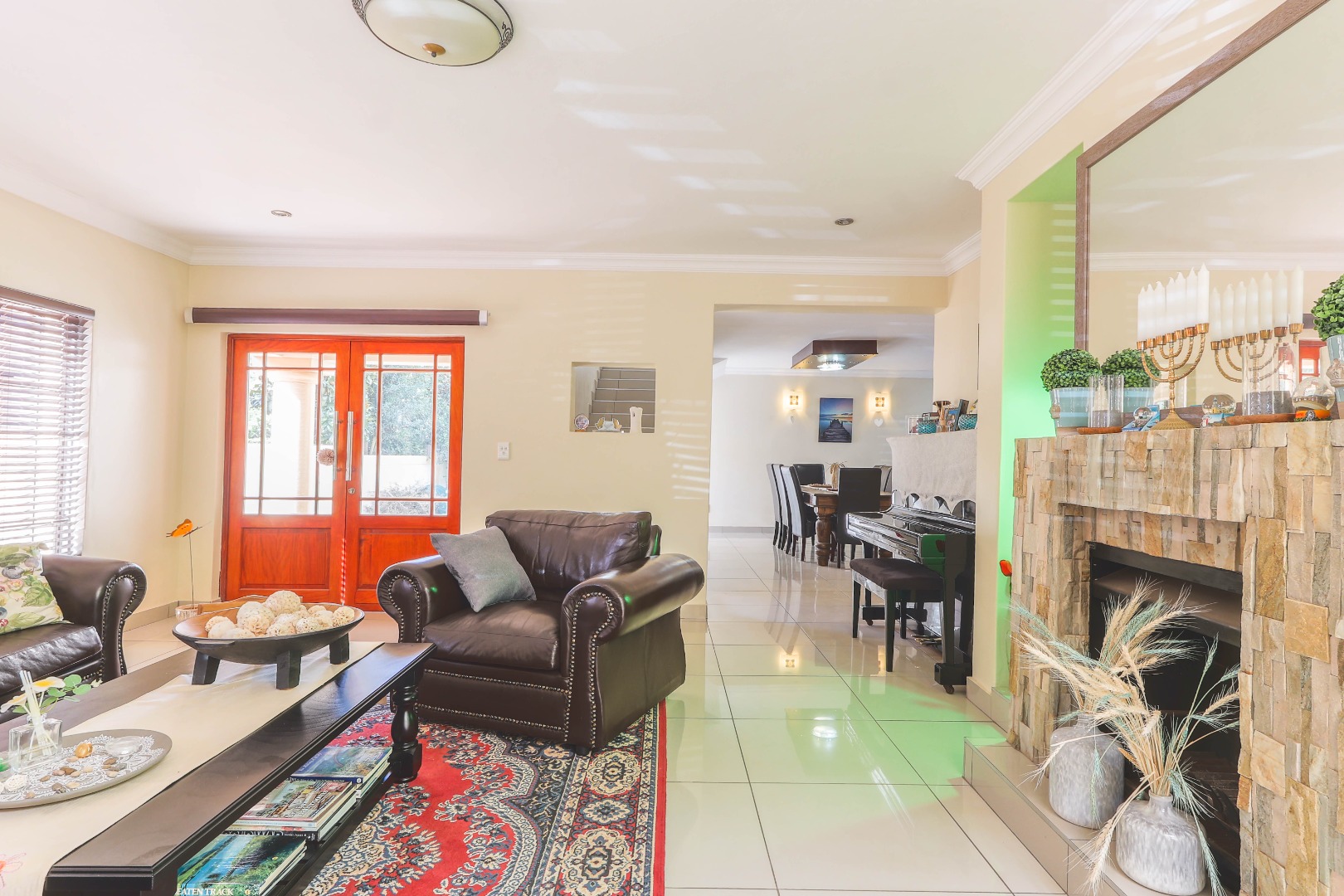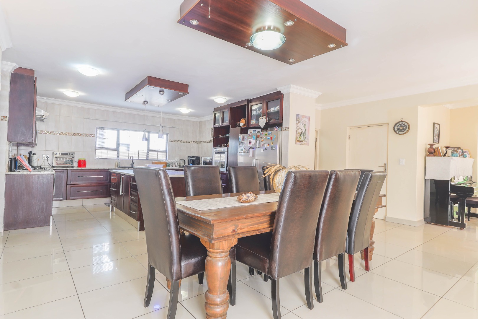 Upon entry, one is greeted by an inviting entrance hall that sets the tone for the spacious interiors. The residence features an intelligently designed open-plan layout, fostering a seamless flow between the principal living areas. Two distinct lounges provide versatile spaces for both formal entertaining and relaxed family gatherings, complemented by a dedicated dining room ideal for hosting. The well-appointed kitchen, complete with a practical pantry, is equipped to cater to culinary pursuits, serving as the heart of the home. Enhanced by special lighting installations and a charming fireplace, the communal areas exude an atmosphere of refined comfort and warmth, suitable for all seasons.