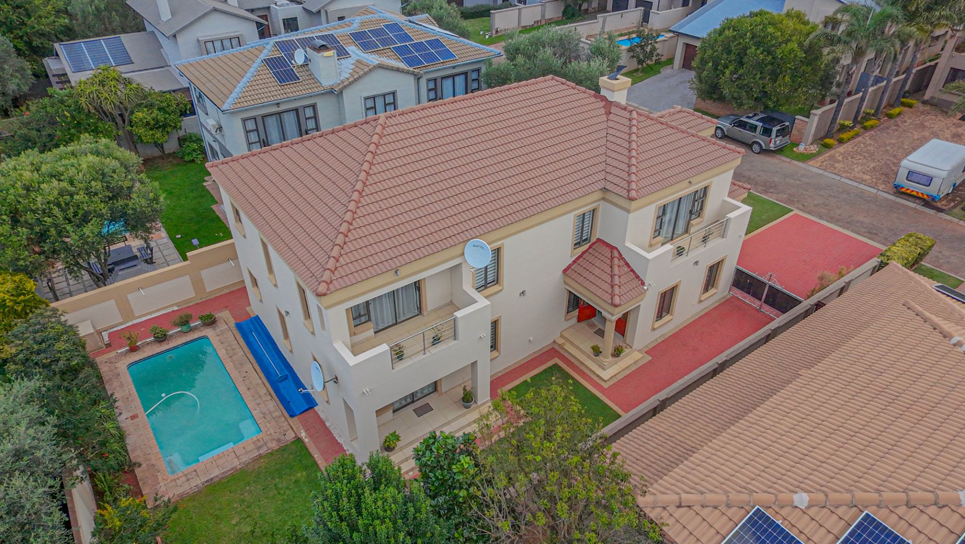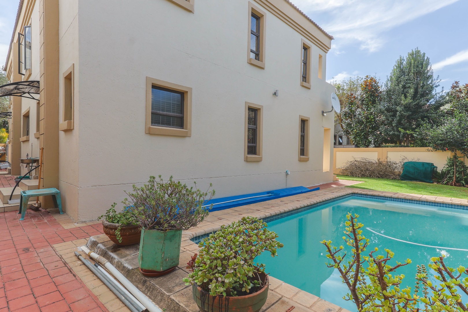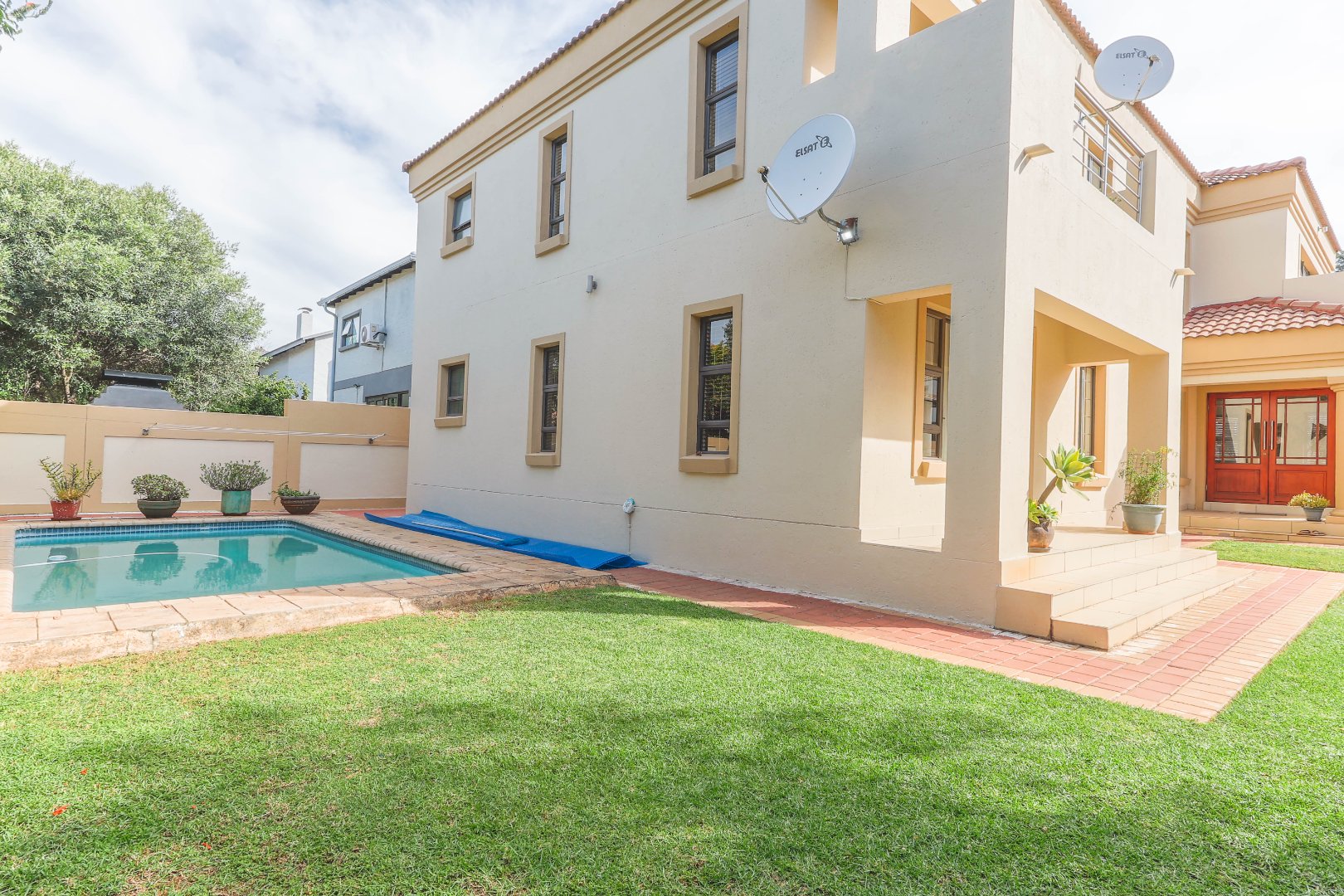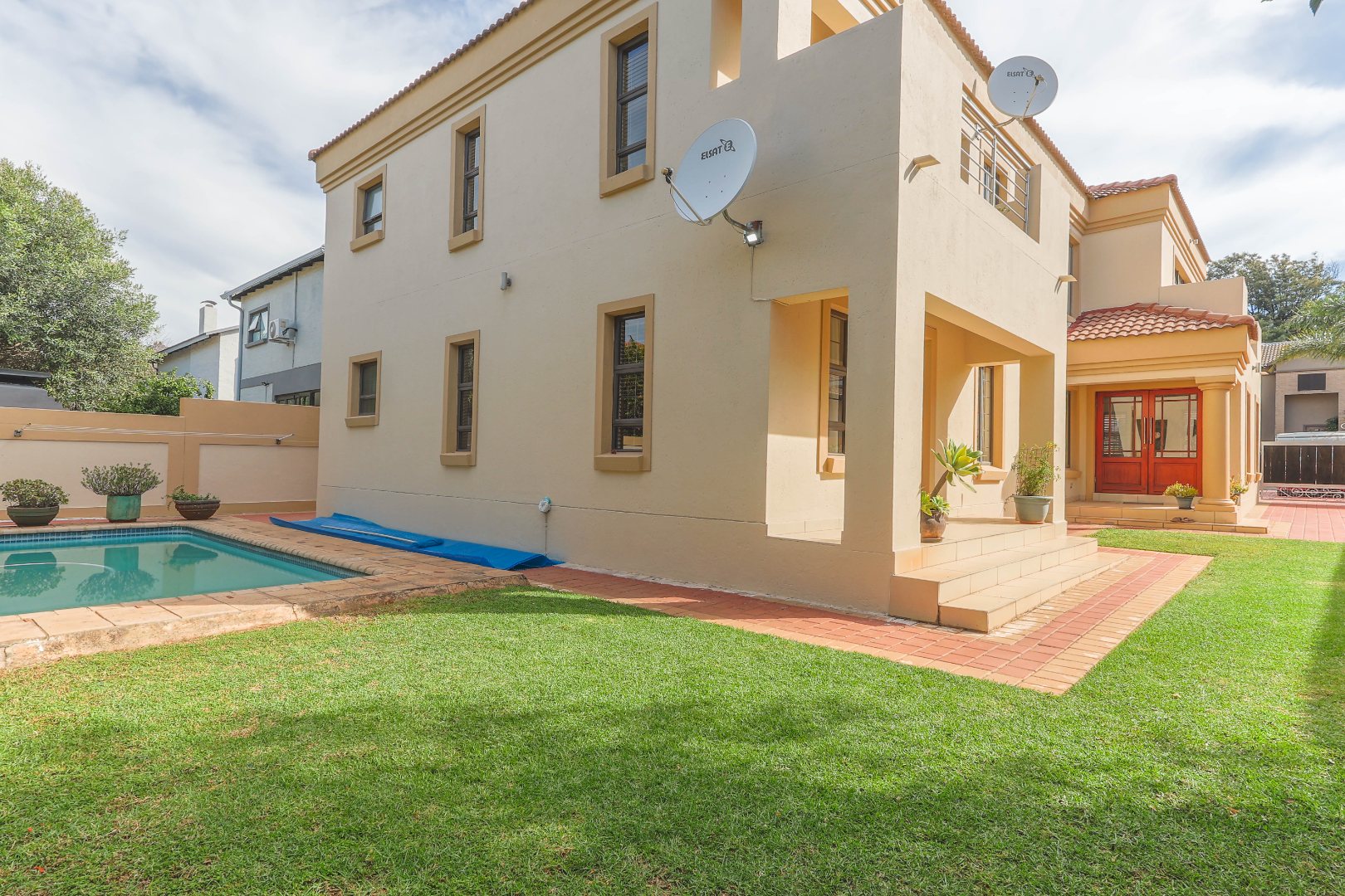 Externally, the property continues to impress with its well-maintained garden and a private swimming pool, presenting an ideal setting for outdoor leisure and entertainment. Practical considerations are meticulously addressed with a secure driveway, ample paving, and a total of three parking spaces, including two dedicated garages, ensuring sufficient accommodation for vehicles. The comprehensive security infrastructure, including 24-hour security, an access gate, electric fencing, a security post, and an intercom system, underscores the estate's commitment to resident safety. Furthermore, the property is entirely walled, offering an additional layer of privacy and security. Modern connectivity is assured with fibre optic internet access, alongside satellite television and traditional ADSL and dial-up options, catering to diverse communication needs. Pets are permitted, allowing for a complete family living experience.