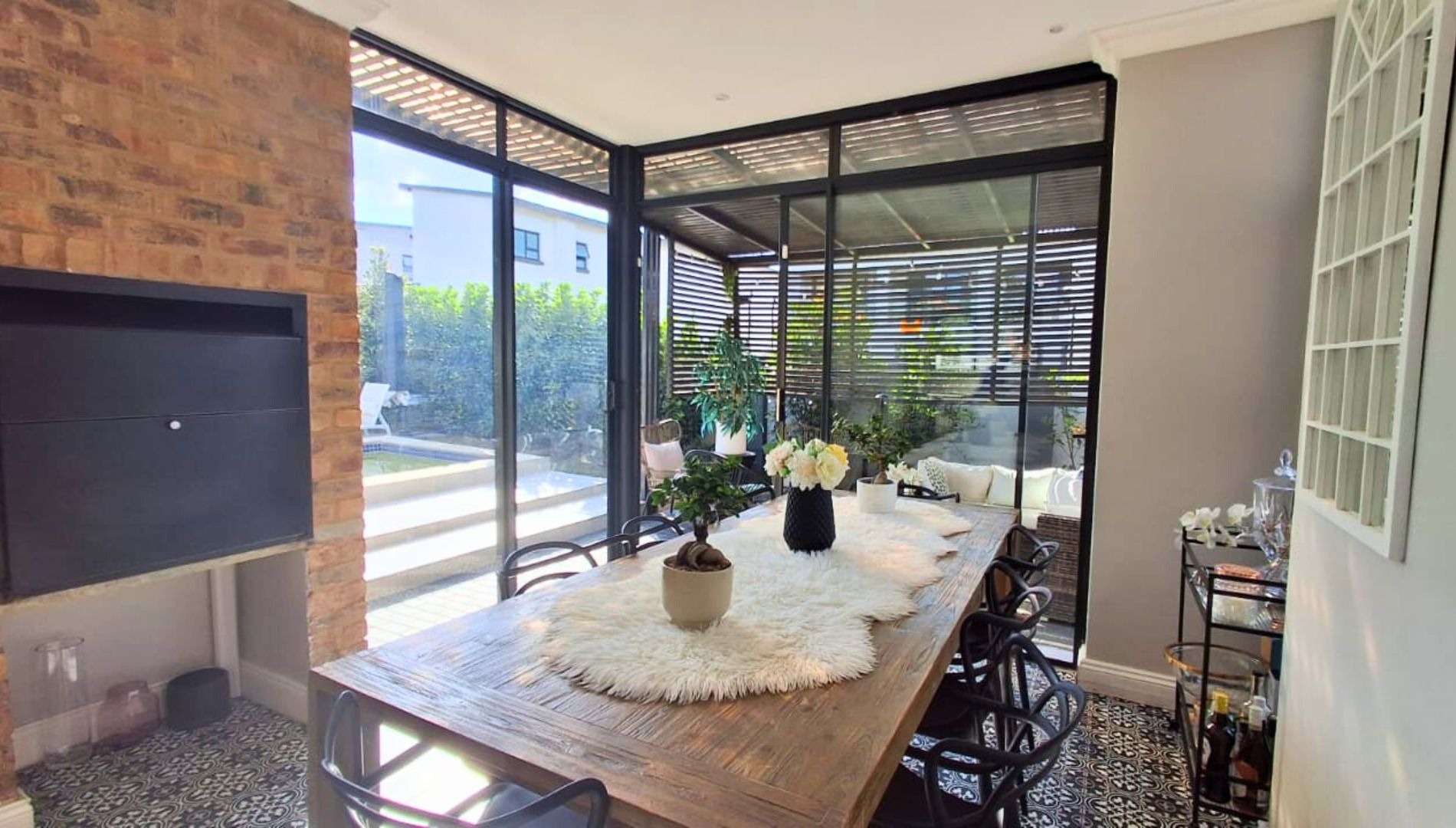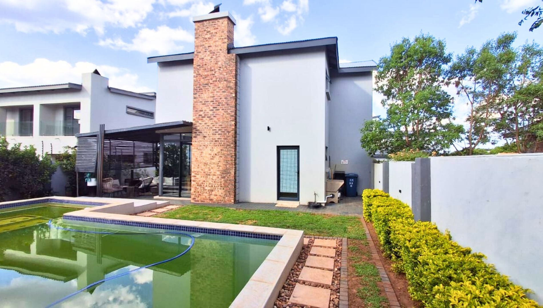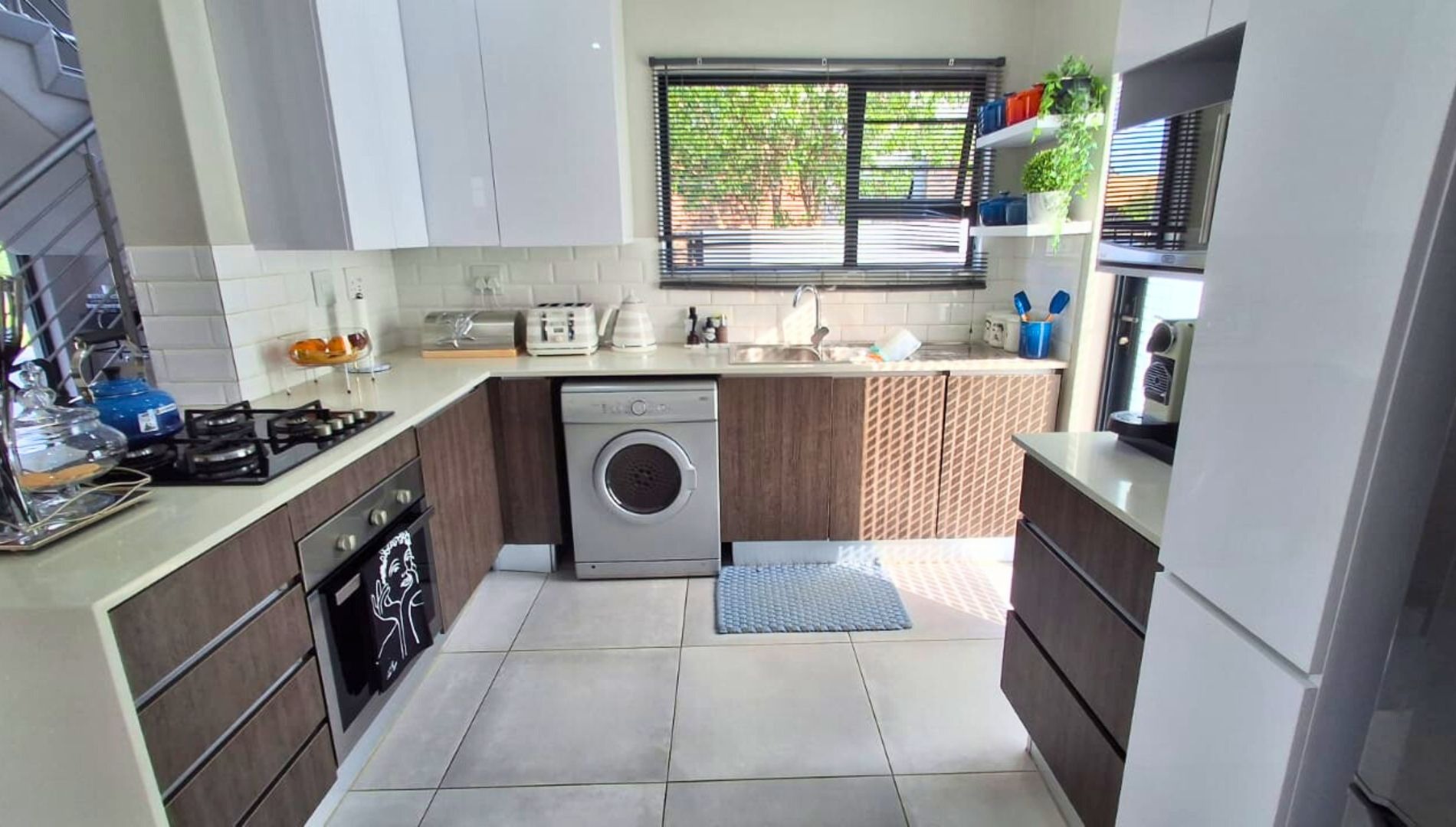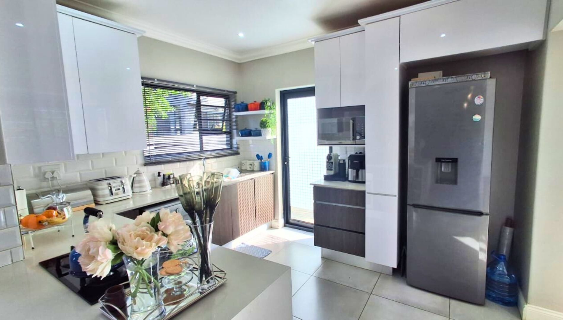 Discover an exquisite modern sanctuary nestled within a prestigious security estate in Roodeplaat, Pretoria. This sophisticated residence, spanning 164 sqm, epitomizes contemporary luxury with its sleek architectural lines and meticulously curated interiors. The open-plan design seamlessly integrates a chic lounge and elegant dining area, bathed in natural light from expansive glass doors that invite the outdoors in. The state-of-the-art kitchen is a culinary dream, featuring glossy white and wood-toned cabinetry, an integrated island cooktop, and a stylish subway tile backsplash, perfect for both intimate meals and grand entertaining.