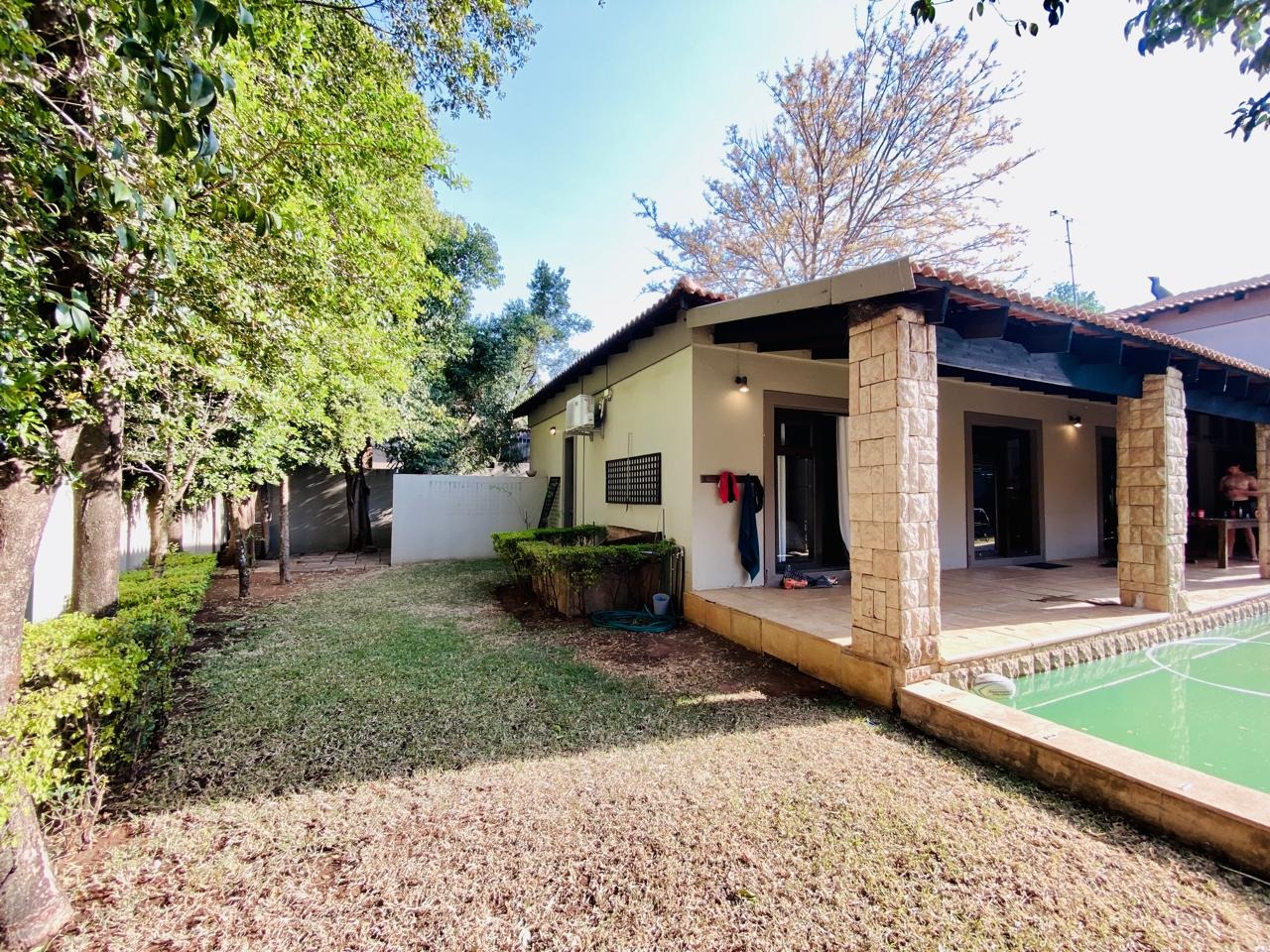 The inviting living area boasts a stylish gas fireplace and large aluminum doors that flood the space with natural light. Step outside to the covered patio with a built-in braai – perfect for family gatherings and summer barbecues – and take a refreshing dip in the sparkling pool. Additionally, there’s a versatile extra room that can serve as an office, study, or storage space to suit your needs.