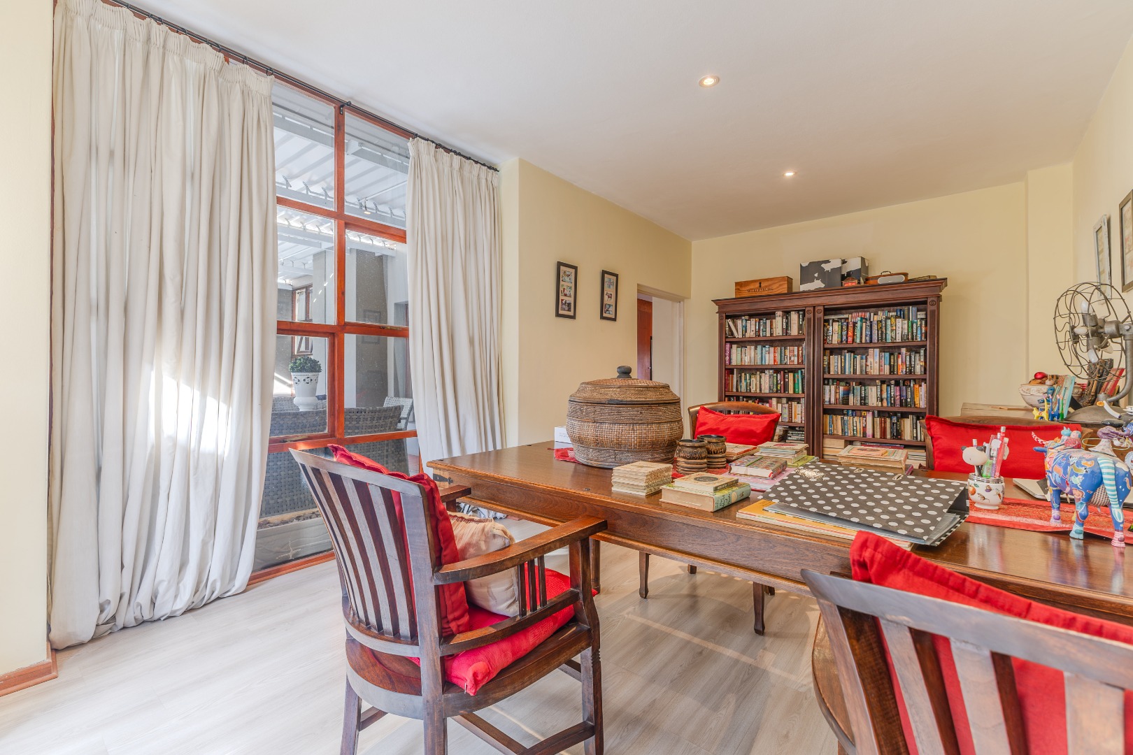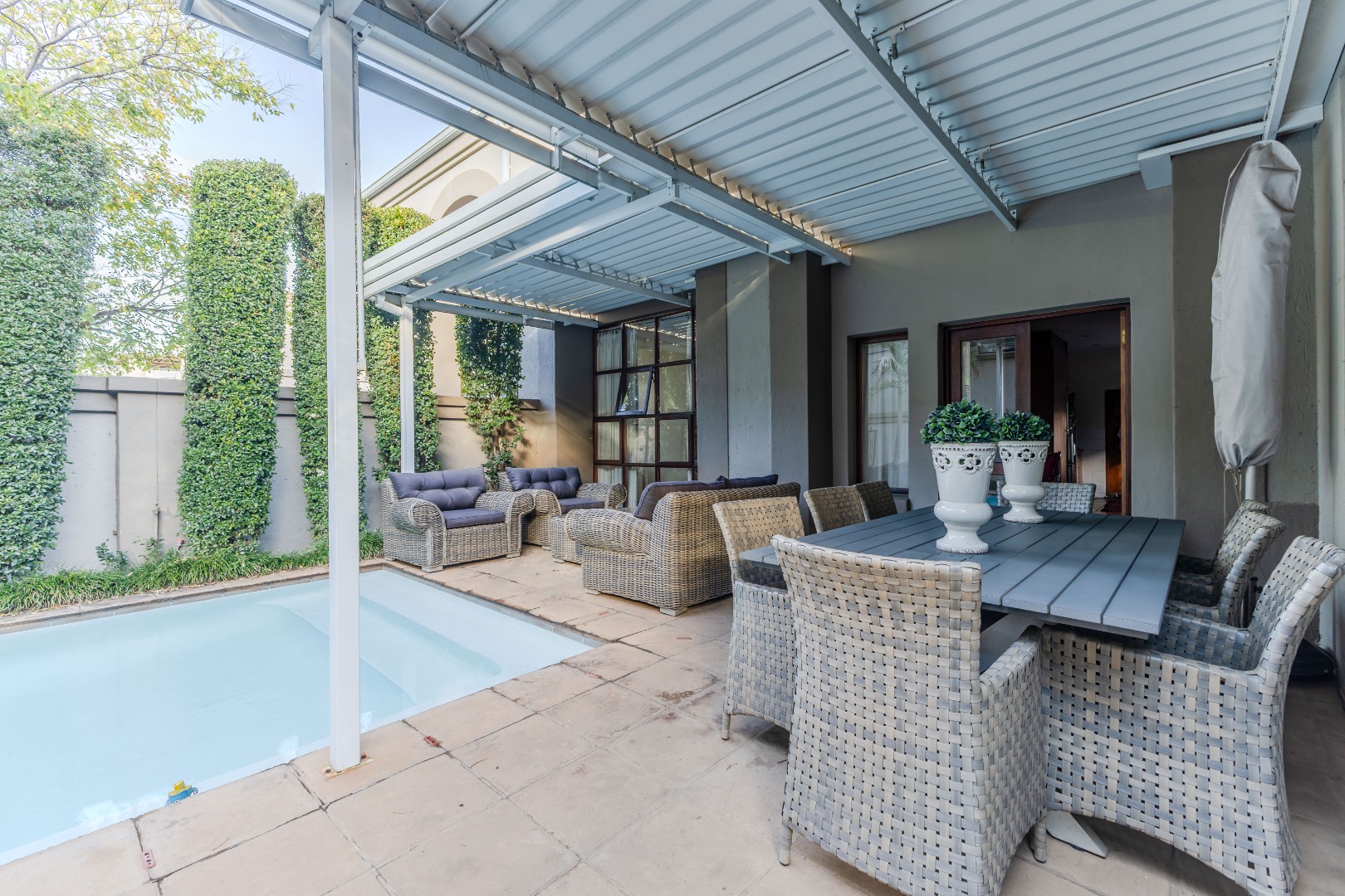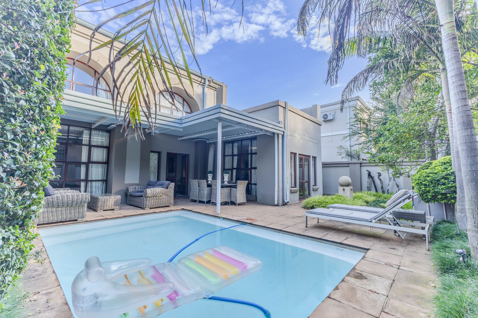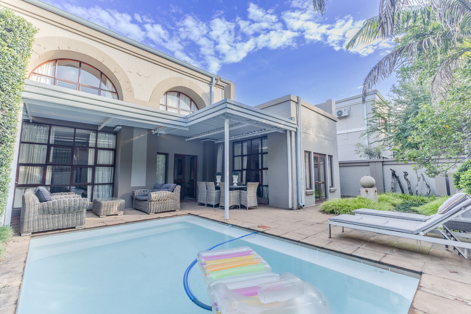 Step into a home where everyday living feels both relaxed and refined. The ground floor is designed for connection, featuring generous open-plan spaces that flow out to a lush, tree-framed garden. A sparkling pool takes center stage outdoors, with a covered patio that invites long summer lunches, evening braais, or quiet moments by the water. The seamless indoor-outdoor transition makes entertaining effortless while still preserving a sense of calm retreat.