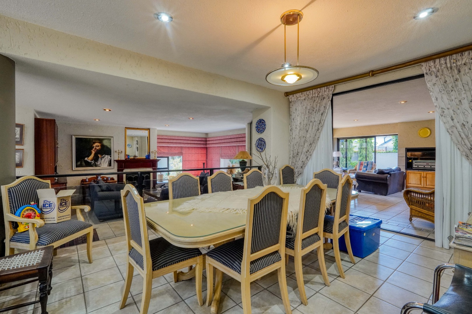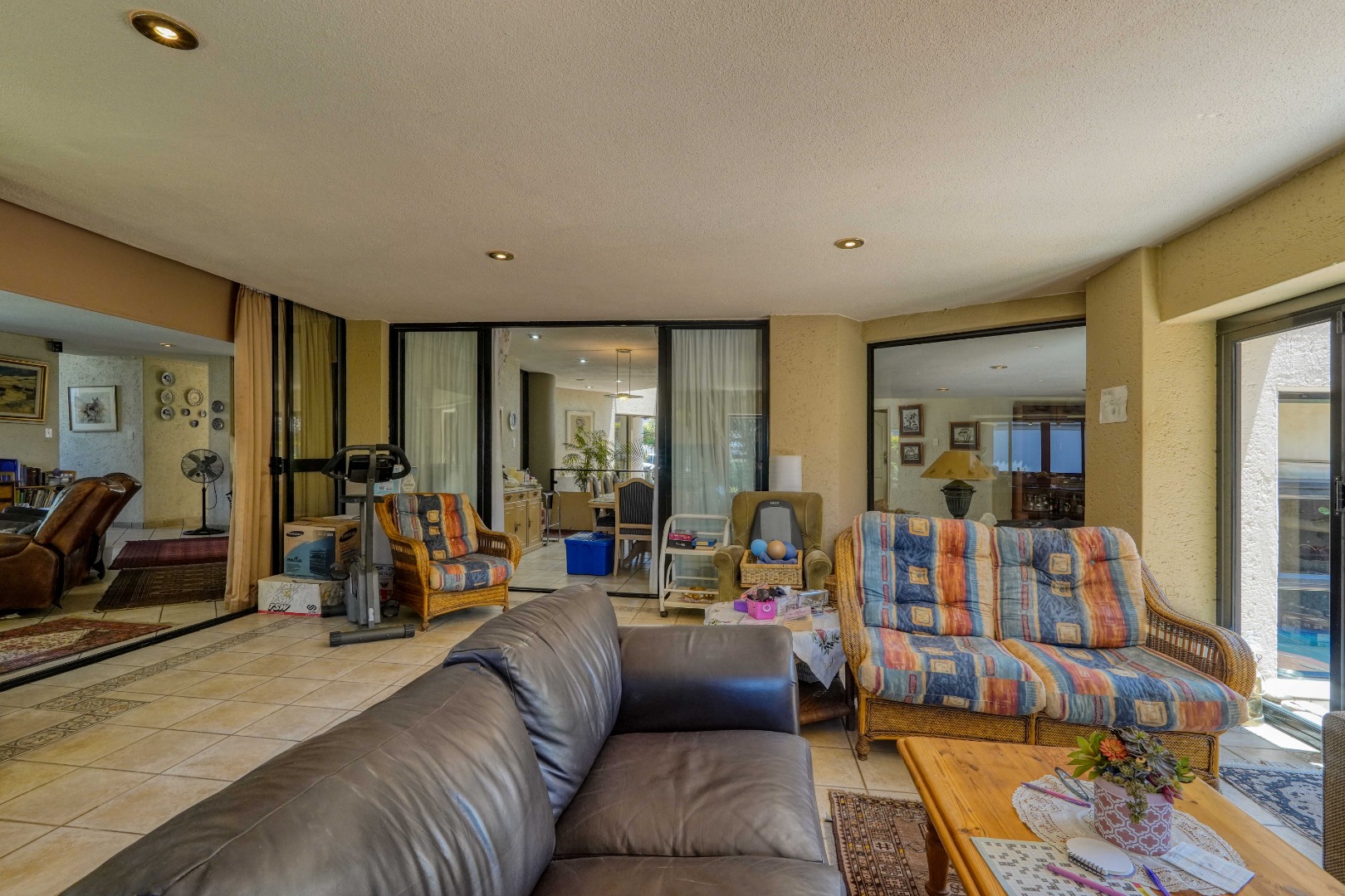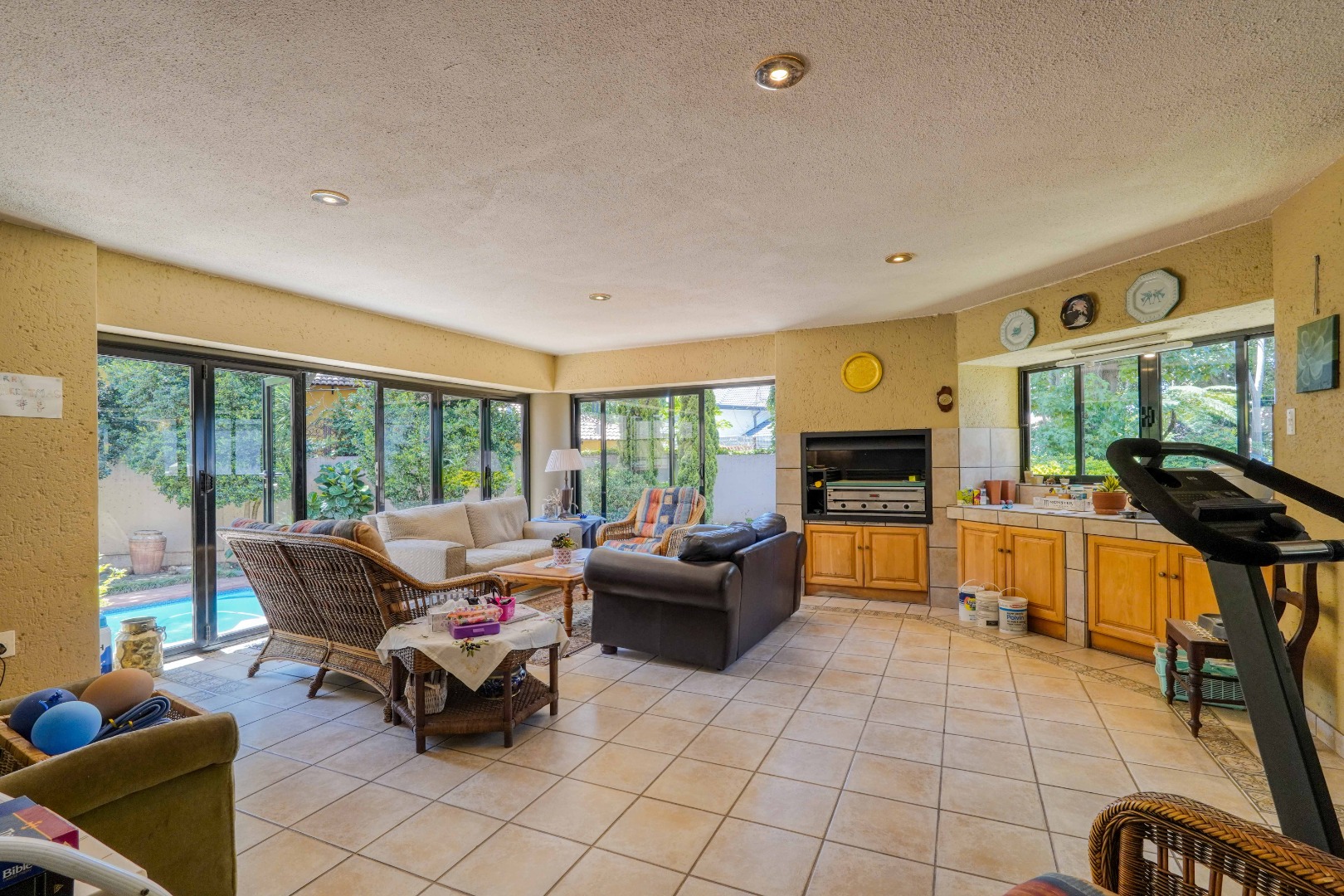 The home offers four generous living areas that connect seamlessly with a modern kitchen, creating an easy, flowing layout that works just as well for everyday family life as it does for entertaining. A large enclosed patio extends the living space and opens onto a private garden with a swimming pool, making it a natural gathering place for friends and family throughout the year.
