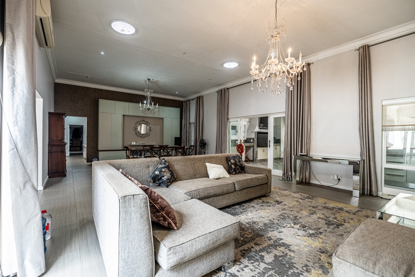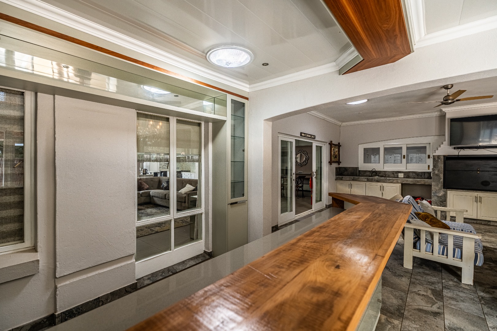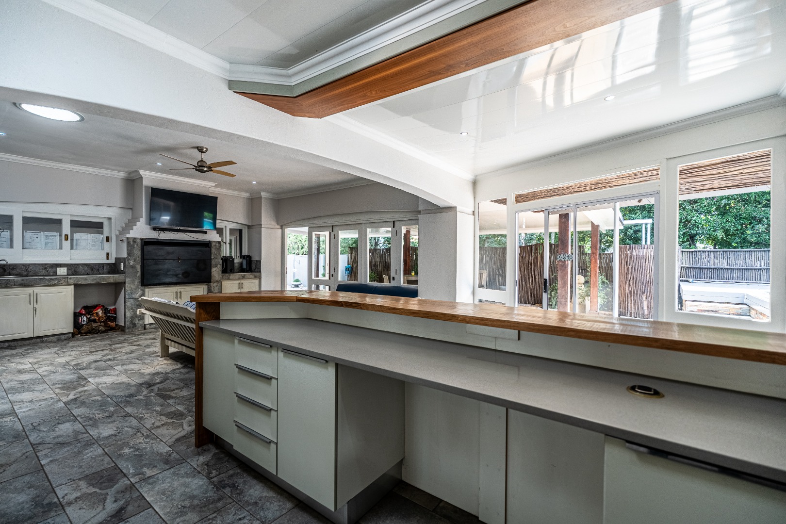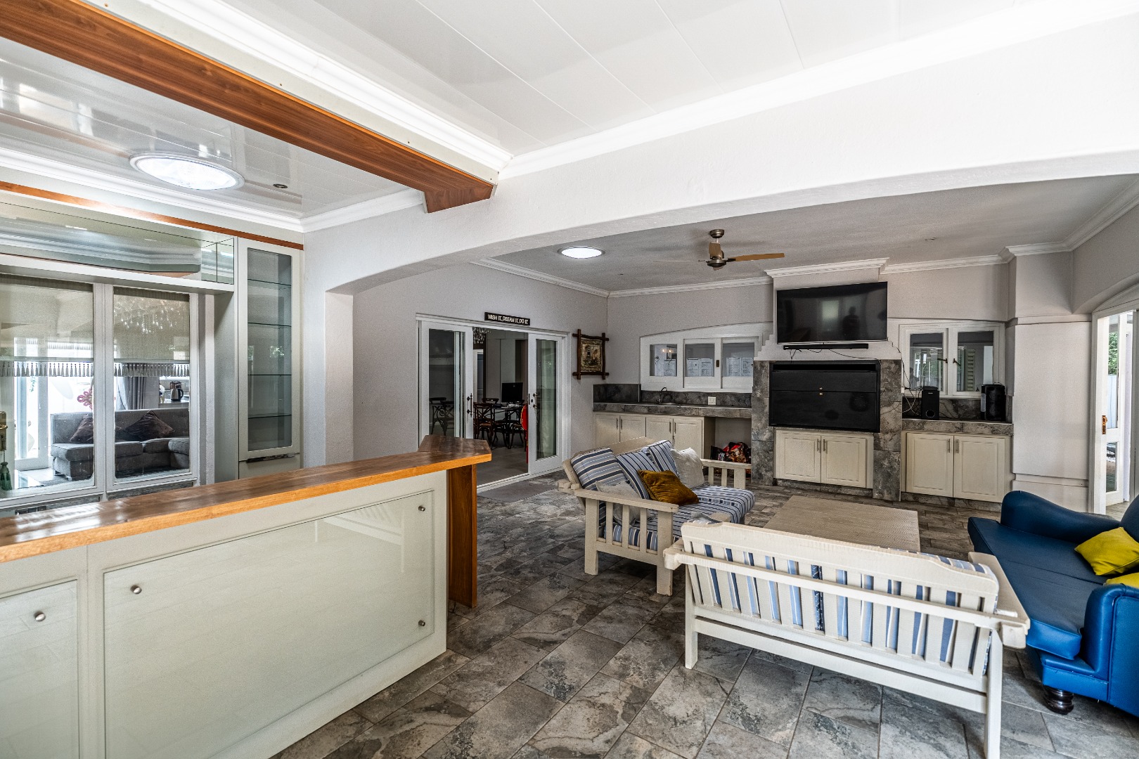 The grand entrance leads into an inviting open-plan living, dining, and entertainment area. Undercover patio, bar area with built-in bar and braai with sliding doors opening to pool area as well as additional private entertainment area with fireplace and outside boma.