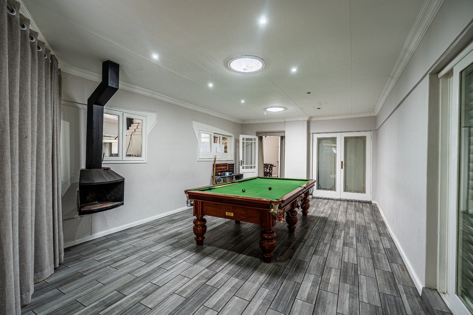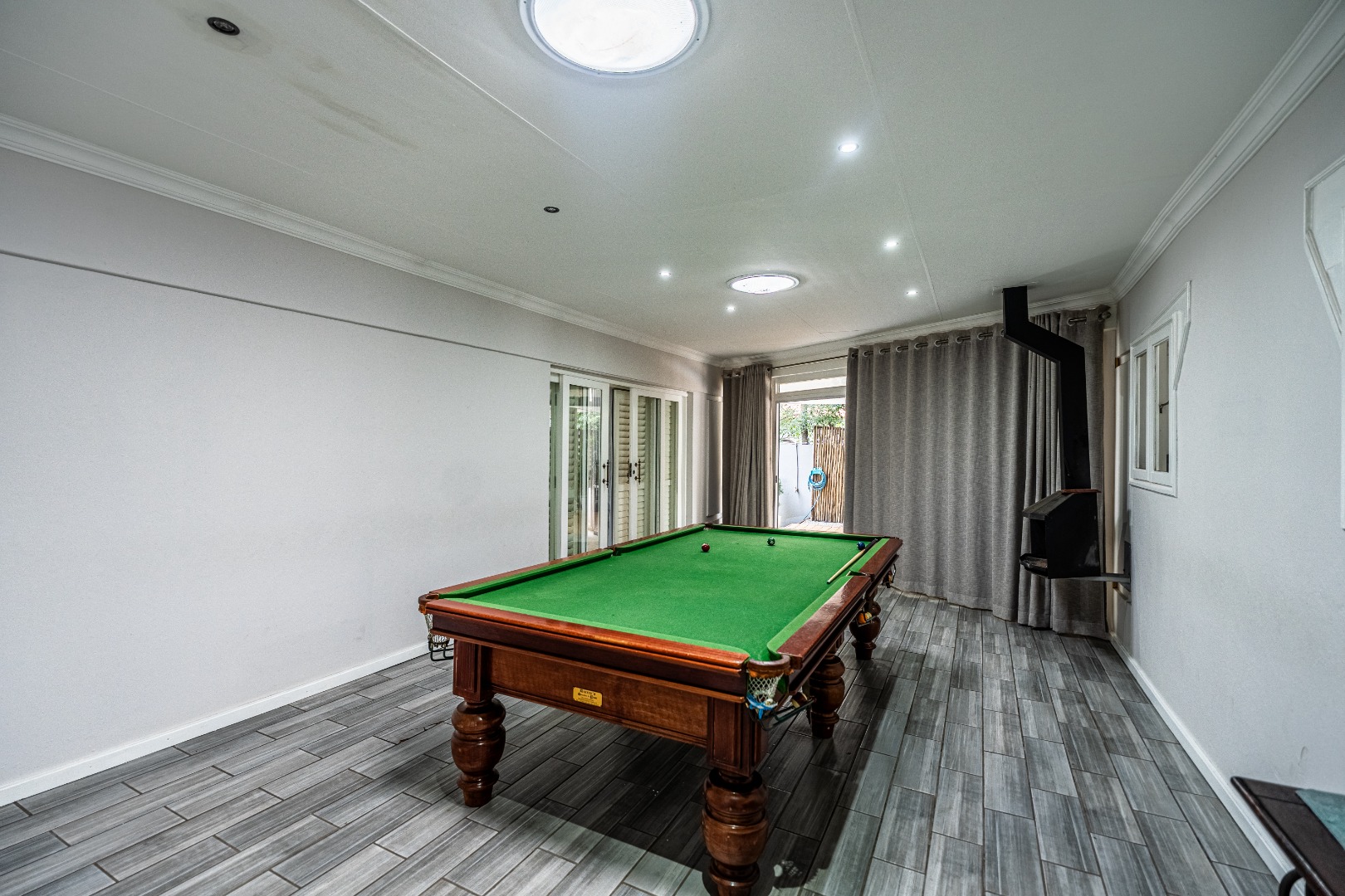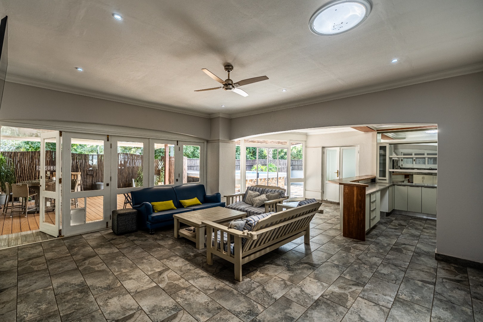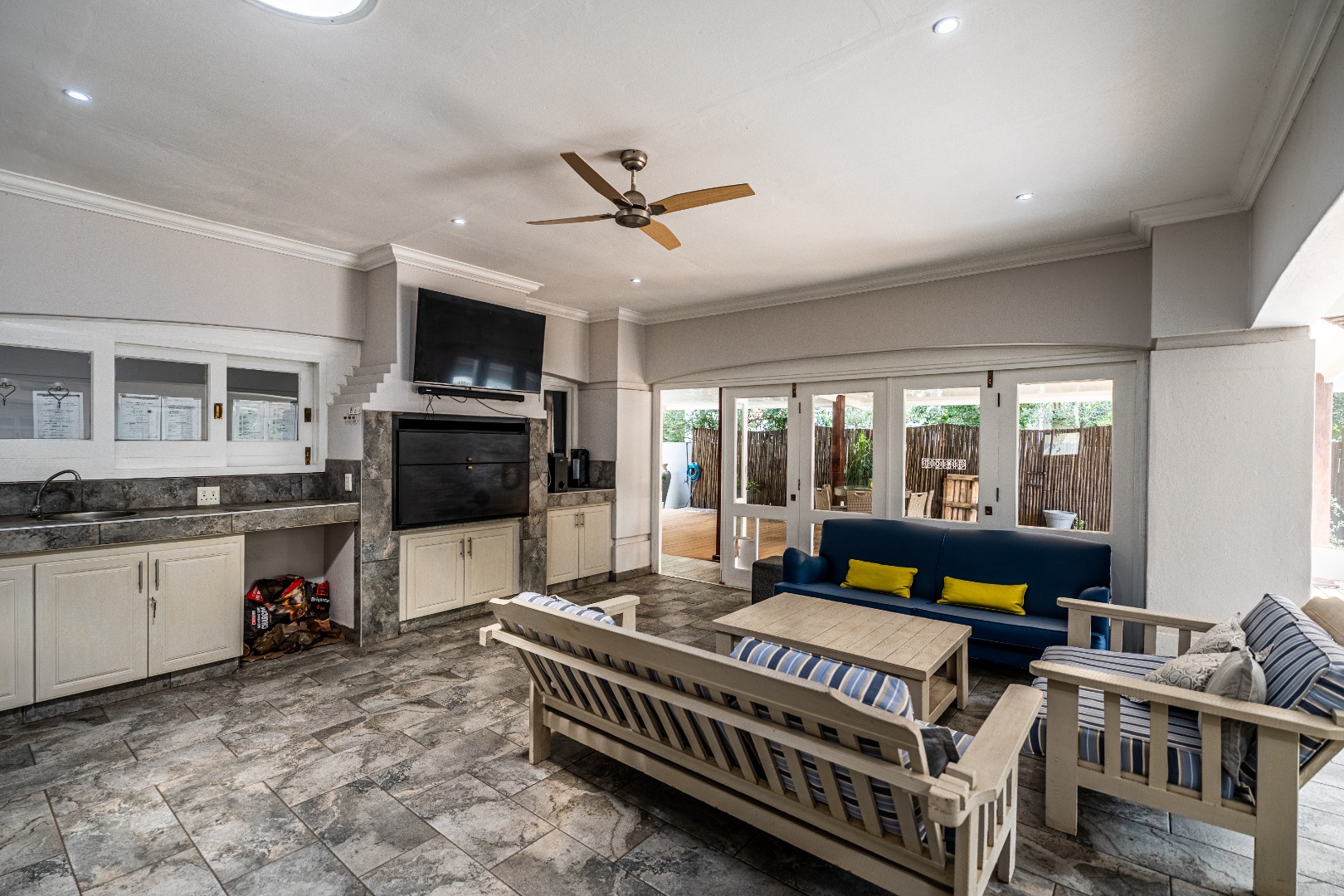 The grand entrance leads into an inviting open-plan living, dining, and entertainment area. Undercover patio, bar area with built-in bar and braai with sliding doors opening to pool area as well as additional private entertainment area with fireplace and outside boma.